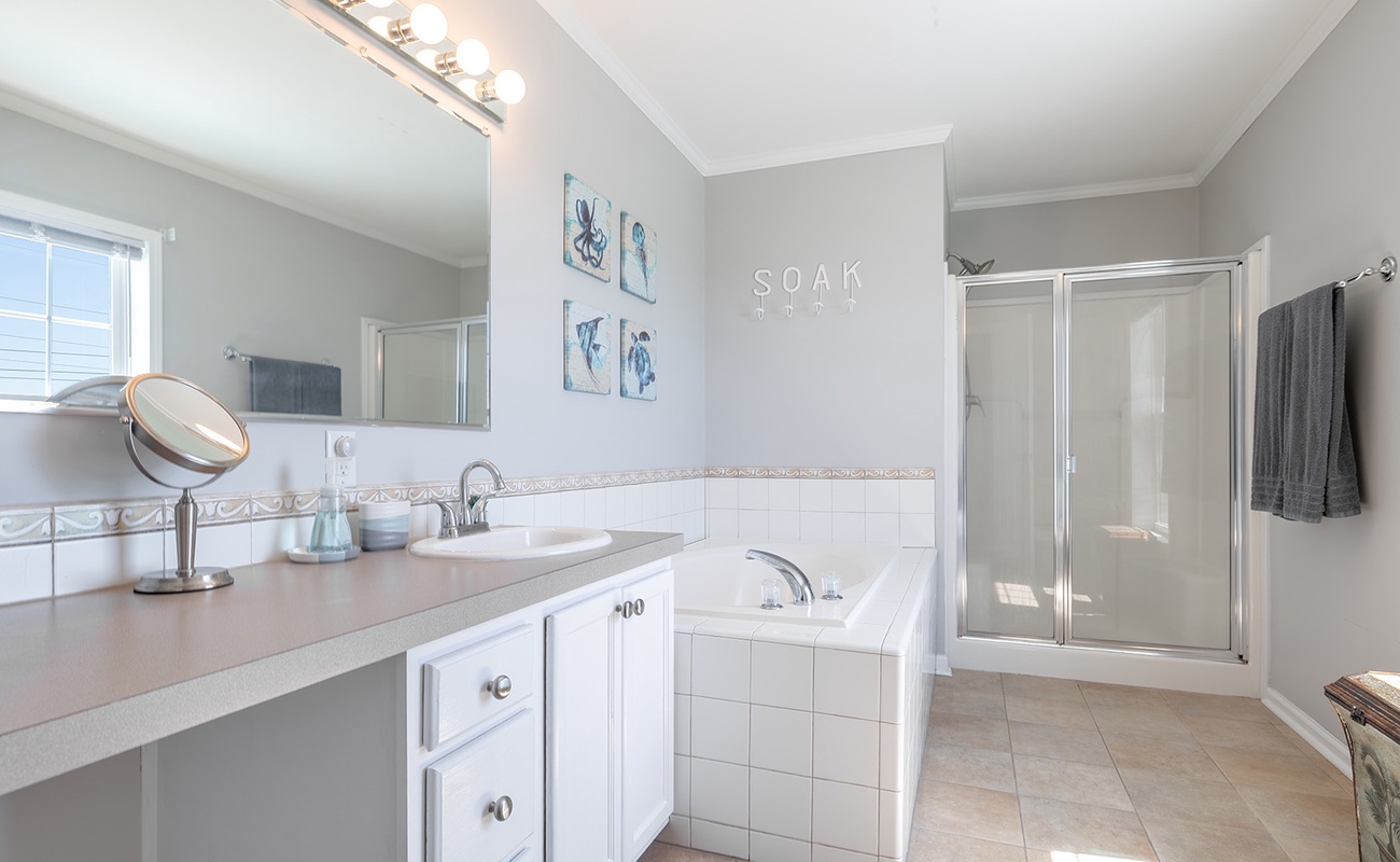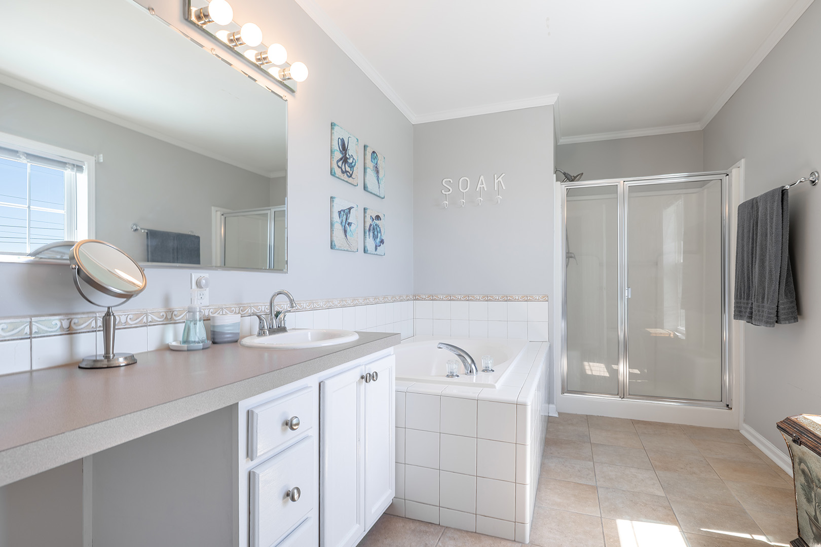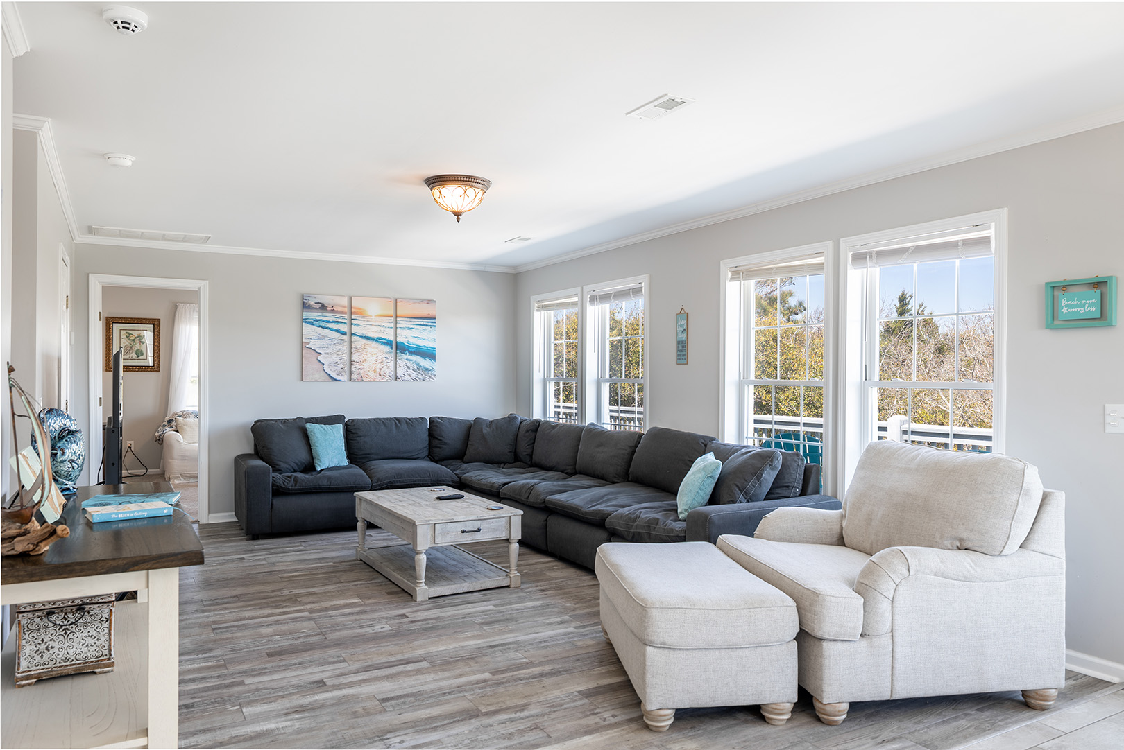 We stayed at Seas the Moment. It was the perfect location with spacious bedrooms and lots of seating in the living and dining rooms. We really enjoyed the hot tub and pool area. It was very peaceful and relaxing at night with the lights on around the pool and hot tub, absolutely beautiful. It was the first time we took our beagle on vacation with us, she loved the fenced in yard and so did we. We had a great Labor Day weekend. Thank you Bluewater realty!