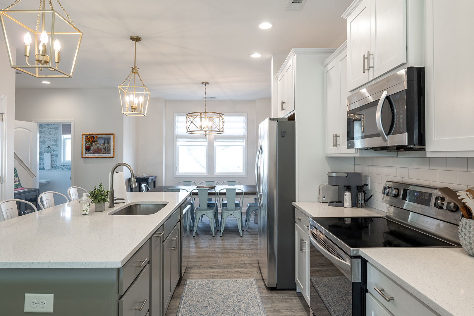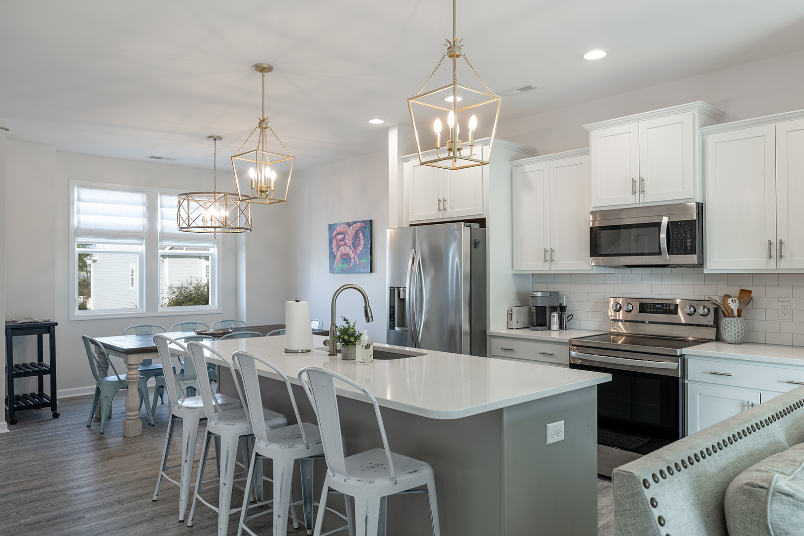 The living room offers comfortable seating that creates the perfect place to gather for conversation, enjoy movie nights, or simply unwind after a sun-filled day at the beach. High-speed wireless internet is available throughout the home, allowing you to stay connected while enjoying your coastal retreat. The dining area provides a welcoming space for family meals, puzzles, or friendly card games that carry on well into the evening - an ideal setting for sharing laughter and creating lasting vacation memories. The fully equipped kitchen features sleek stainless steel appliances and everything needed to prepare anything from quick beach snacks to full family dinners. Whether you prefer cooking at home or exploring the incredible local restaurants nearby, this space makes gathering together easy and enjoyable.