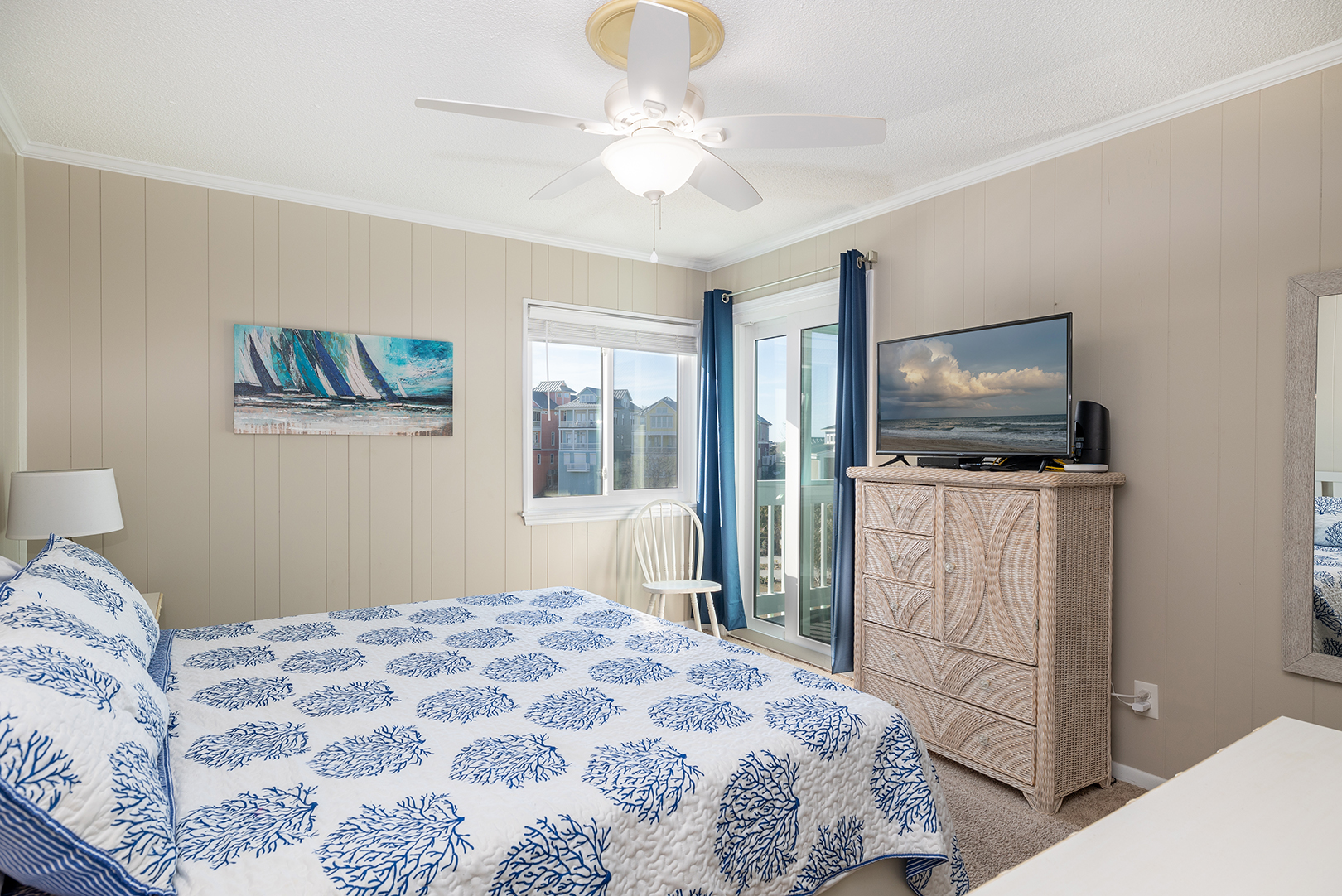 Bedroom #1 is a master bedroom with a king bed, a TV, private full bath and deck access.