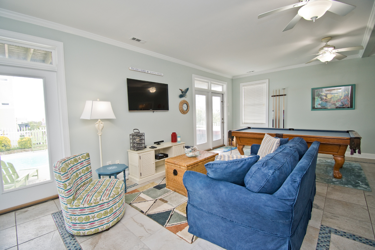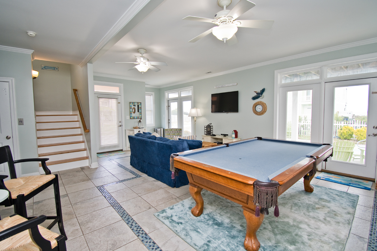 Ground Level: Gameroom with Pool Table, Flat Screen TV, gaming system featuring classic Nintendo games and a Double Sleeper Sofa.