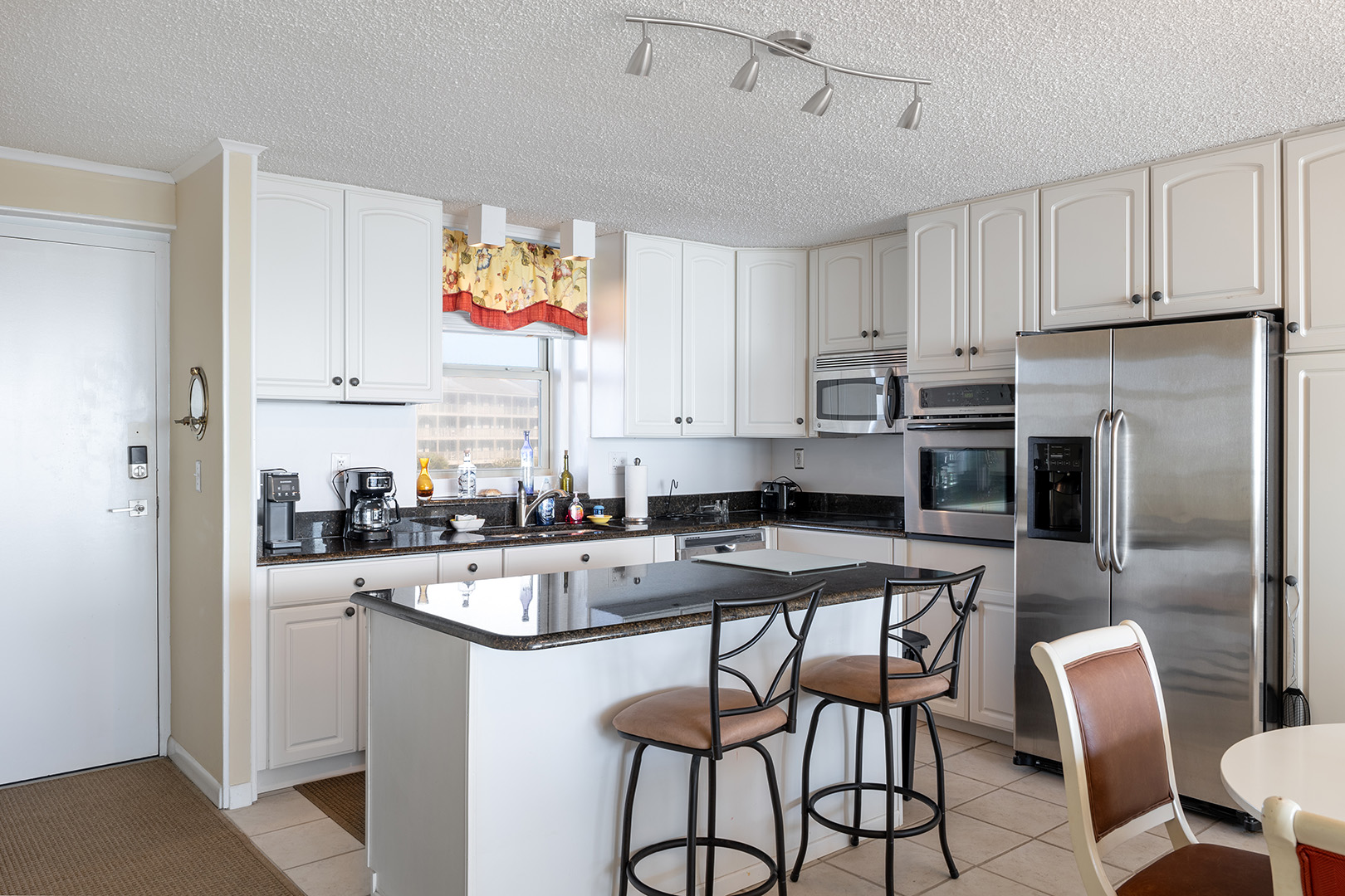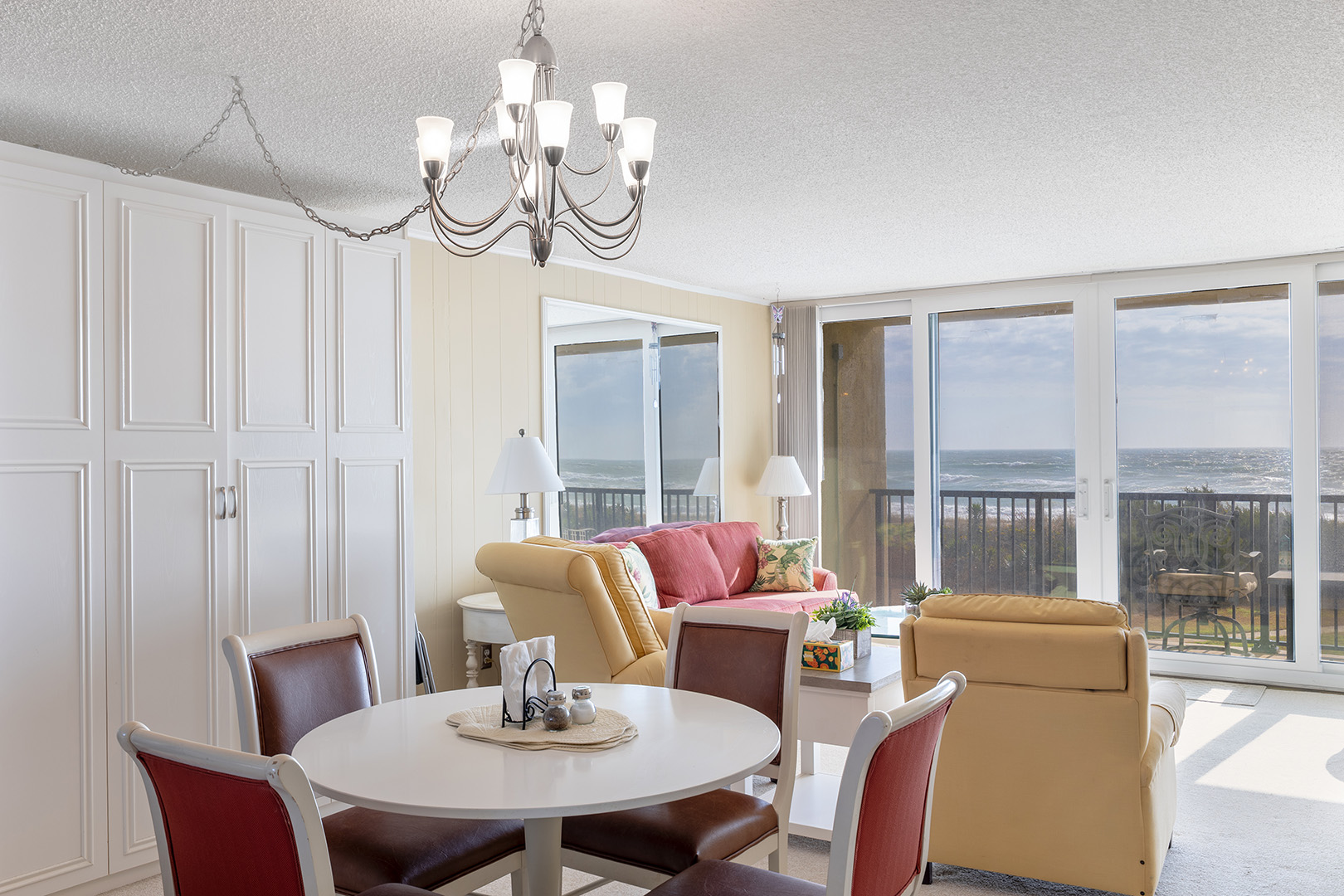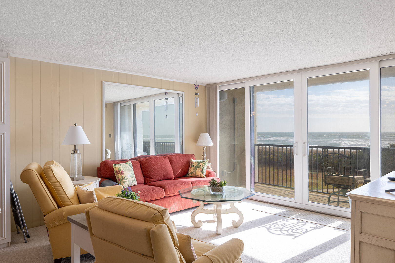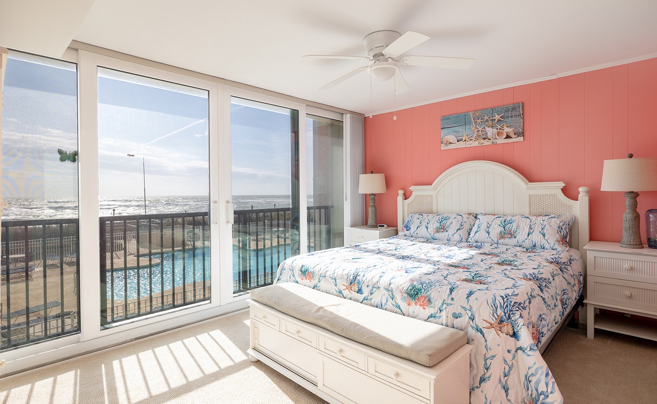 This 2nd Floor Oceanfront Condo offers 2 Bedrooms and 2 Baths. Bedroom #1 has a King Bed, Smart TV, Private en suite Full Bath, and access to the Balcony. Bedroom #2 has a Queen Bed, Roku TV, and access to the shared Full Bath. A Double Murphy Bed is located in the Living Area where you'll also enjoy comfortable seating, a Smart TV, and ocean views! Step out to the private balcony with furniture to enjoy the beachside sun, sea, and sounds!