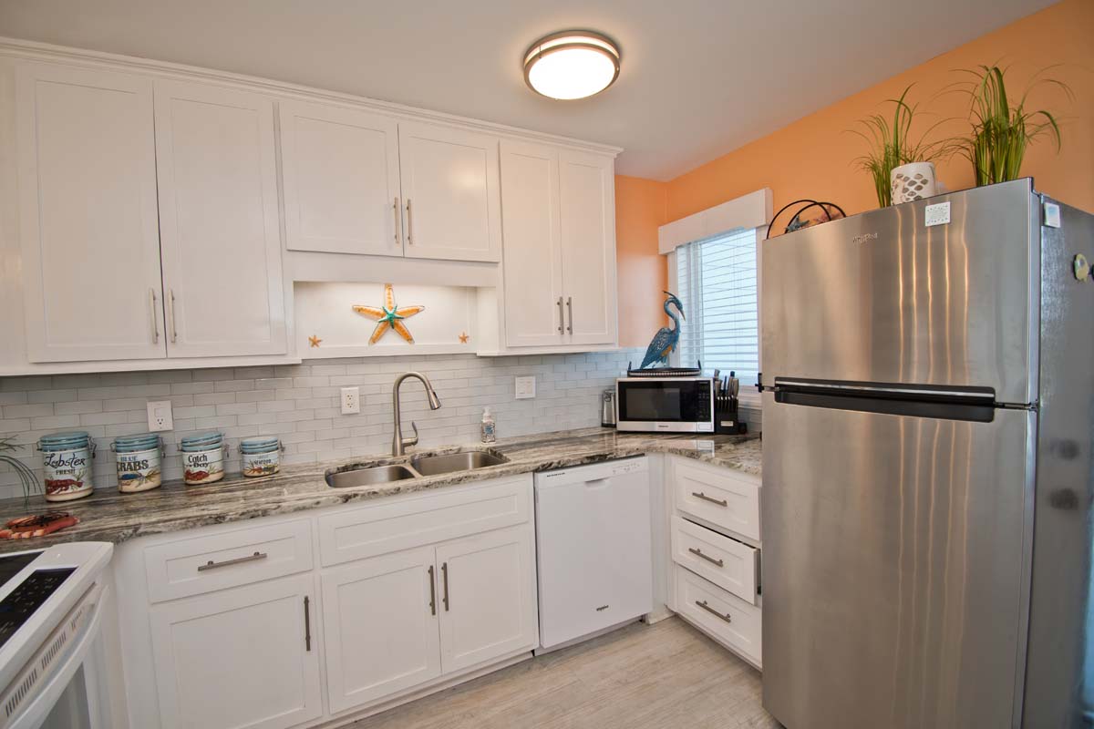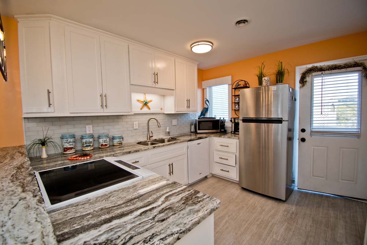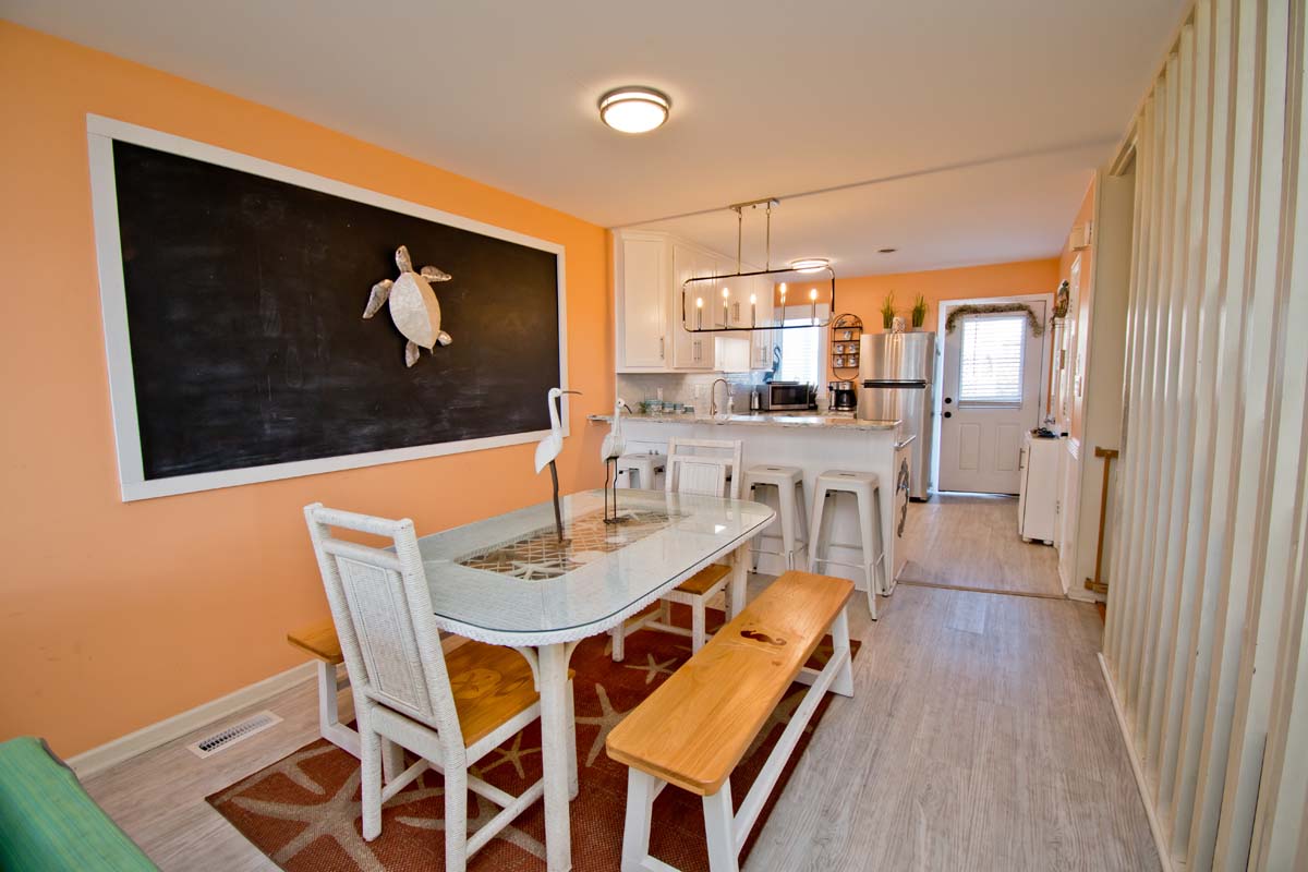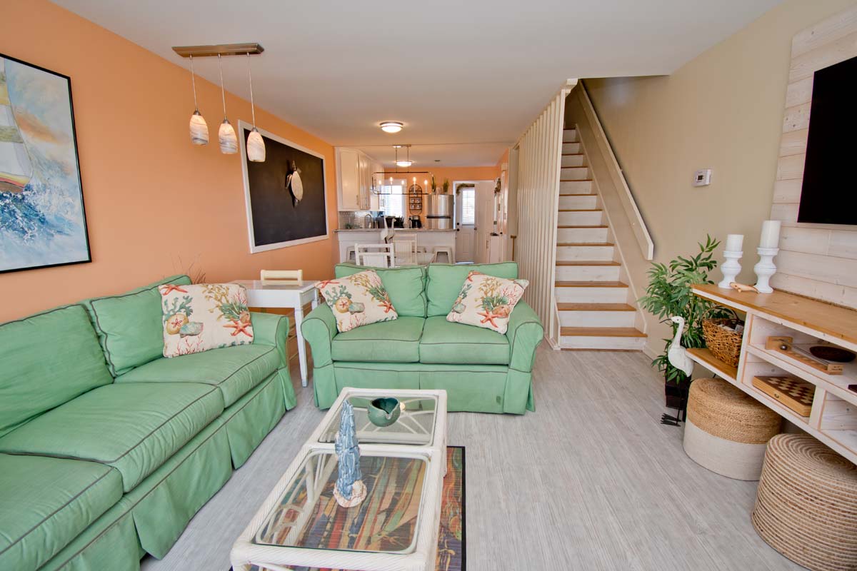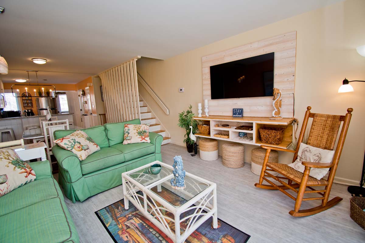 Level One: Living Area with Flat Screen TV, Kitchen with French Door Refrigerator, dishwasher & microwave. Dining Area. Half Bath.