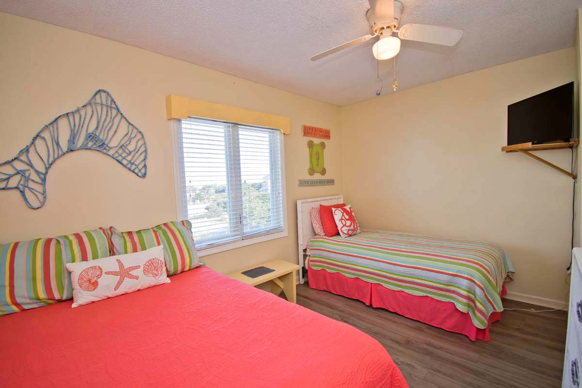 Level Two: Bedroom #3 with King Bed, direct access to the outdoor deck and Flat screen TV. Bedroom #4 with Double Bed, Twin Bed and Flat Screen TV. Shared Full Bath.