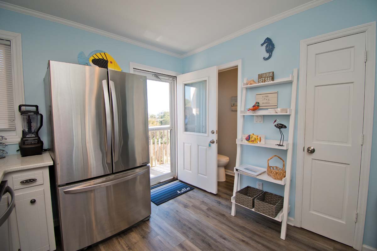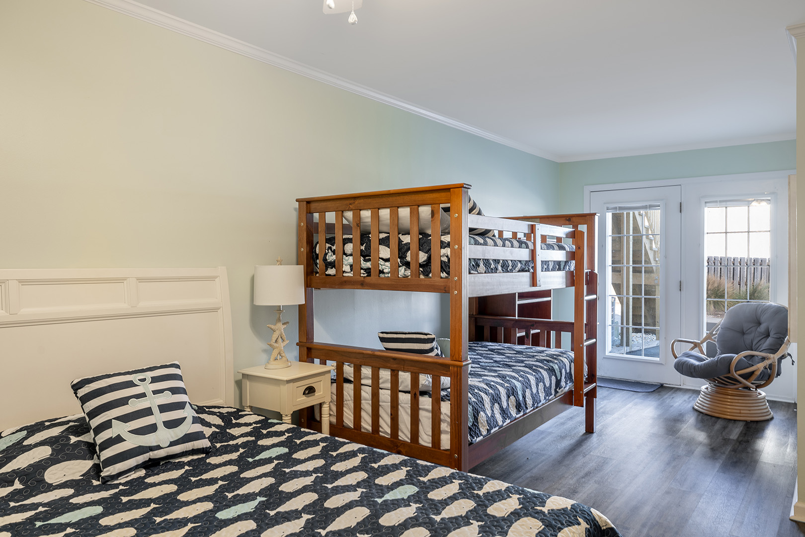 Ground Level includes Bedroom #1 with a Queen bed, TV, and private patio with access to the beach. Bedroom #2 with a Double bed and Twin Bunk bed, TV, and laundry area. Shared full bath this level.