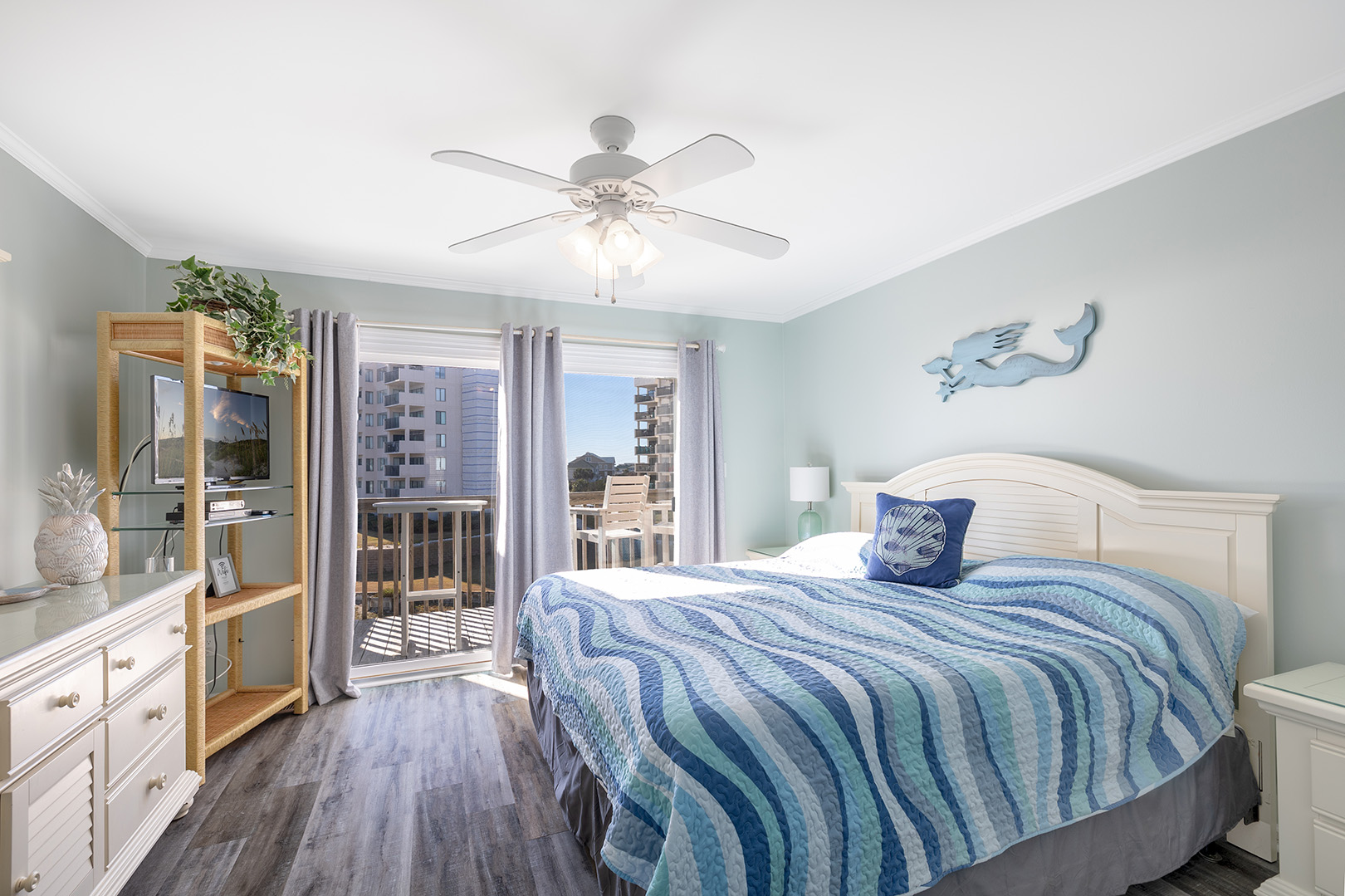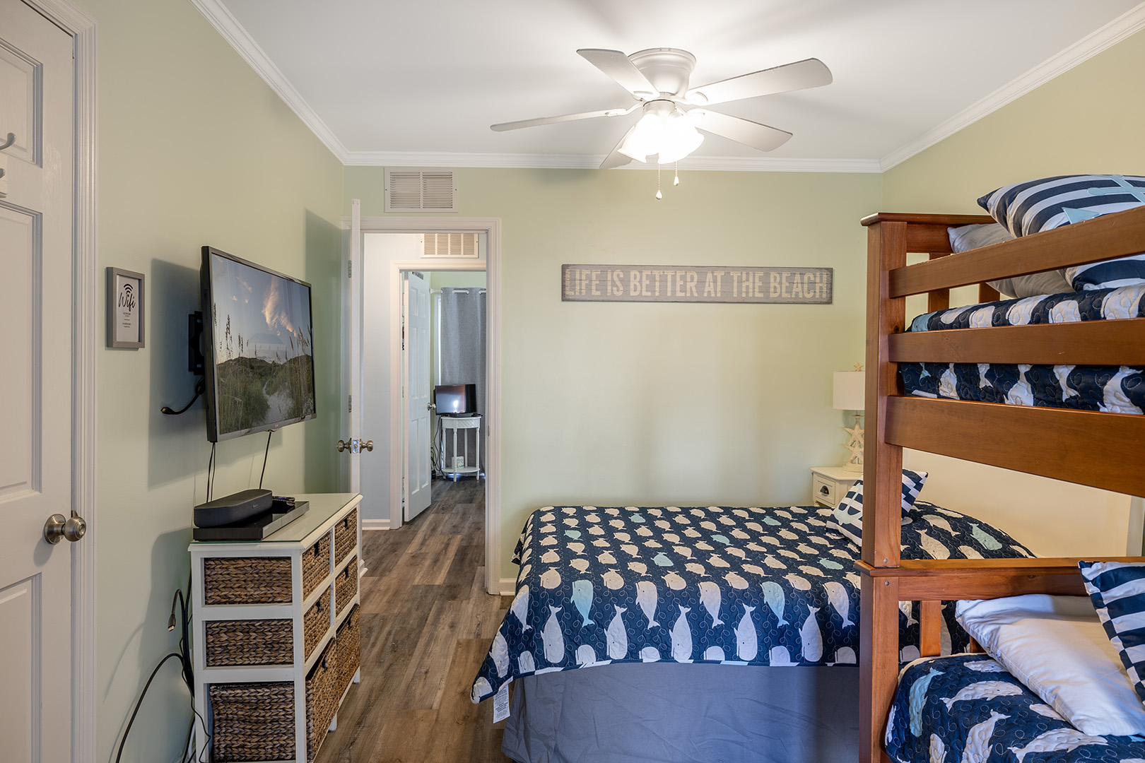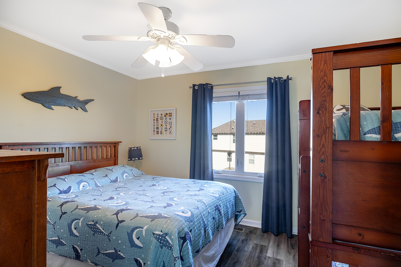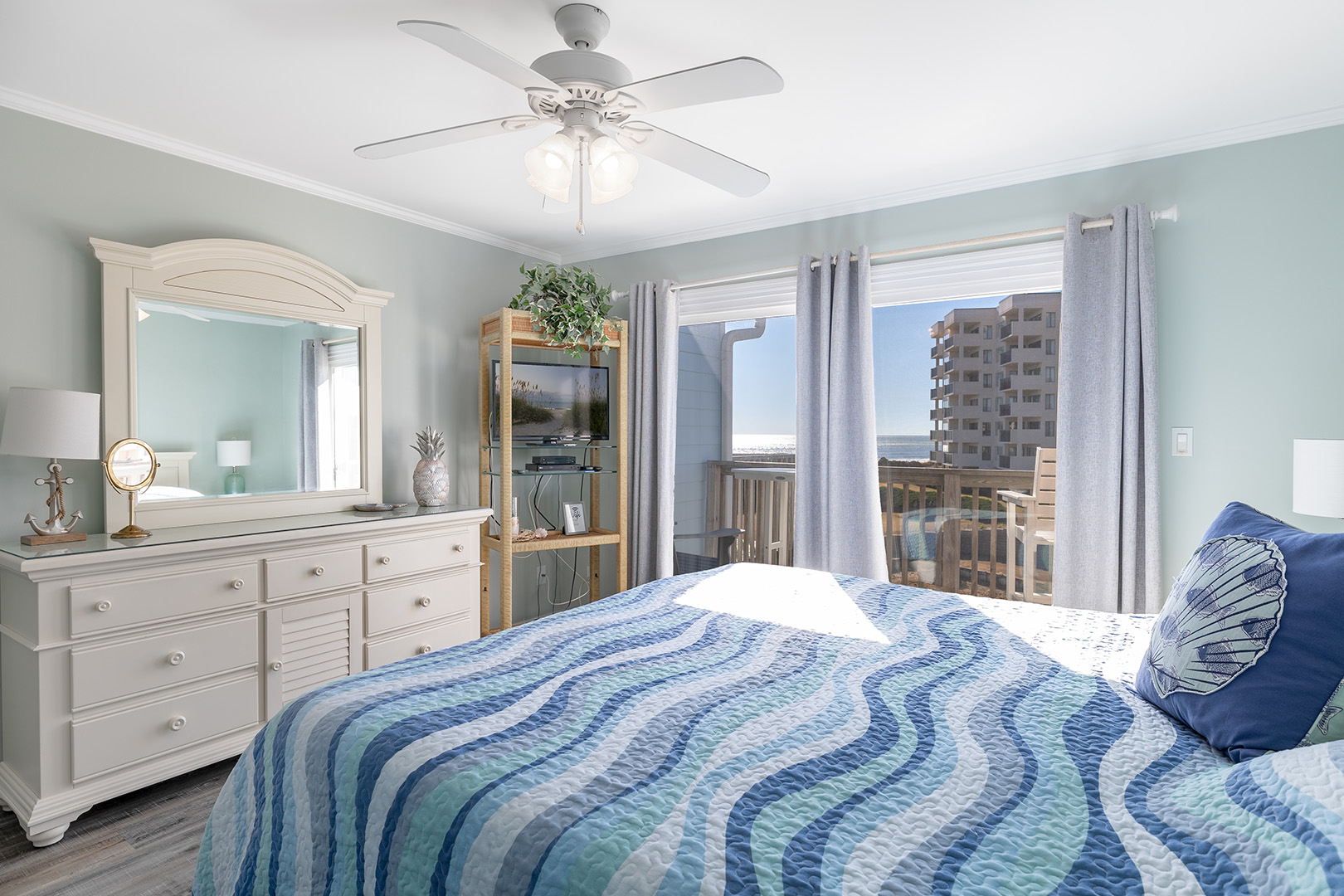 Level 2 includes Bedroom #3 with a King bed, TV, and private deck with furniture and ocean views! Bedroom #4 with a Queen bed & Twin bunk bed with TV. Shared full bath this level.