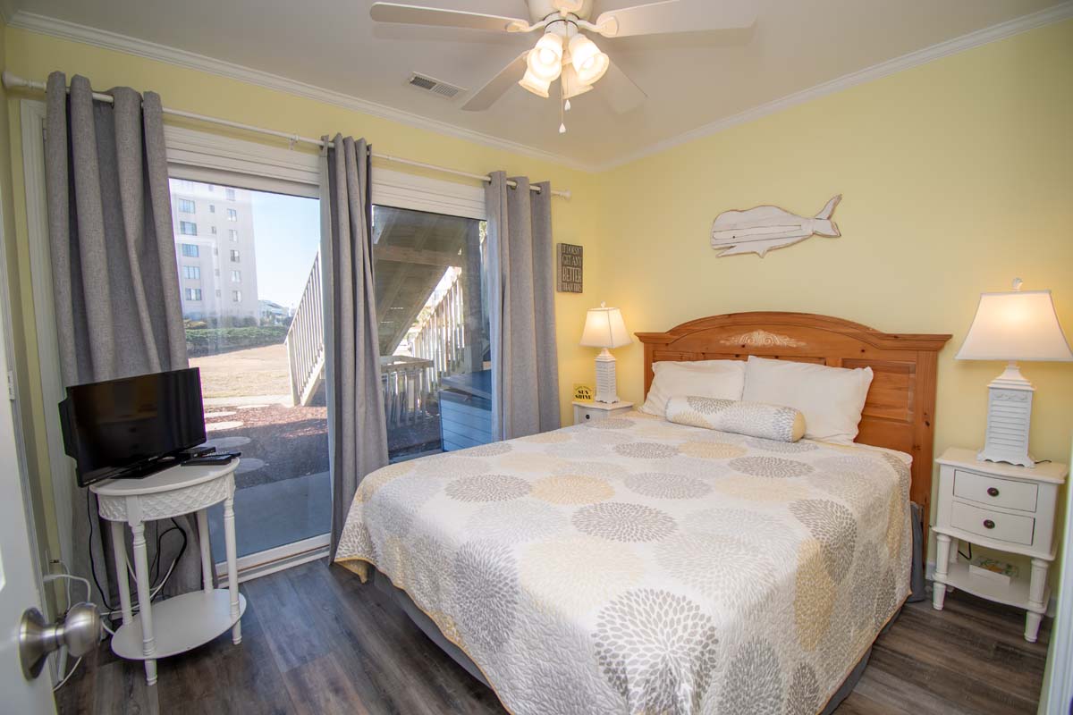 Ground Level - Bedroom #2 Queen Bed, TV, Deck Access |