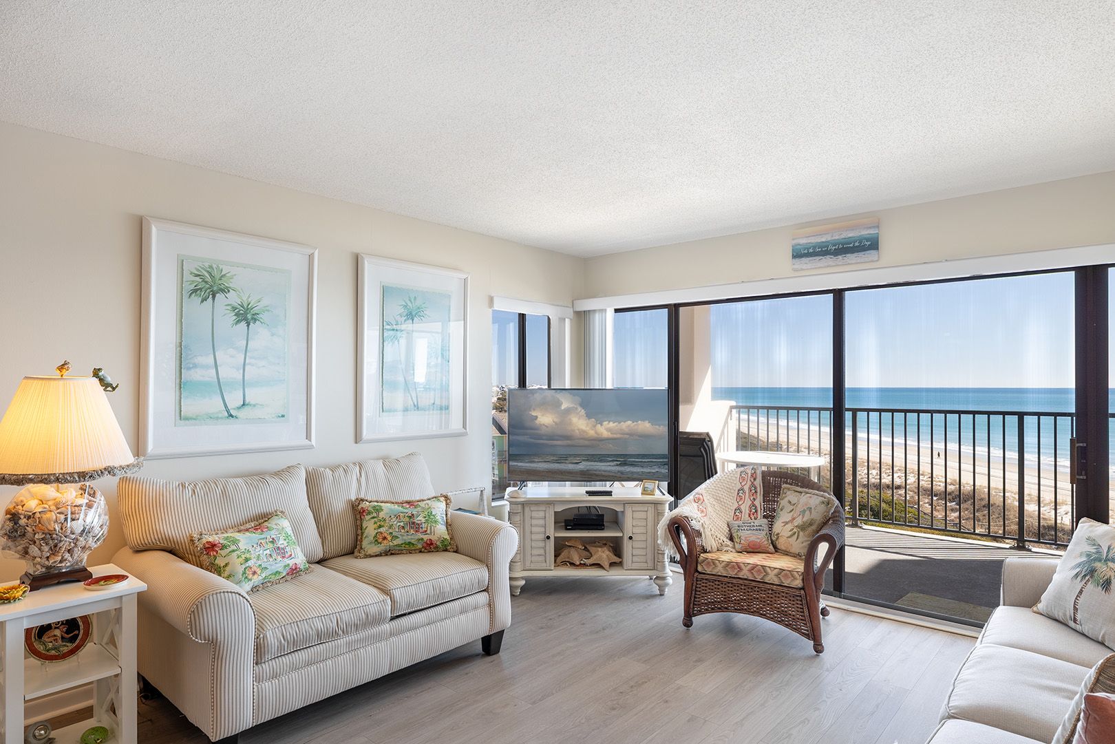 Sound of the Sea West 402 is a fourth-floor oceanfront retreat offering the perfect blend of comfort, views, and location. This well appointed 2-bedroom, 2-bath condo sits directly on the shoreline, delivering fabulous, unobstructed views of the pristine Atlantic. Start your mornings watching the sun rise over the water and wind down your evenings with glowing sunsets! Whether you’re relaxing in the living area or enjoying the fresh sea air from the covered oceanfront deck, complete with comfortable deck furniture, you will surely enjoy marvelous views of the pristine ocean.
