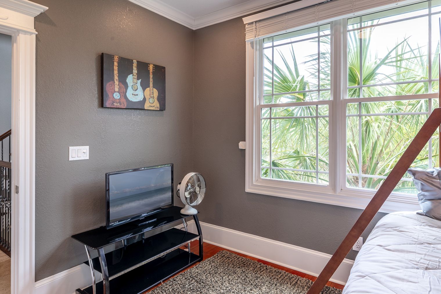 Level Three:Â Loft area with Queen bed, Smart Roku TV, ceiling fan.