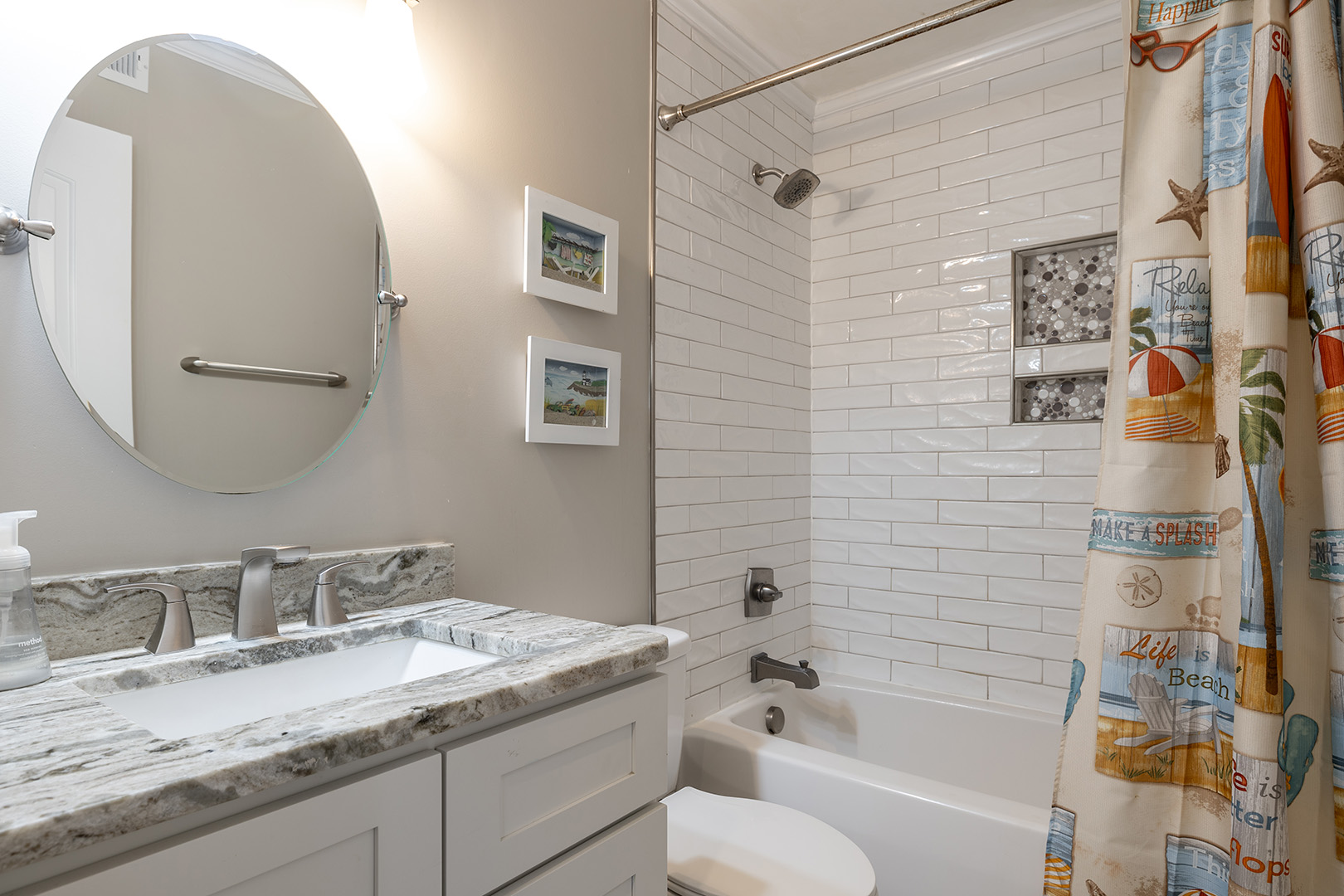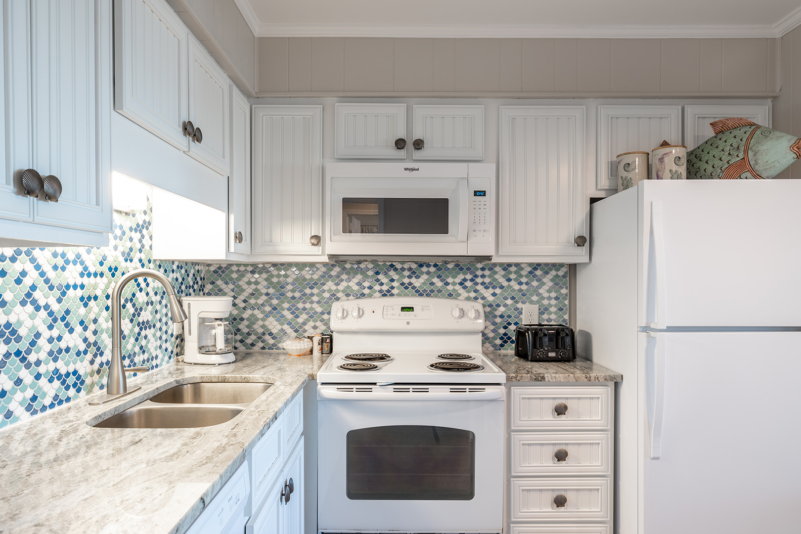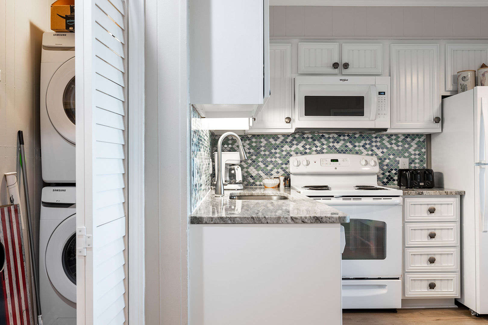 The kitchen comes fully-equipped with a refrigerator with attached ice maker, microwave, oven, dishwasher, toaster, blender, coffee maker, and Keurig coffee maker to make home cooked meals and your morning coffee easy and accessible to you and your party throughout your stay.