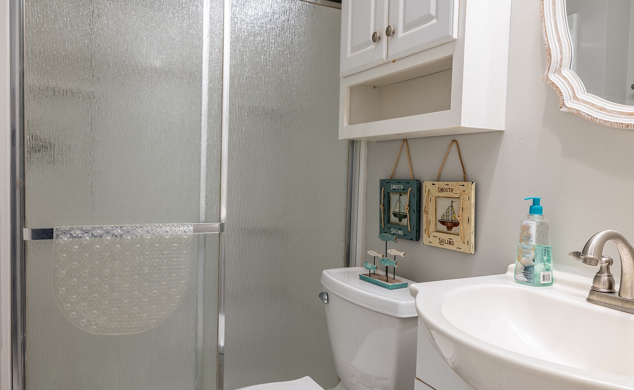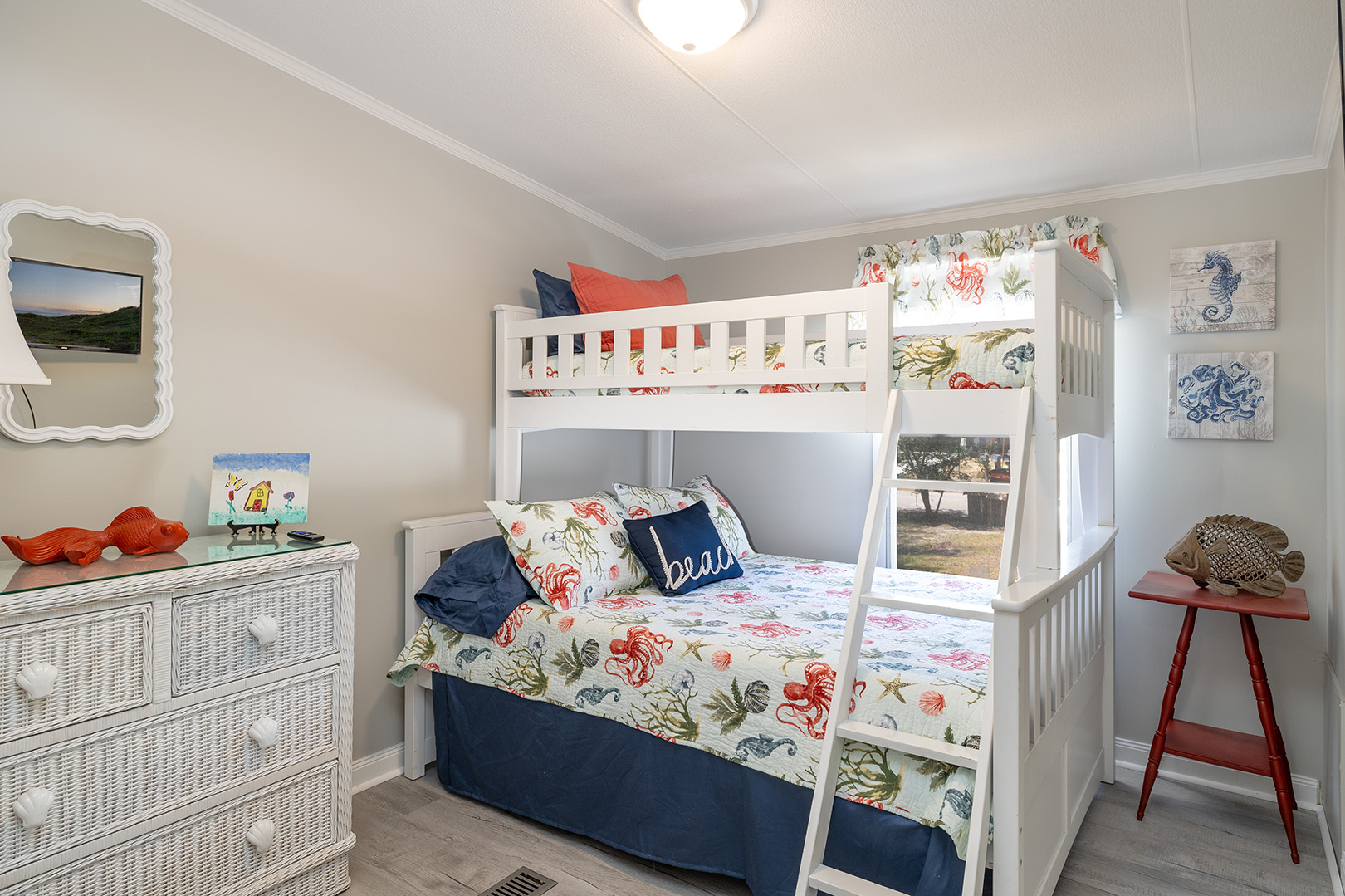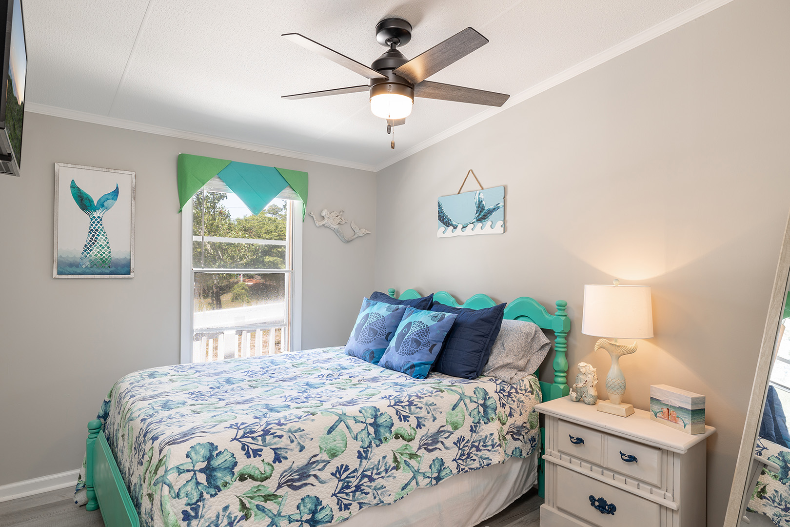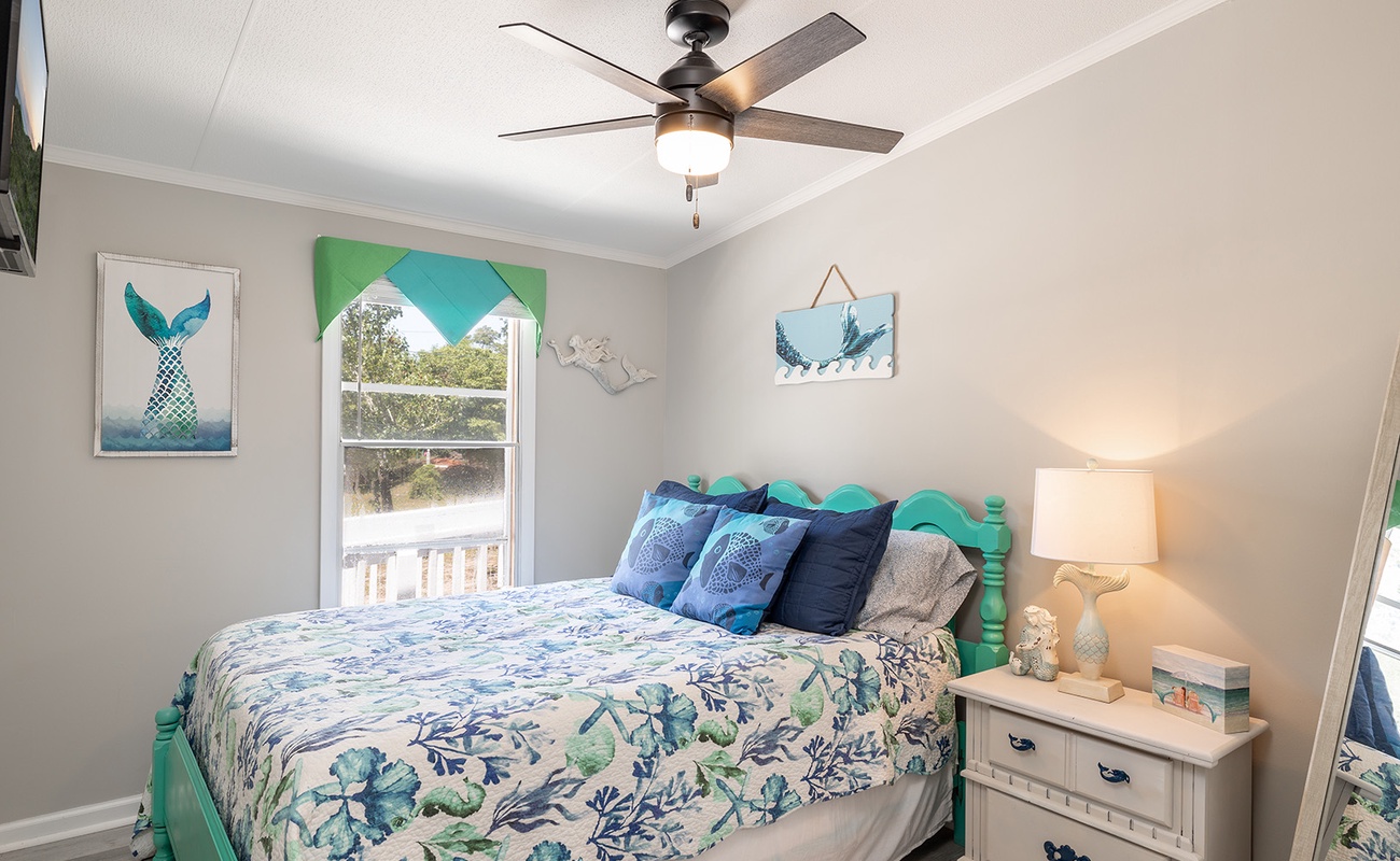 Bedroom #1 is a Master Bedroom with Queen bed, Smart TV, and private en suite bath with separate tub and walk-in shower. Bedroom #2 provides a Double bed, Smart TV, and mermaid theme. Bedroom #3 offers a Twin over Double Bunk Bed and Smart TV. A shared full hall bath is also provided.