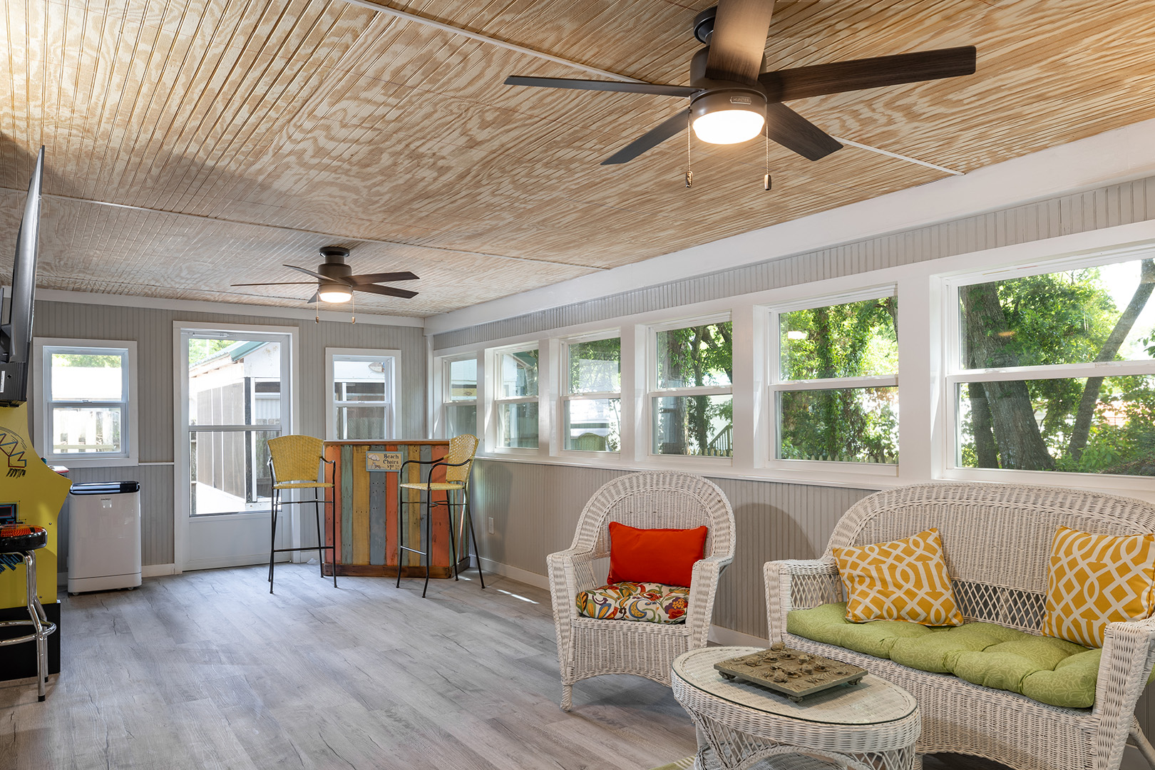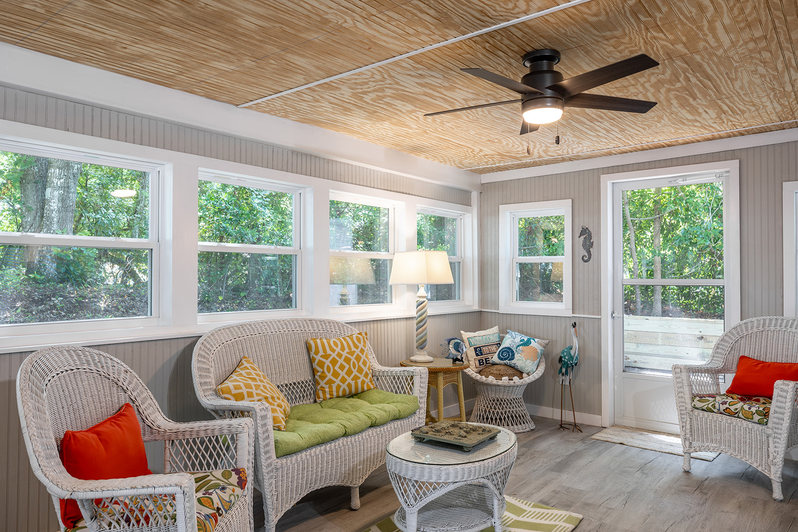The Sun Room is an exterior room with a portable air conditioner that is designed to heat and cool the space. However, it is not expected to keep the room comfortable in extreme temperatures.
