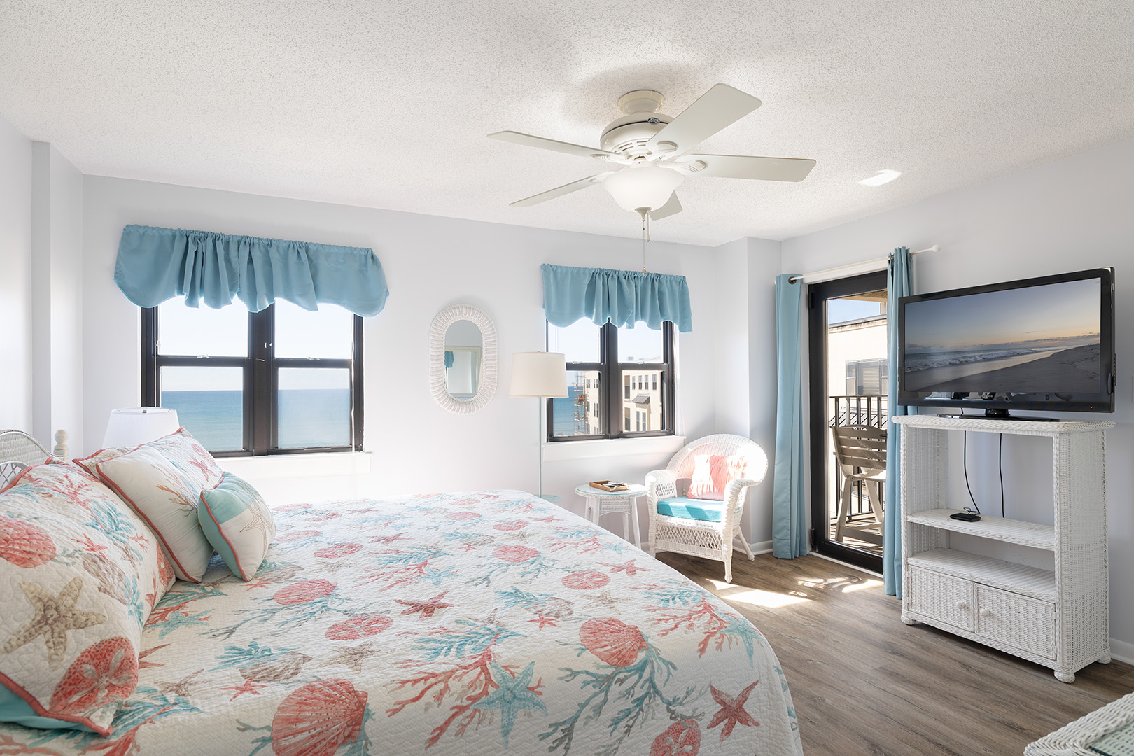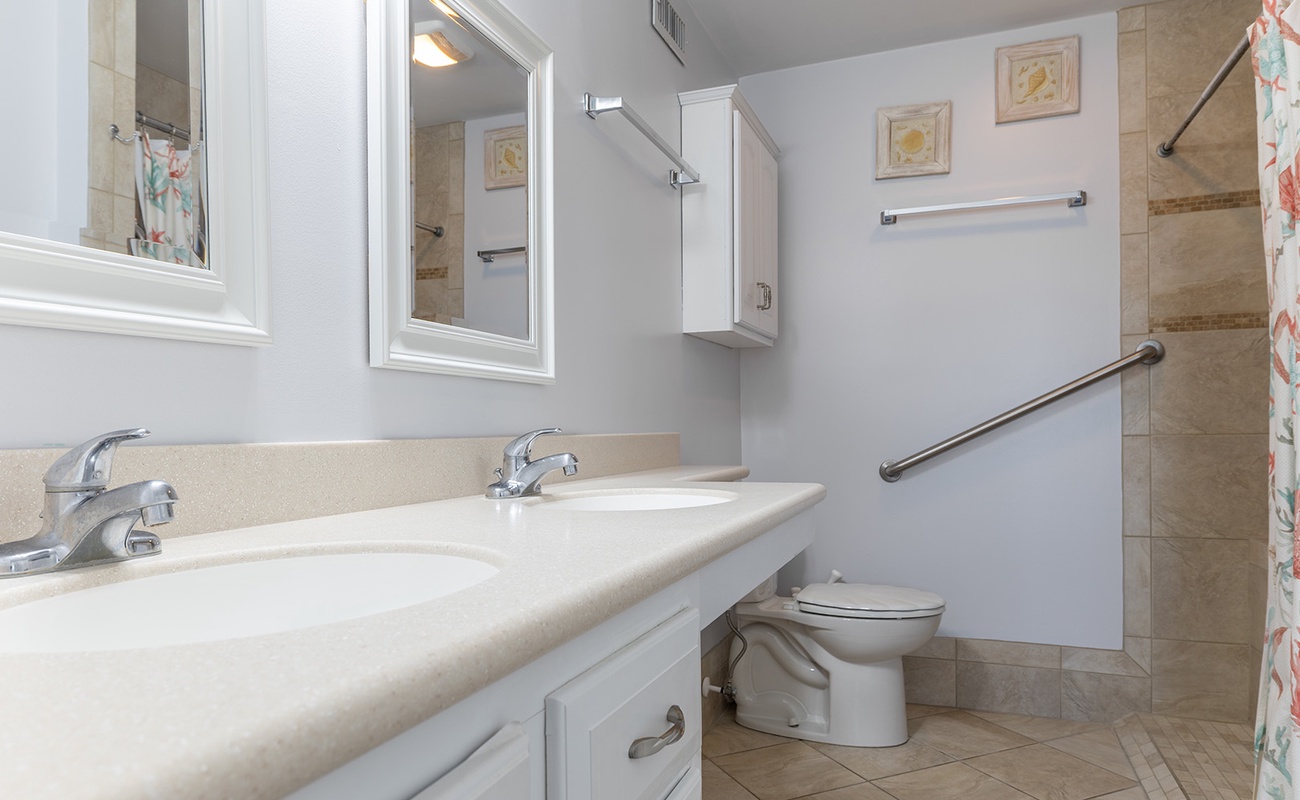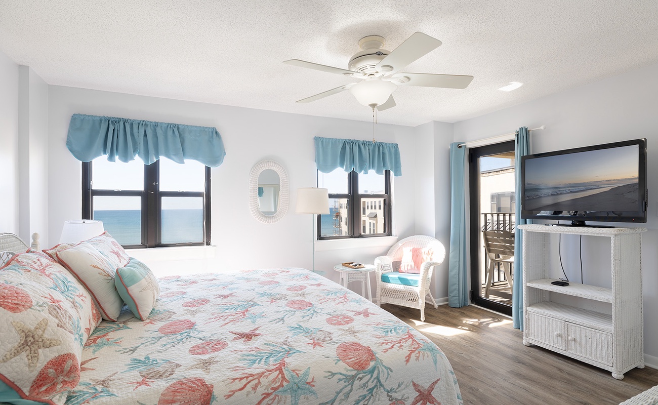 Master Bedroom: King bed, private wheelchair accessible full bath, Smart TV, ocean views, direct access to deck.