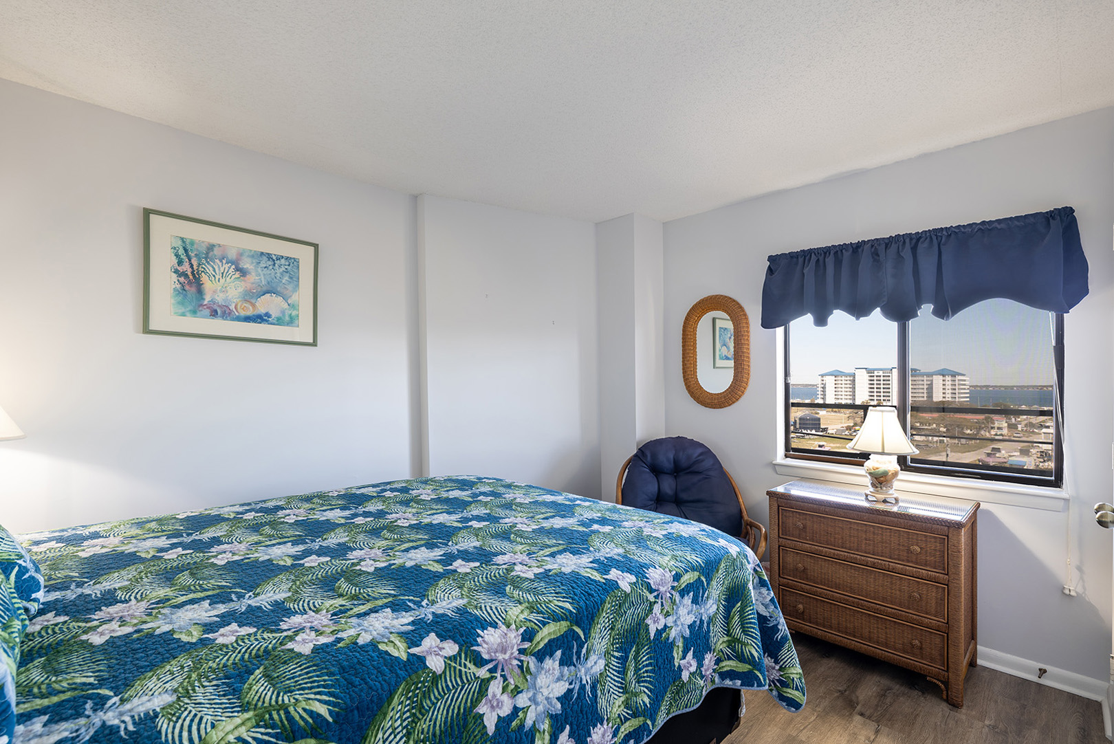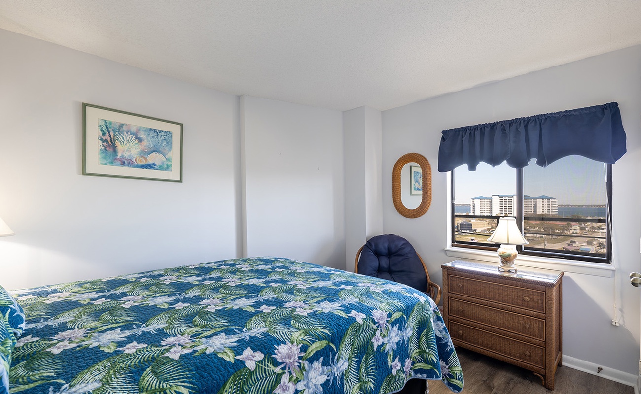 Bedroom #2: Queen bed, shared bath, Smart TV, sound views.