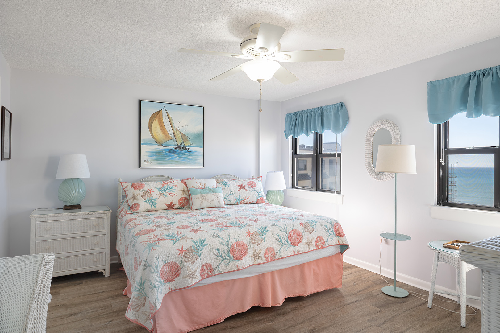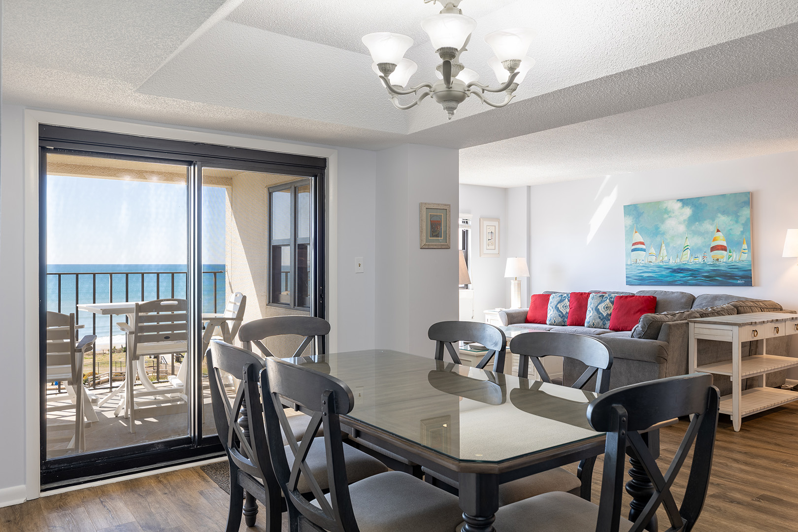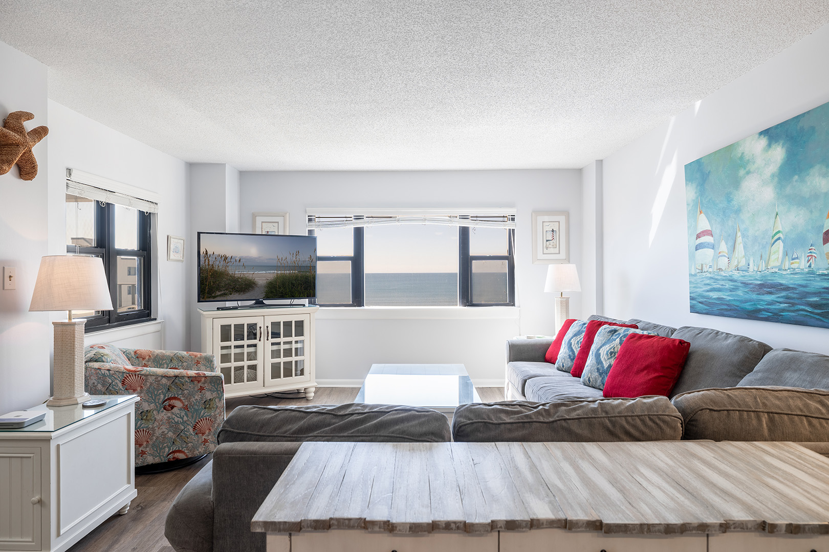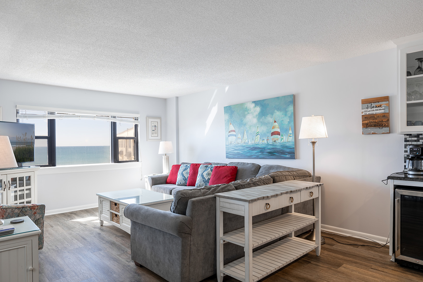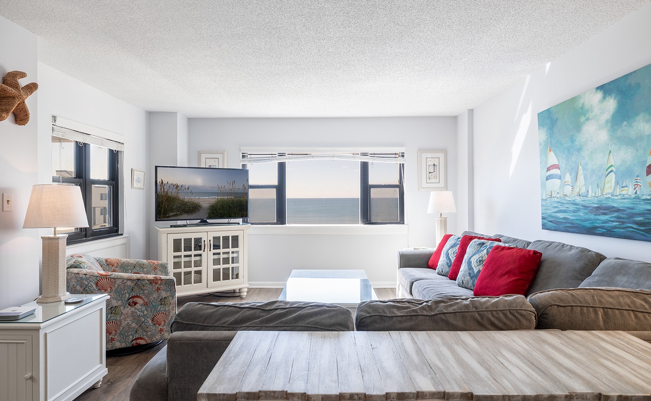 Summer Winds A-512 is a beautifully appointed 5th floor 3 bedroom, 2 bathroom, oceanfront condo with gorgeous Atlantic Ocean and Bogue Sound views. It has been recently updated and has an open concept living area with great beachy vibes. Enjoy relaxing in the living room watching the pelicans fly by as the dolphins play in the surf below. While the master bedroom has amazing oceanfront views the second and 3rd bedrooms enjoy stunning sound views that can’t be beat.