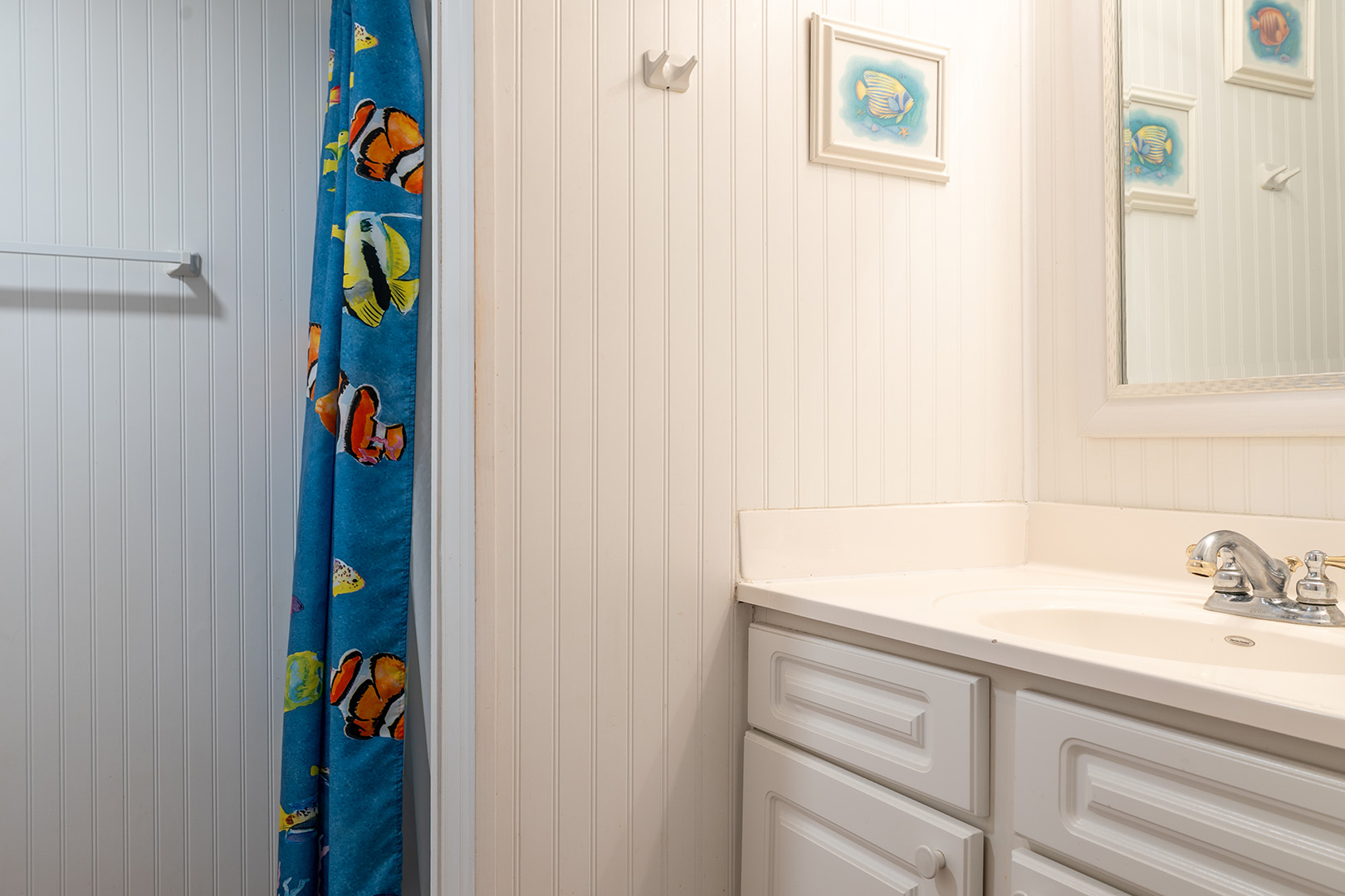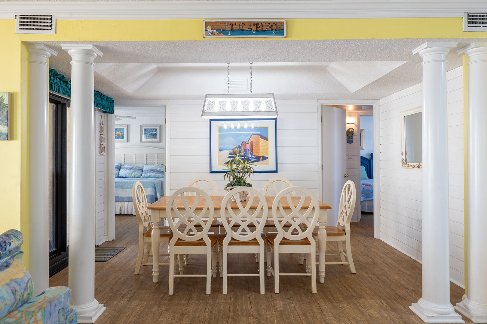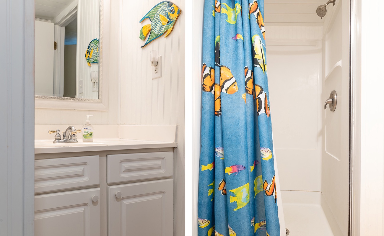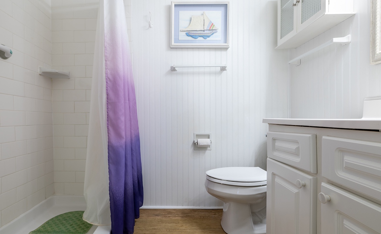 Bedroom #1 offers a King bed, cable TV, private en suite full bath, and access to the deck. Bedroom #2 offers a Queen bed, cable TV, and access to the Shared Full Bath. Bedroom #3 offers 2 Twin Beds and cable TV, and access to the Shared Full Bath.
