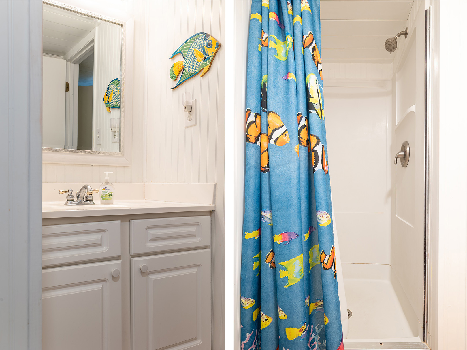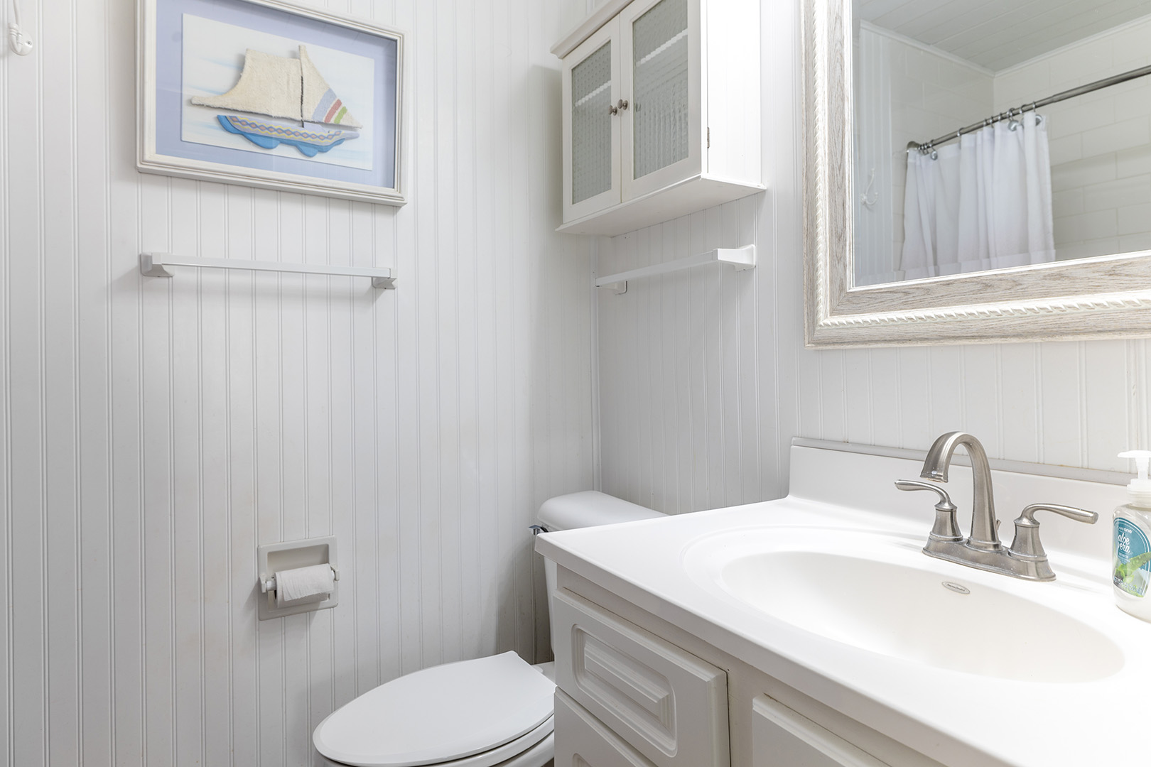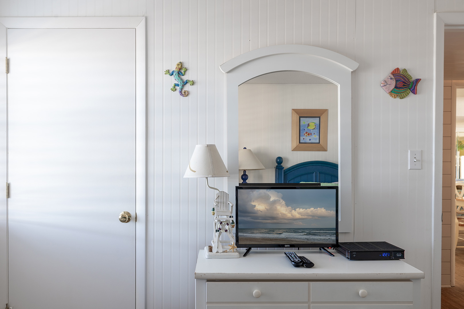 Bedroom #1 offers a King bed, cable TV, private en suite full bath, and access to the deck. Bedroom #2 offers a Queen bed, cable TV, and access to the Shared Full Bath. Bedroom #3 offers 2 Twin Beds and cable TV, and access to the Shared Full Bath.