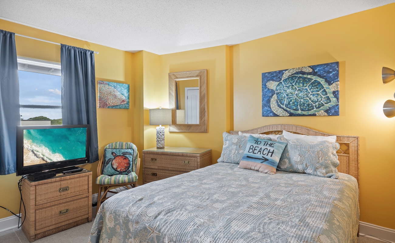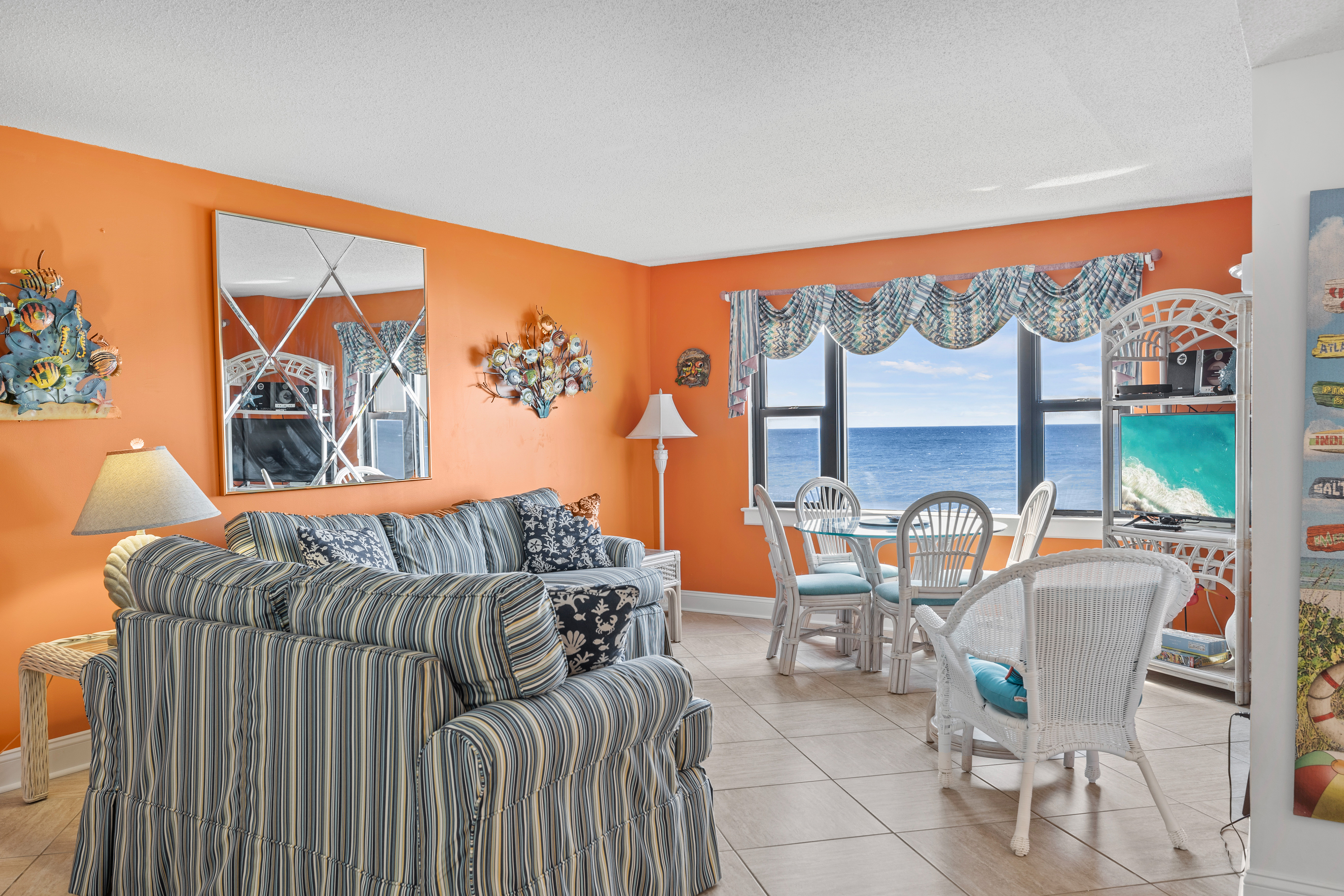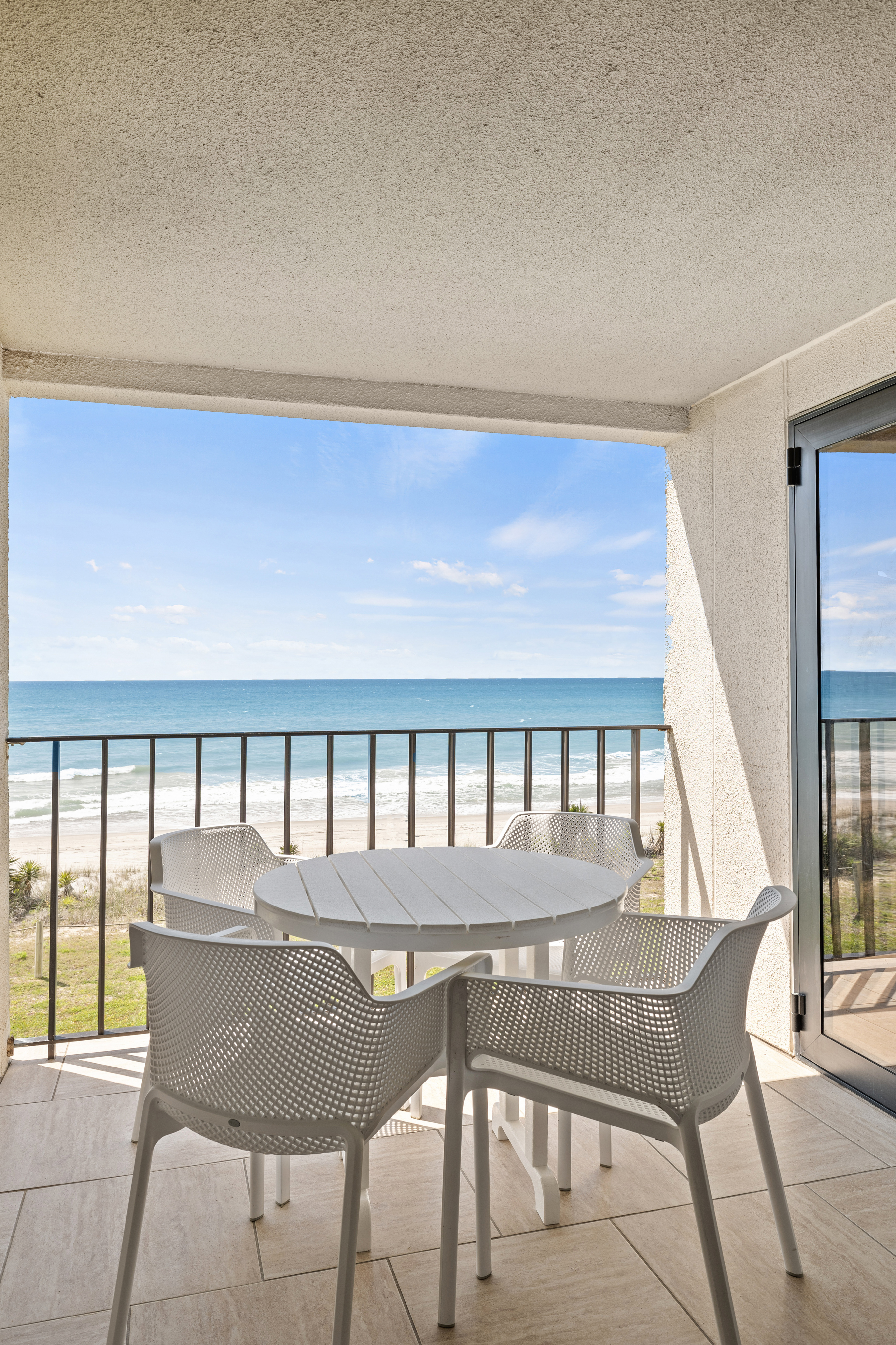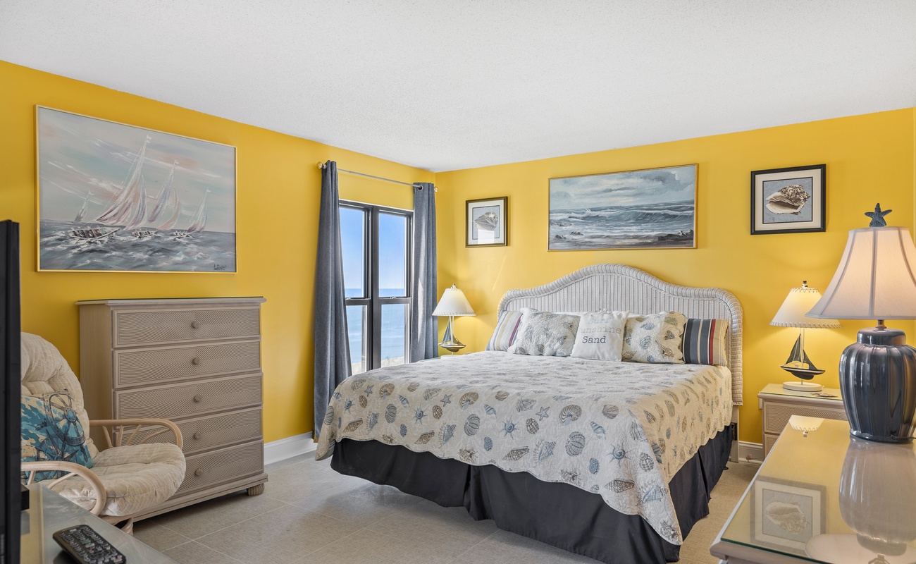 Summer Winds 221 is a beautifully decorated Direct Oceanfront Condo with tile floors throughout and great ocean views from many places within the condo. The Living Area has lots of seating, Flat Screen HD TV, and direct access to the covered deck with amazing views of the glistening Atlantic Ocean. Large Dining Area has seating for 6, with additional seating available in the Living Room and Kitchen Bar. The Kitchen and Bar combo is equipped with a microwave & dishwasher and a Keurig coffee maker, with seating and plenty of counter space. Master Bedroom #1 has King Bed, Full bath & private deck access. Bedroom #2 has a Queen Bed. Bedroom #3 has 2 Twins. Bedrooms 2 & 3 share a bath.