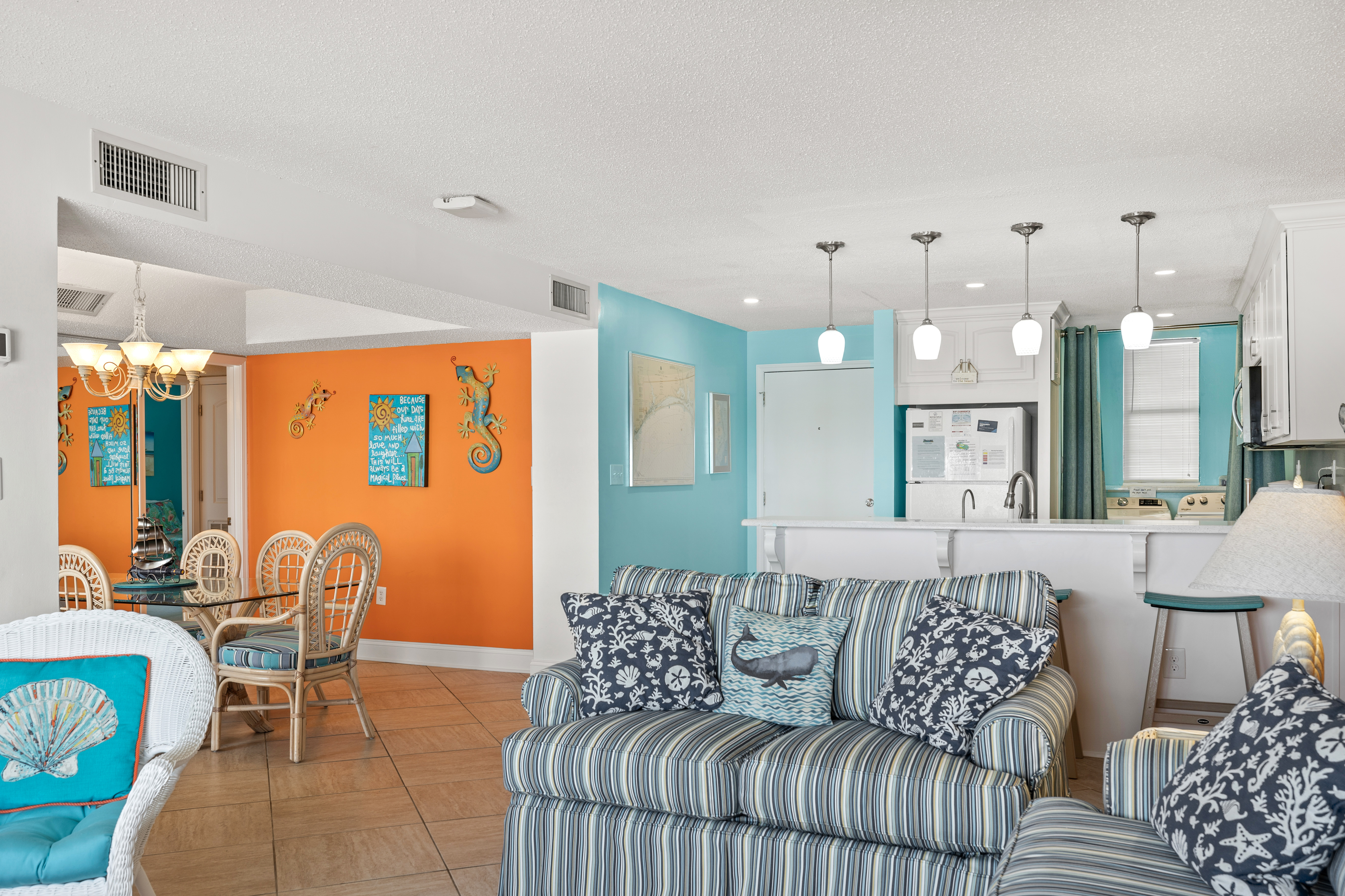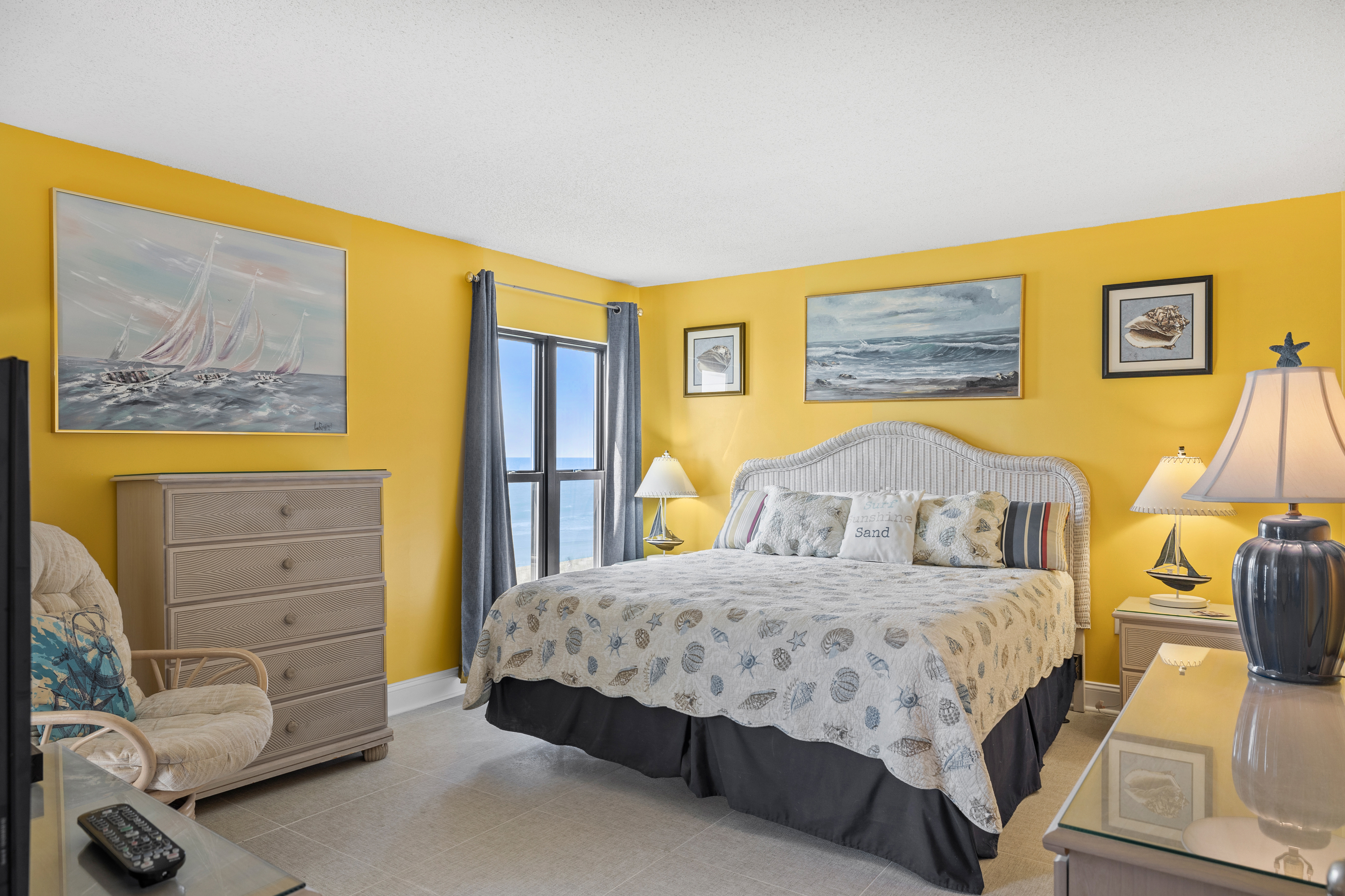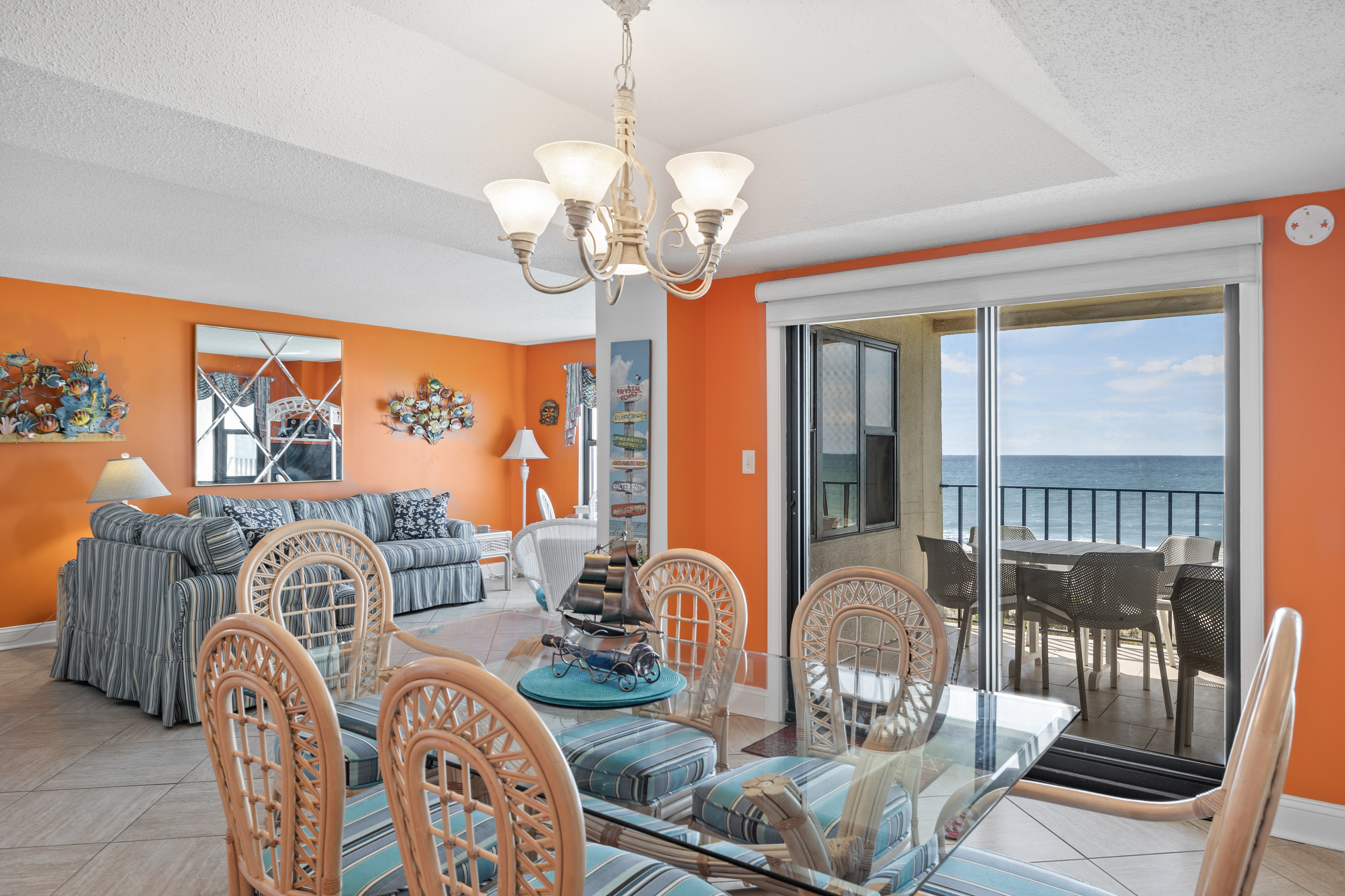 Summer Winds 221 is a beautifully decorated Direct Oceanfront Condo with tile floors throughout and great ocean views from many places within the condo. The Living Area has lots of seating, Flat Screen HD TV, and direct access to the covered deck with amazing views of the glistening Atlantic Ocean. Large Dining Area has seating for 6, with additional seating available in the Living Room and Kitchen Bar. The Kitchen and Bar combo is equipped with a microwave & dishwasher and a Keurig coffee maker, with seating and plenty of counter space. Master Bedroom #1 has King Bed, Full bath & private deck access. Bedroom #2 has a Queen Bed. Bedroom #3 has 2 Twins. Bedrooms 2 & 3 share a bath.