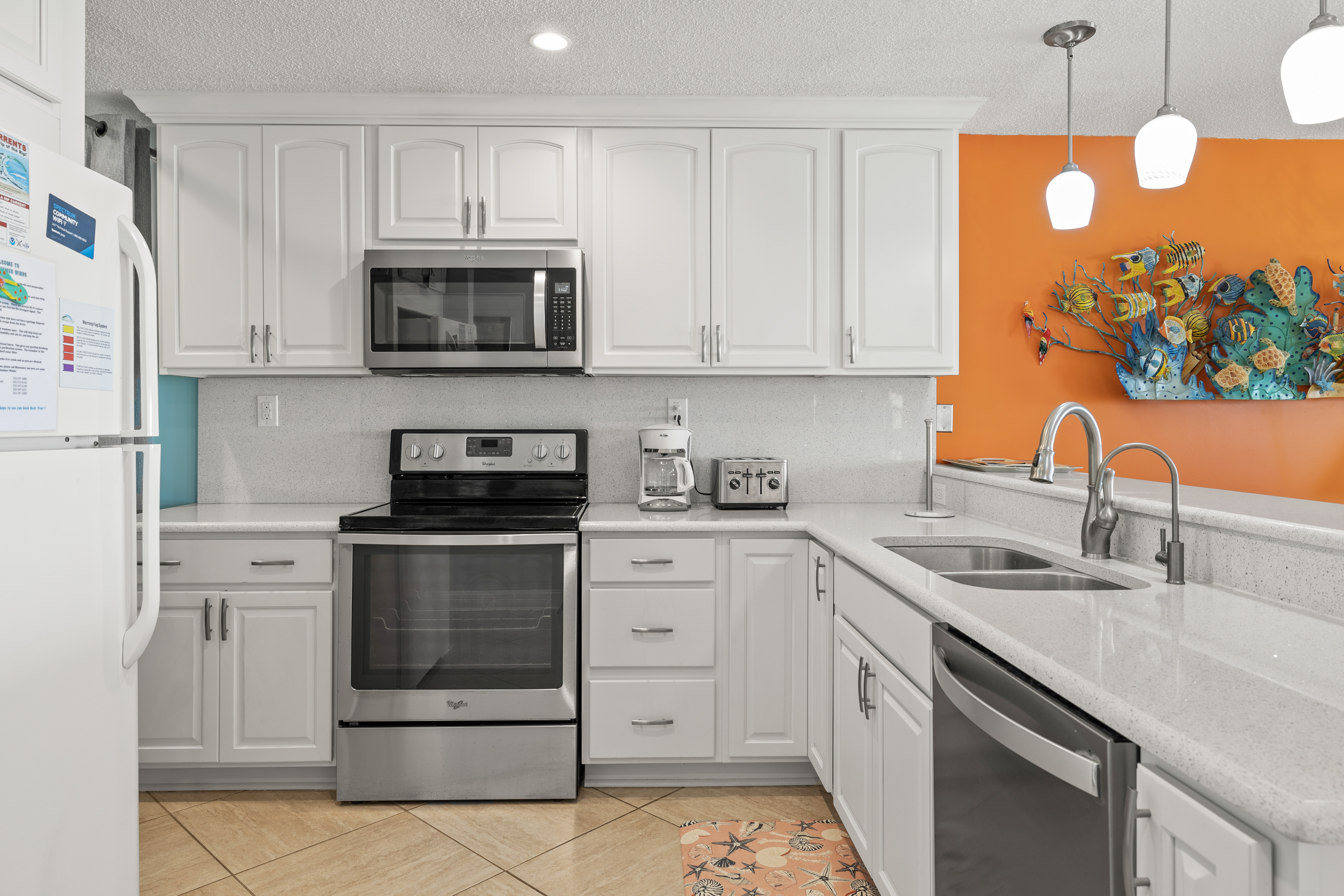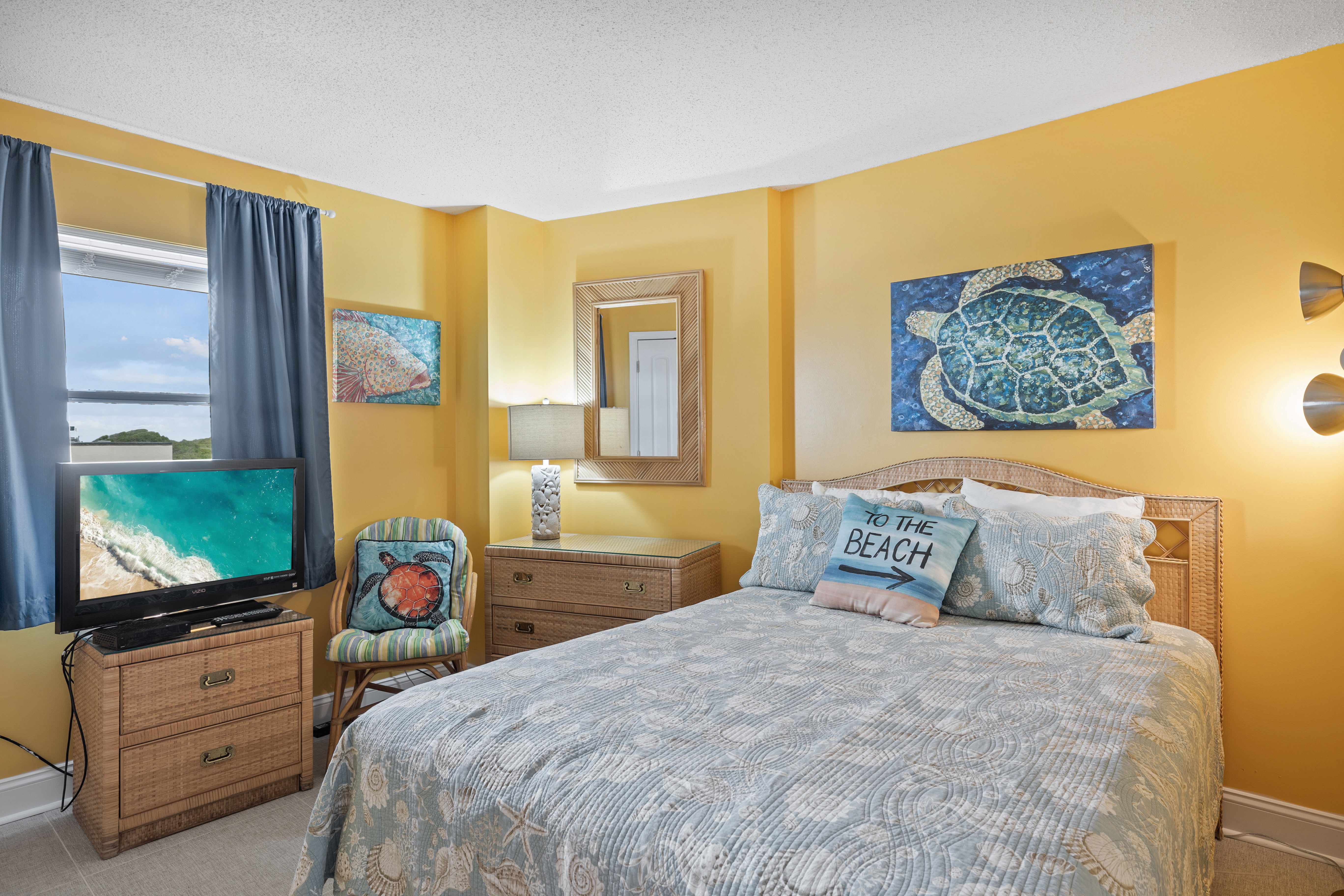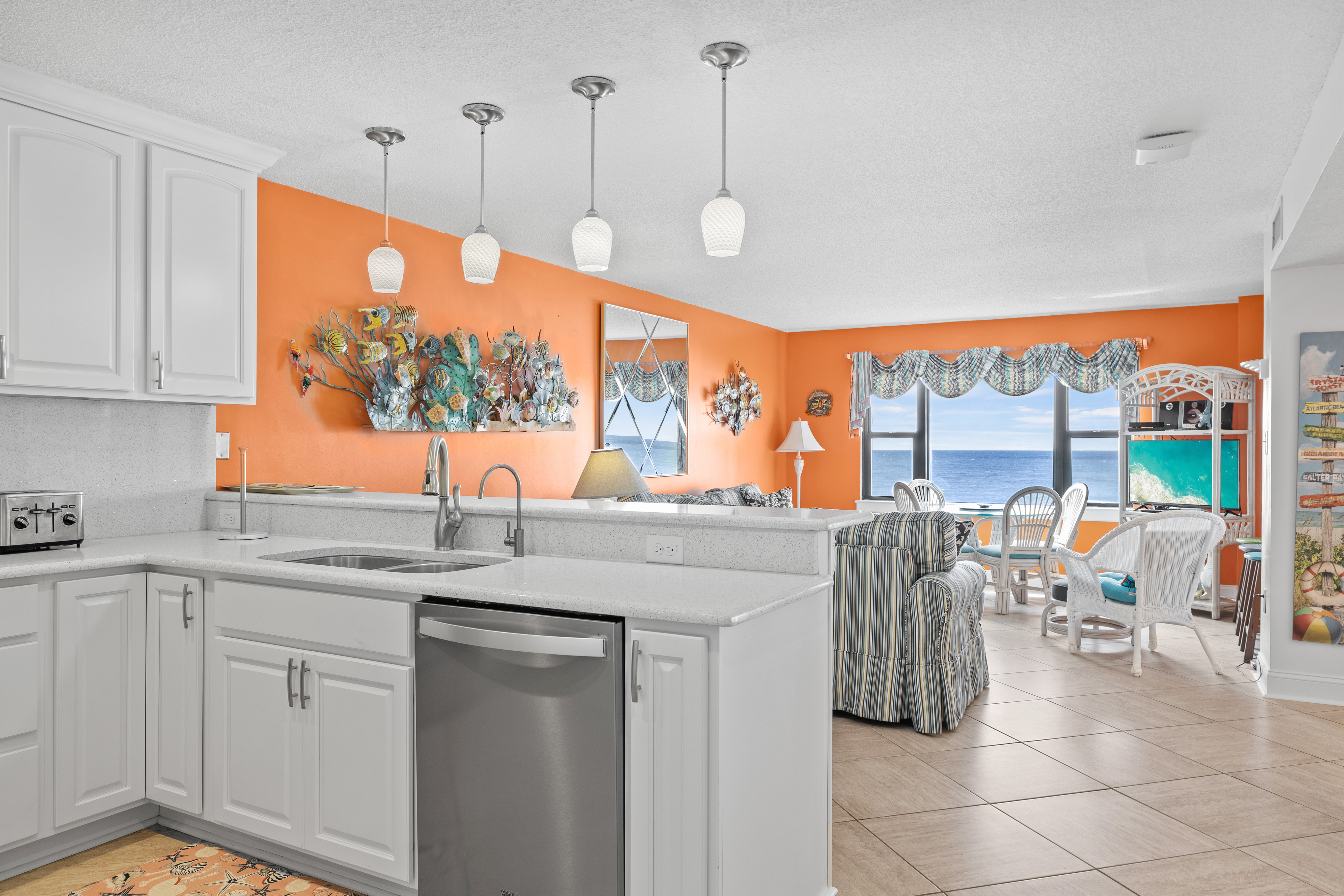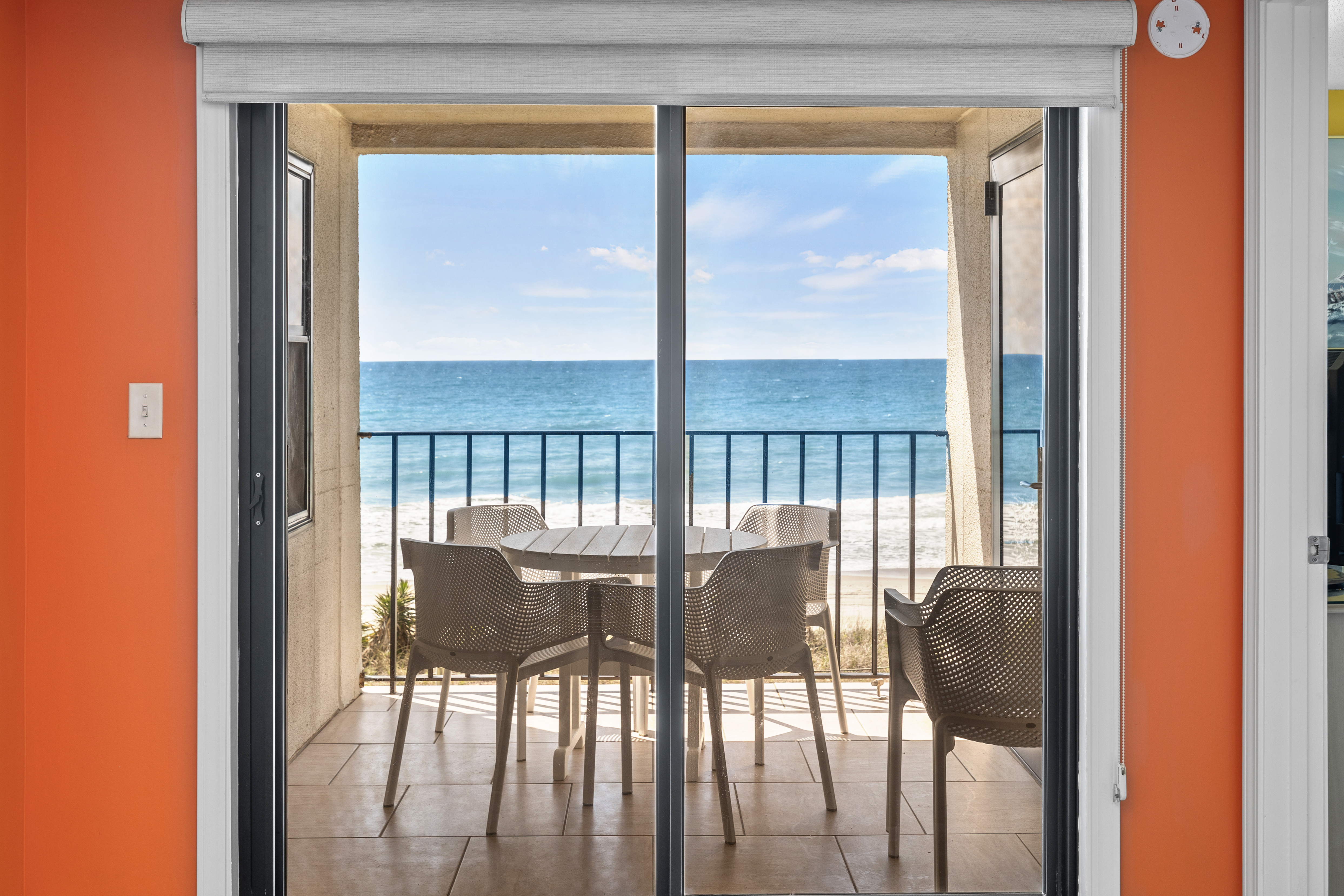Summer Winds 221 is a beautifully decorated Direct Oceanfront Condo with tile floors throughout and great ocean views from many places within the condo. The Living Area has lots of seating, Flat Screen HD TV, and direct access to the covered deck with amazing views of the glistening Atlantic Ocean. Large Dining Area has seating for 6, with additional seating available in the Living Room and Kitchen Bar. The Kitchen and Bar combo is equipped with a microwave & dishwasher and a Keurig coffee maker, with seating and plenty of counter space. Master Bedroom #1 has King Bed, Full bath & private deck access. Bedroom #2 has a Queen Bed. Bedroom #3 has 2 Twins. Bedrooms 2 & 3 share a bath.