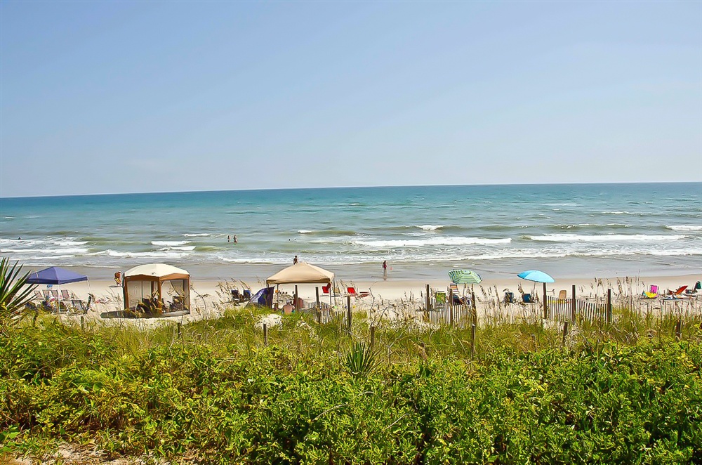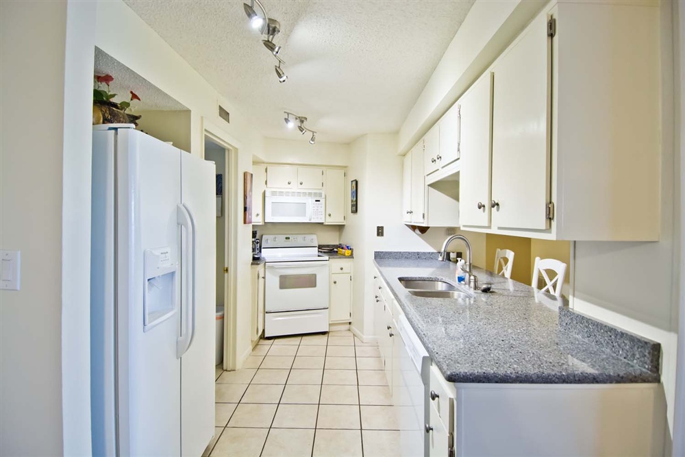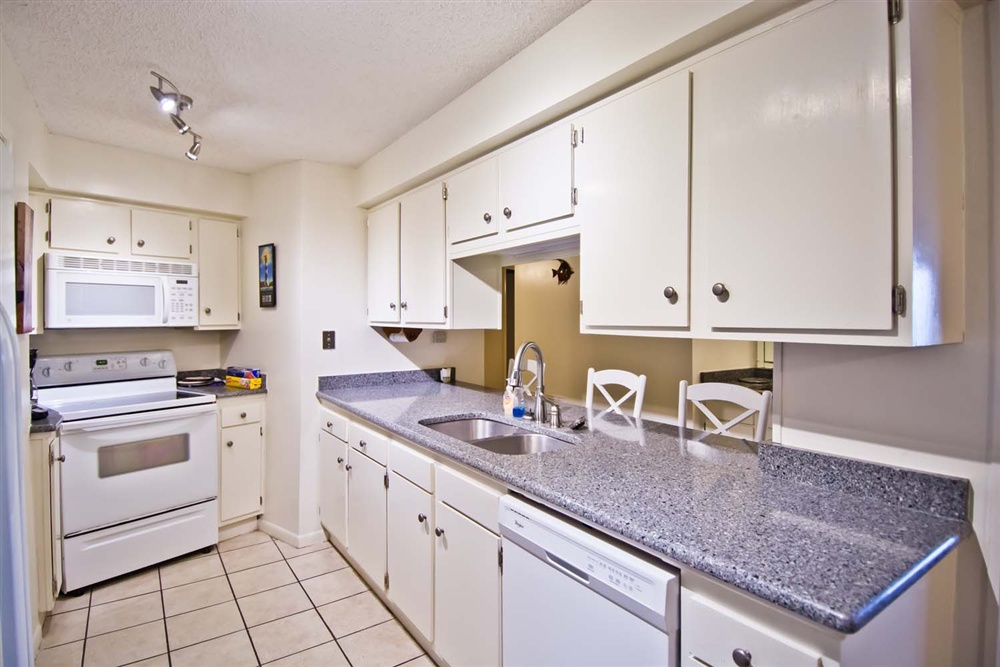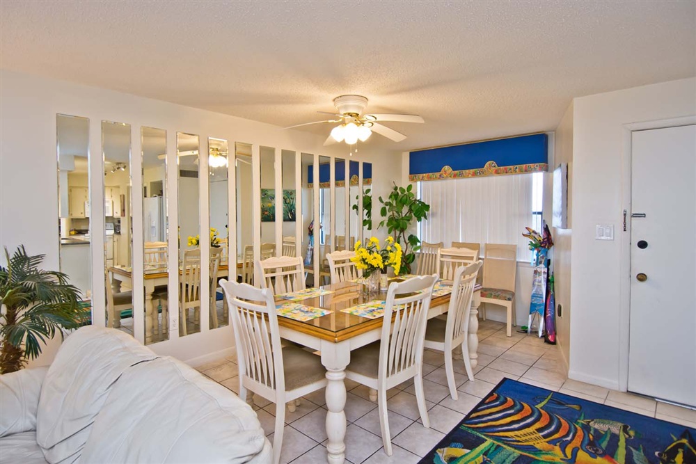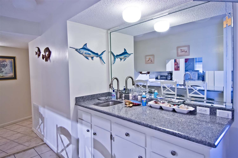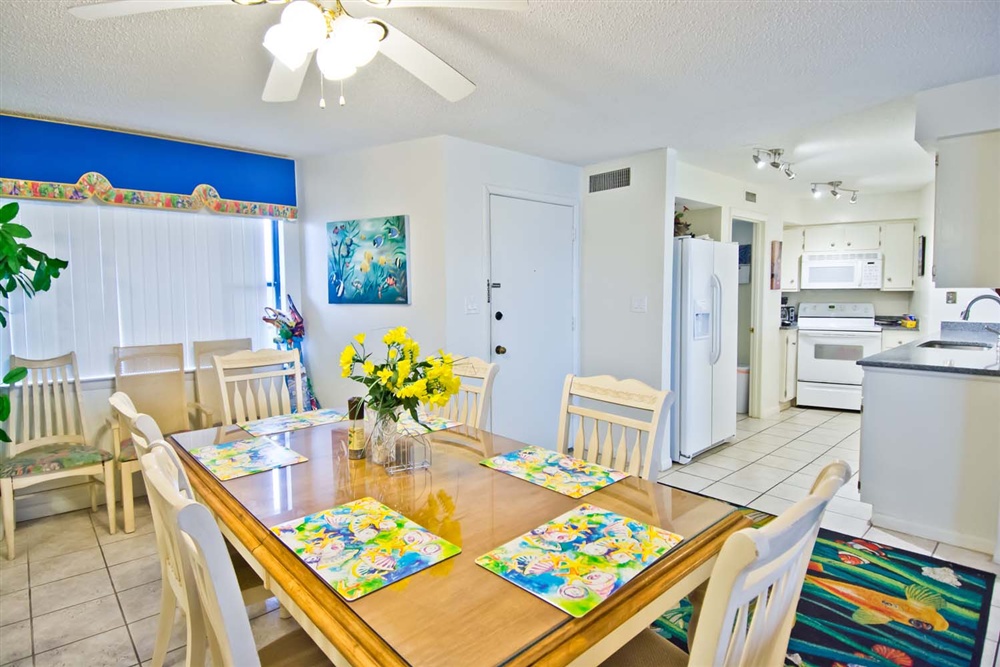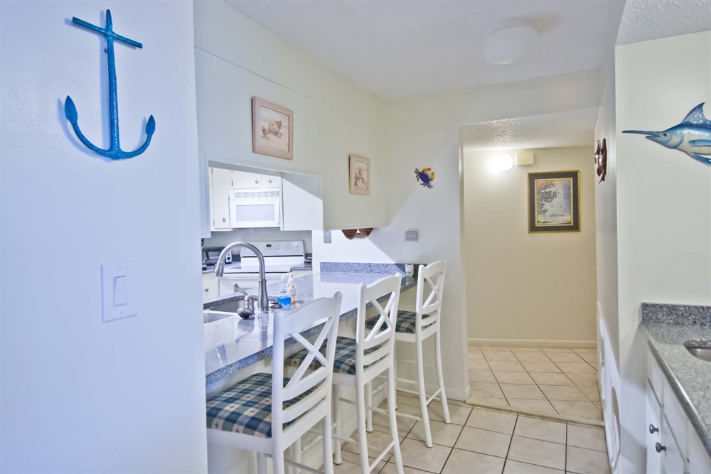 Step out and view the beautiful sunrise come up over the Atlantic Ocean and enjoy a cup of coffee. The dining area boasts a nice snack bar while providing ample seating for a sit-down dinner. Fully equipped kitchen/bar area with refrigerator, dishwasher, & microwave.