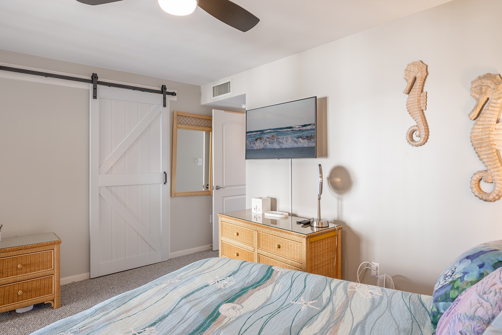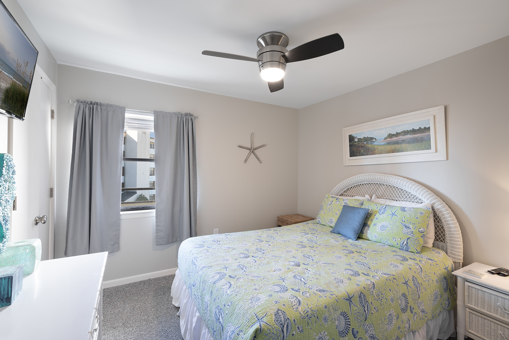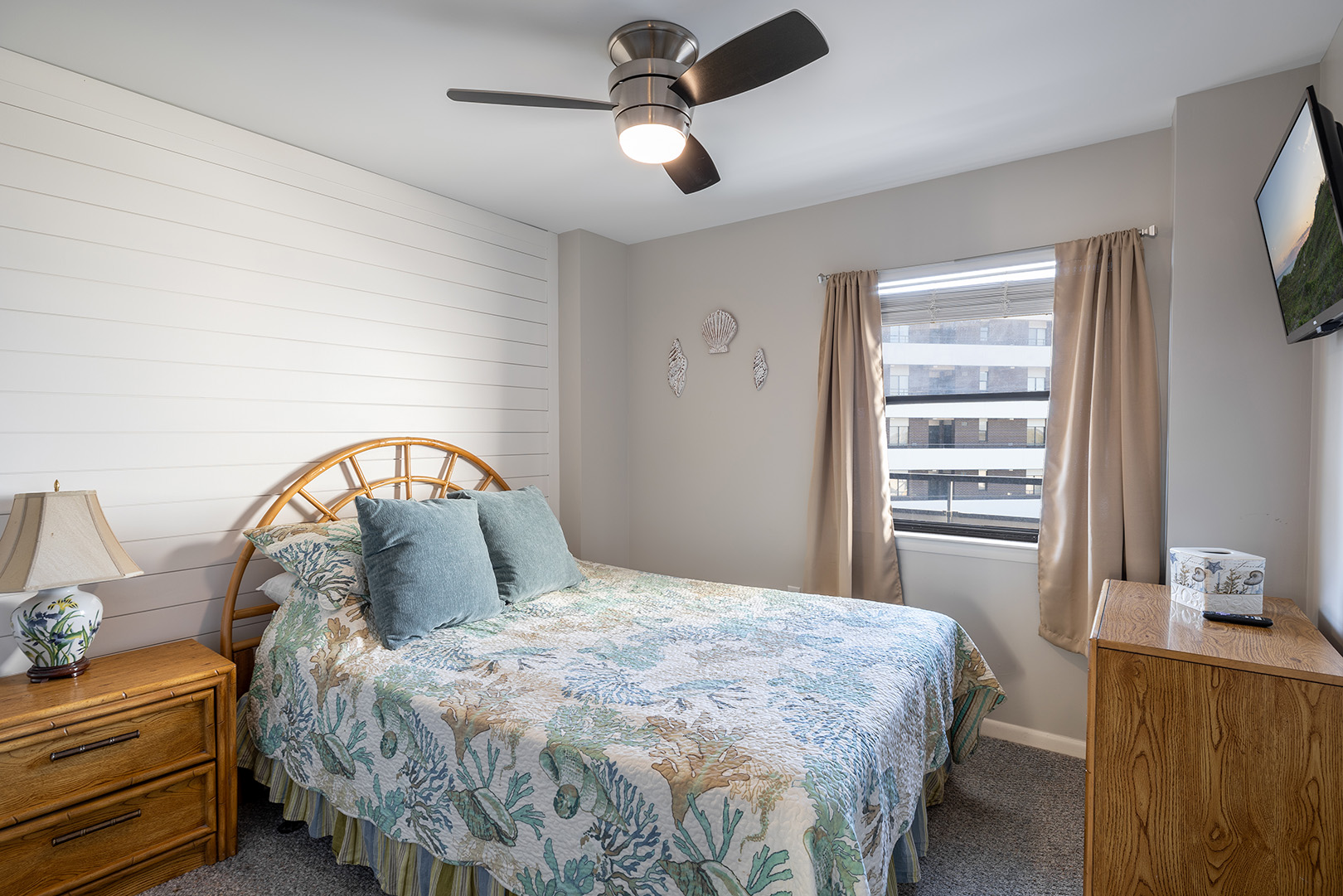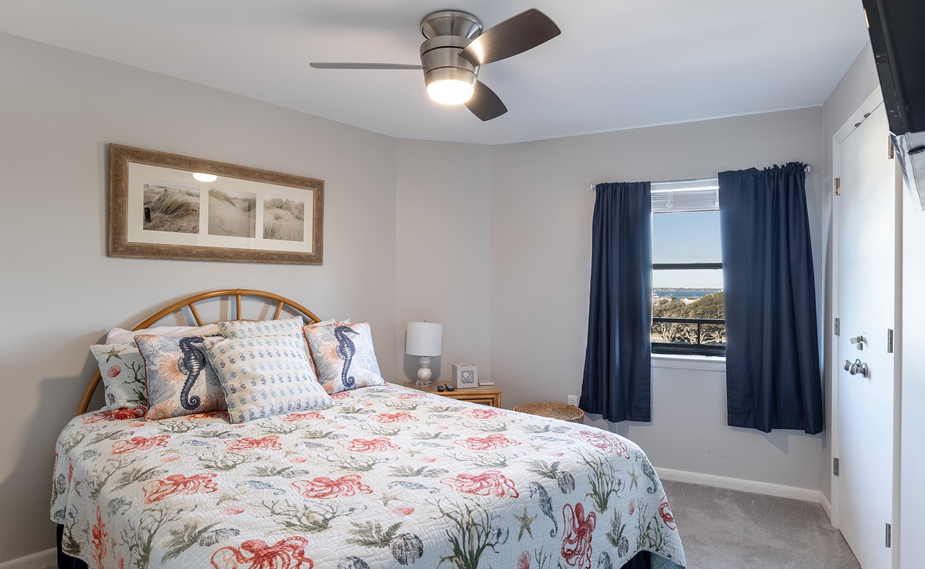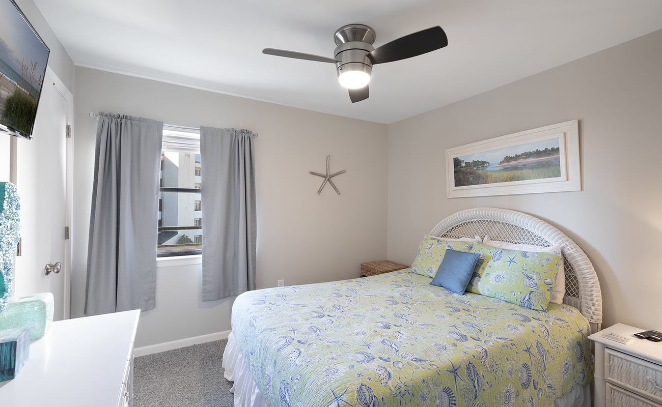 Bedroom #2 has a Queen Bed & TV, access to shared hall bath.