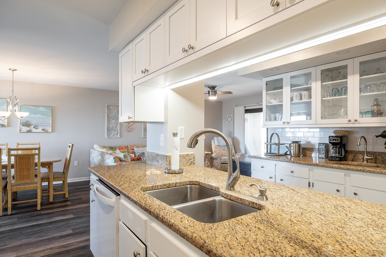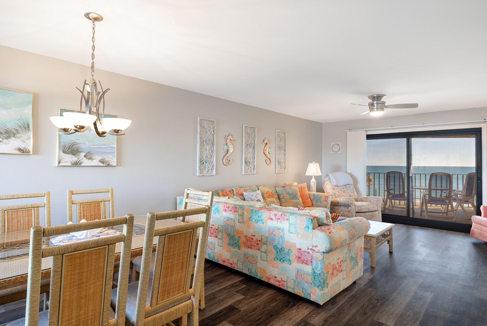 Great room with living, dining, kitchen, and half bath affording ocean and pool views from inside as well as on the covered balcony.