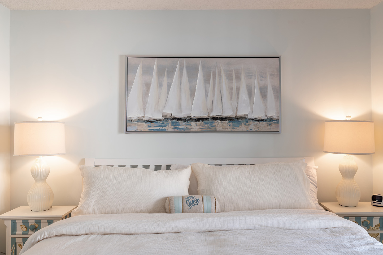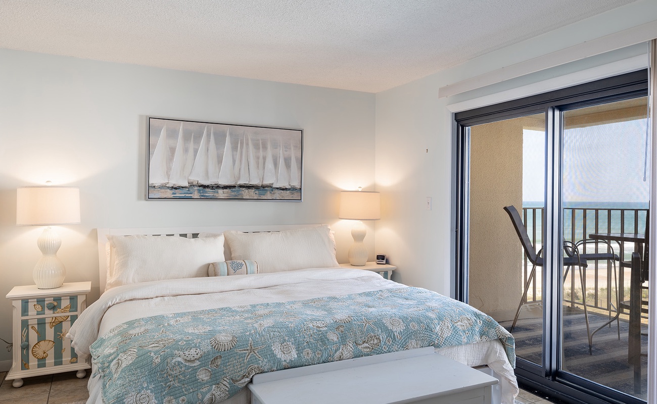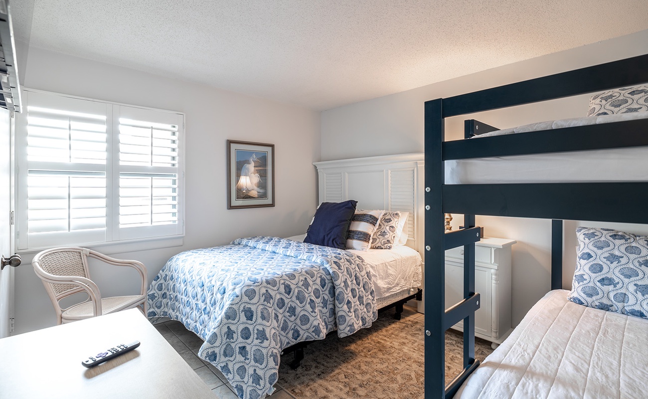 The master suite offers a king-sized bed, an en-suite bathroom with a walk-in shower, and a soaking tub with an ocean view. Bedroom #2 has a Queen Bed and a set of twin bunk beds. A shared bath is adjacent. The bedrooms provide a luxurious retreat after a day of beachside adventures.