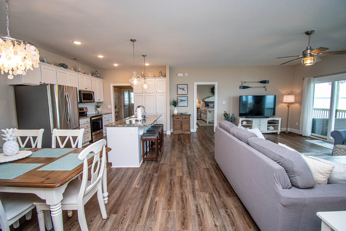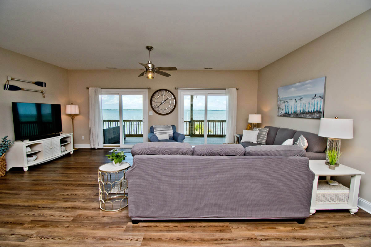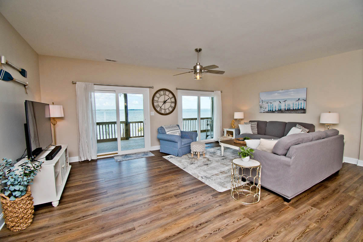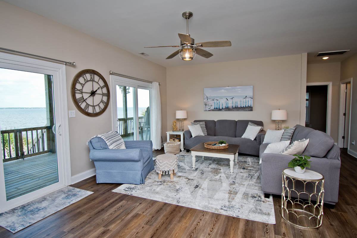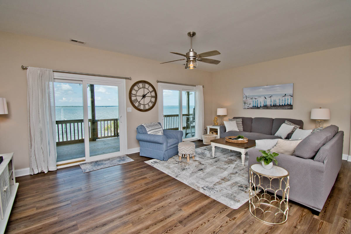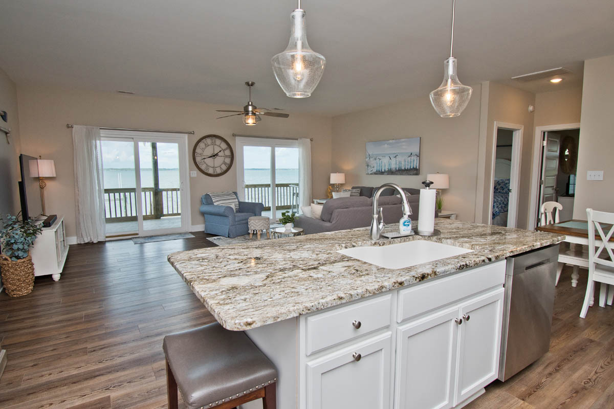 The inviting living room provides soundfront views and steps out to a covered and furnished deck. The open concept from the living room to kitchen is perfect for gathering after a day at the beach or conversiving while a meal is prepared. This gorgeous updated kitchen is fully equipped with a refrigerator, microwave, dishwasher, oven, toaster oven, Keurig coffee maker, coffee maker and a blender. A half bath is located off the kitchen area.