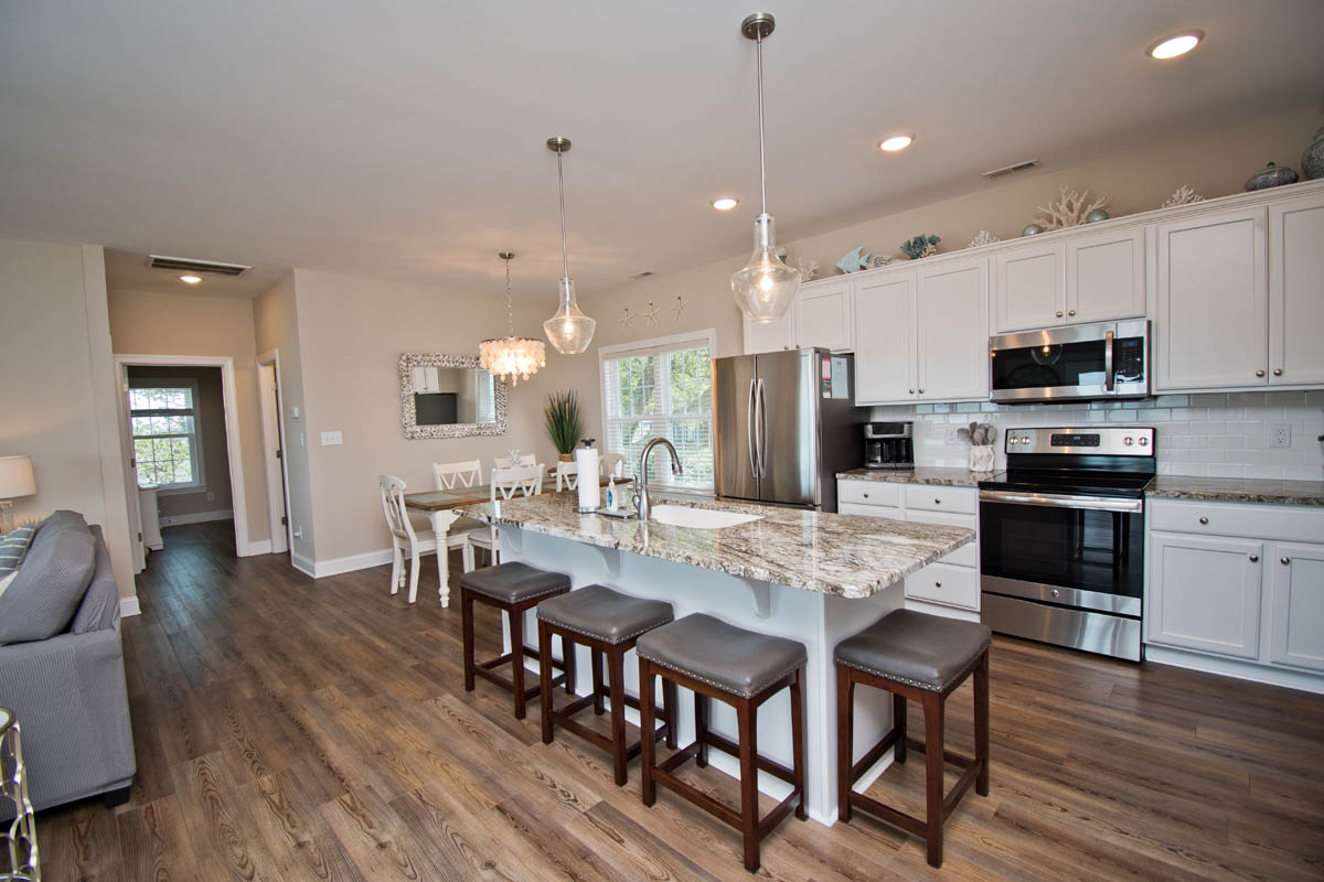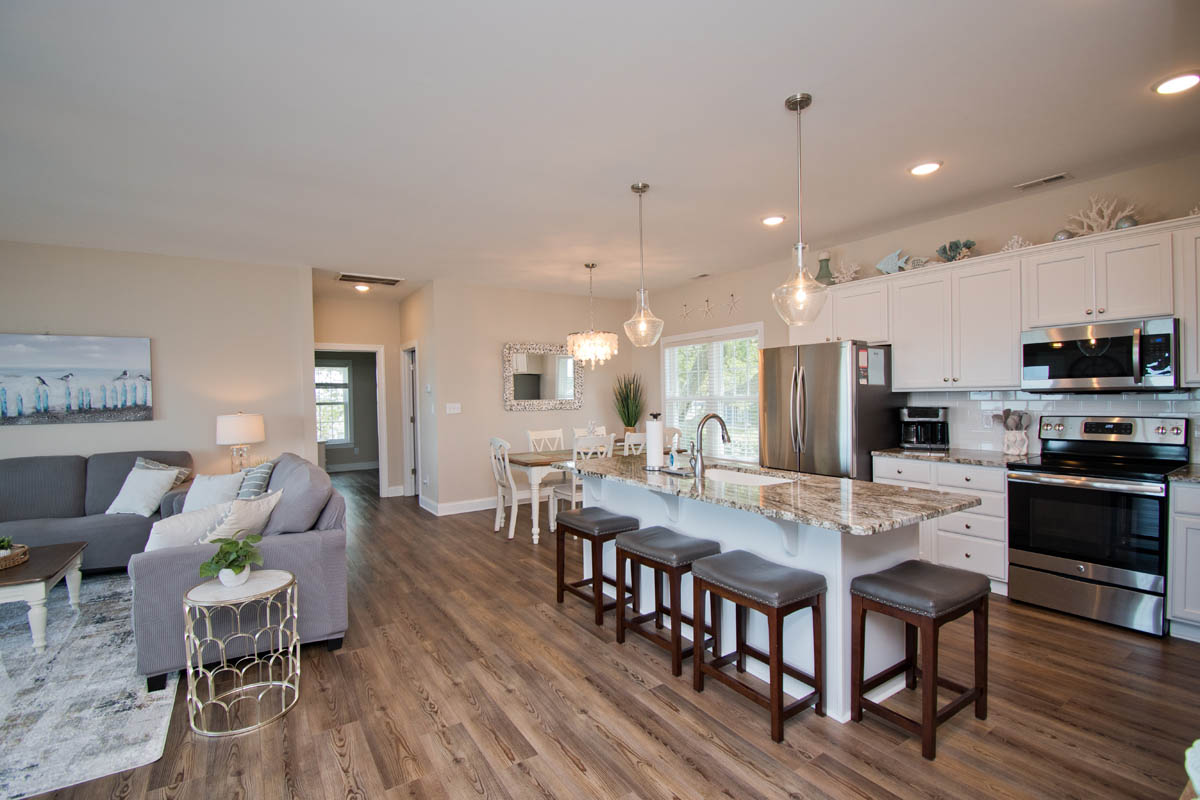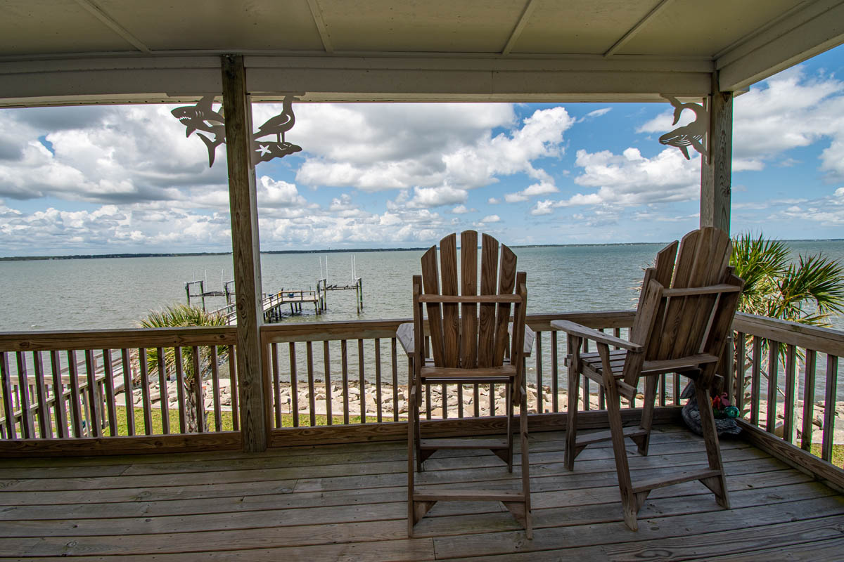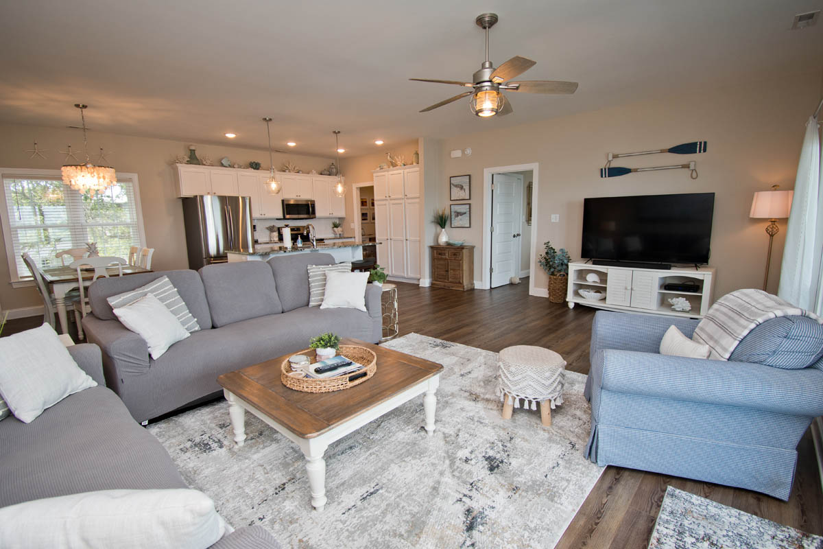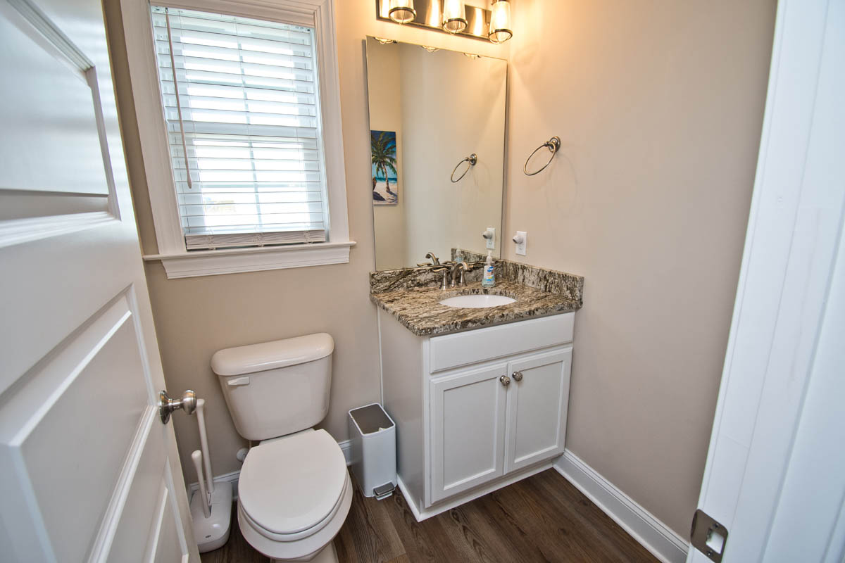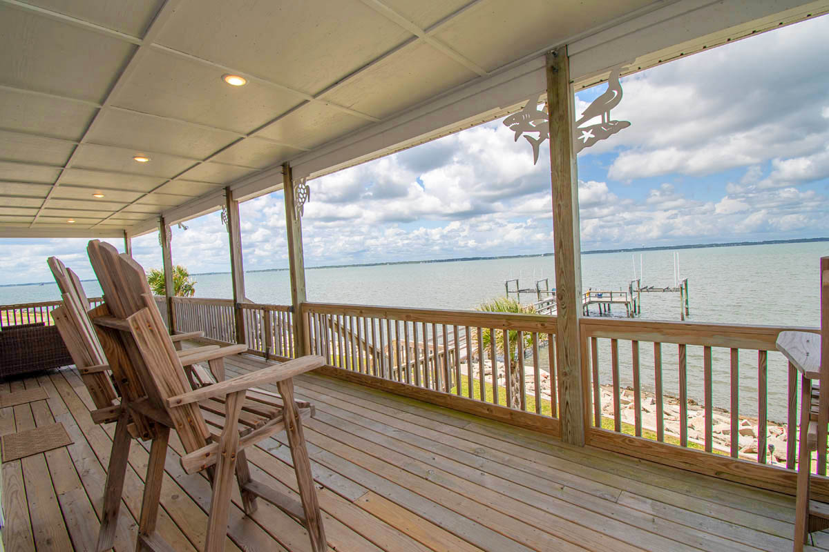 The inviting living room provides soundfront views and steps out to a covered and furnished deck. The open concept from the living room to kitchen is perfect for gathering after a day at the beach or conversiving while a meal is prepared. This gorgeous updated kitchen is fully equipped with a refrigerator, microwave, dishwasher, oven, toaster oven, Keurig coffee maker, coffee maker and a blender. A half bath is located off the kitchen area.