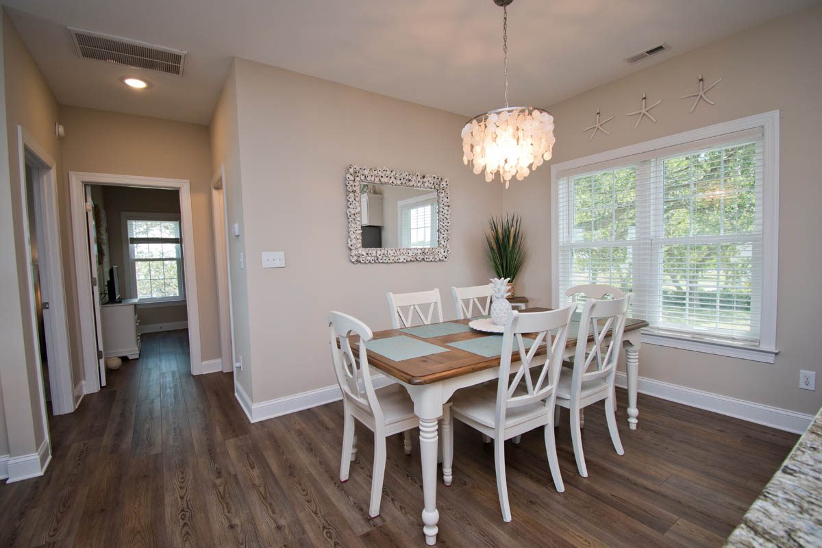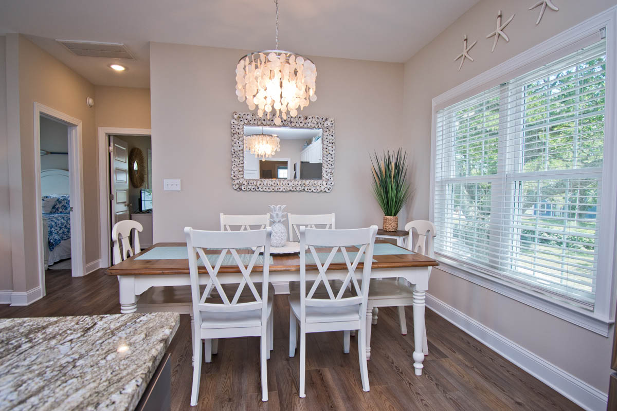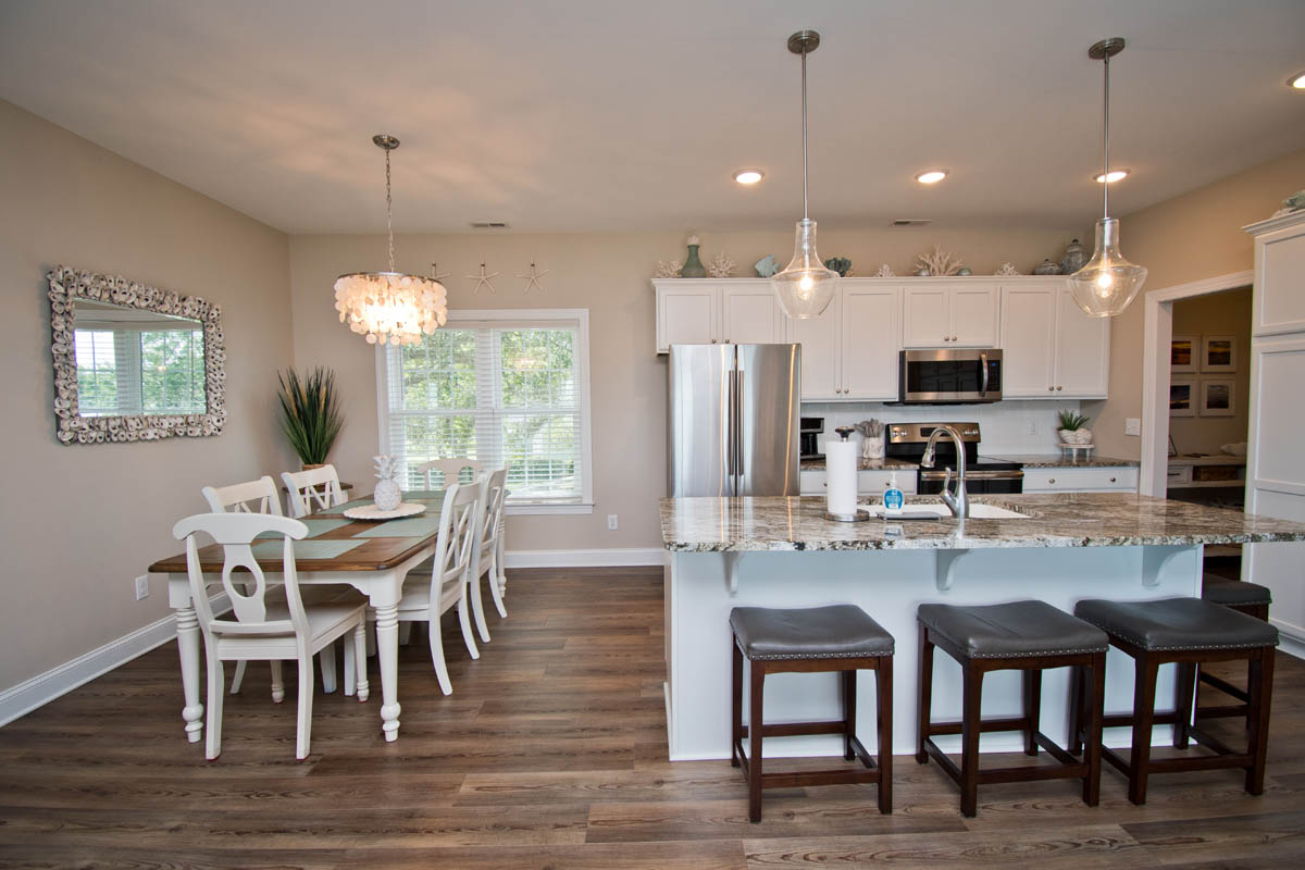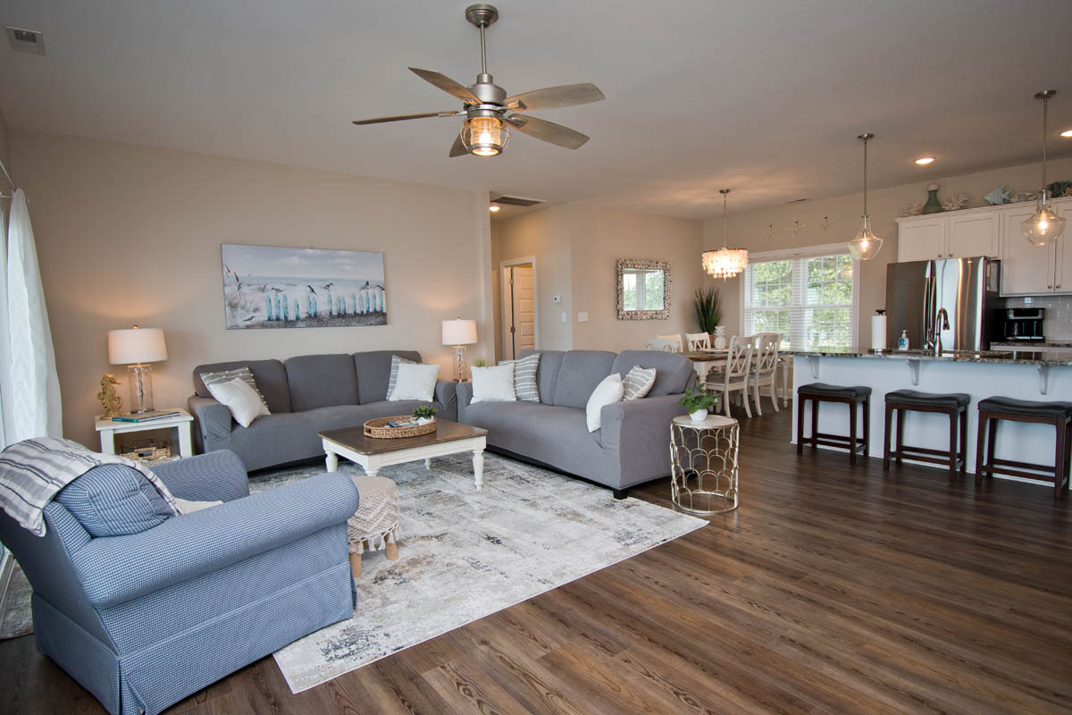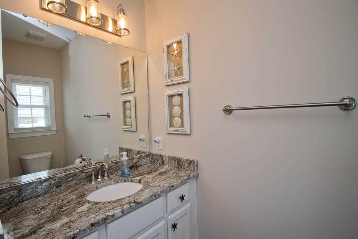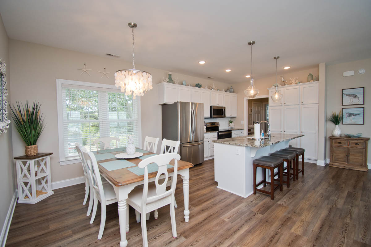 The inviting living room provides soundfront views and steps out to a covered and furnished deck. The open concept from the living room to kitchen is perfect for gathering after a day at the beach or conversiving while a meal is prepared. This gorgeous updated kitchen is fully equipped with a refrigerator, microwave, dishwasher, oven, toaster oven, Keurig coffee maker, coffee maker and a blender. A half bath is located off the kitchen area.