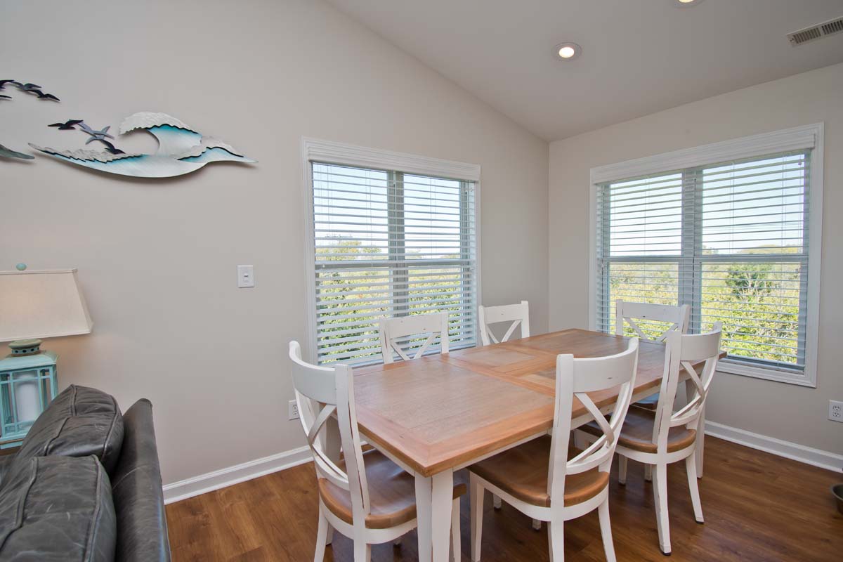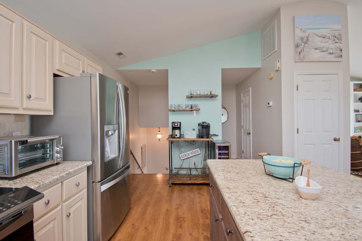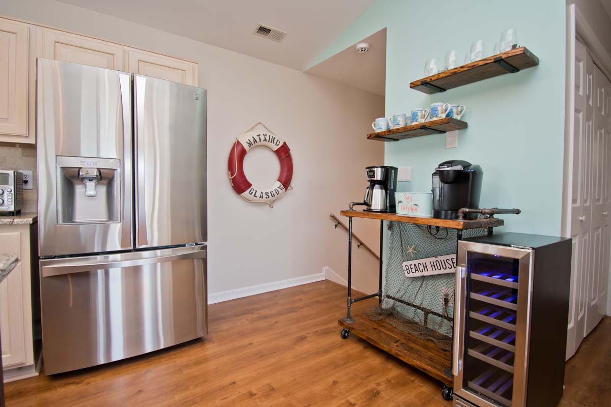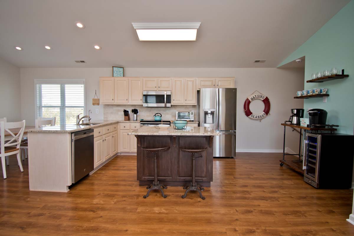 The third floor is home to the kitchen, dining room, living space, and deck access. The kitchen is fully equipped with stainless steel appliances, an air fryer, all needed cookware/utensils, a coffee bar, and a wine refrigerator. The dining table seats 6 and there are two additional seats at the kitchen island. The living space includes a TV and two couches with a separate seating area that has two chairs.