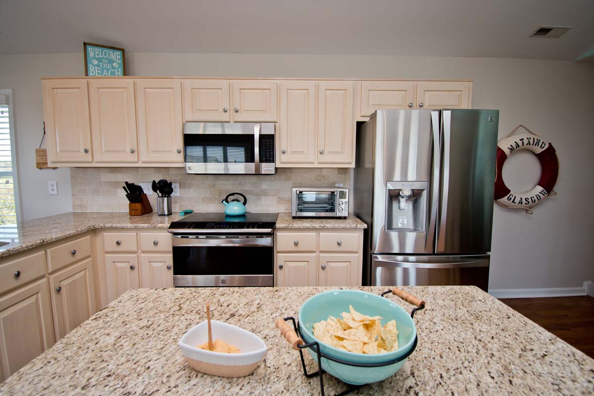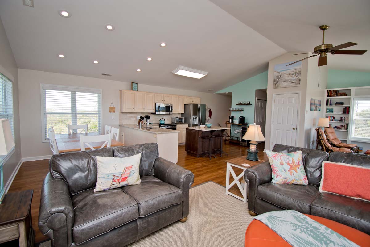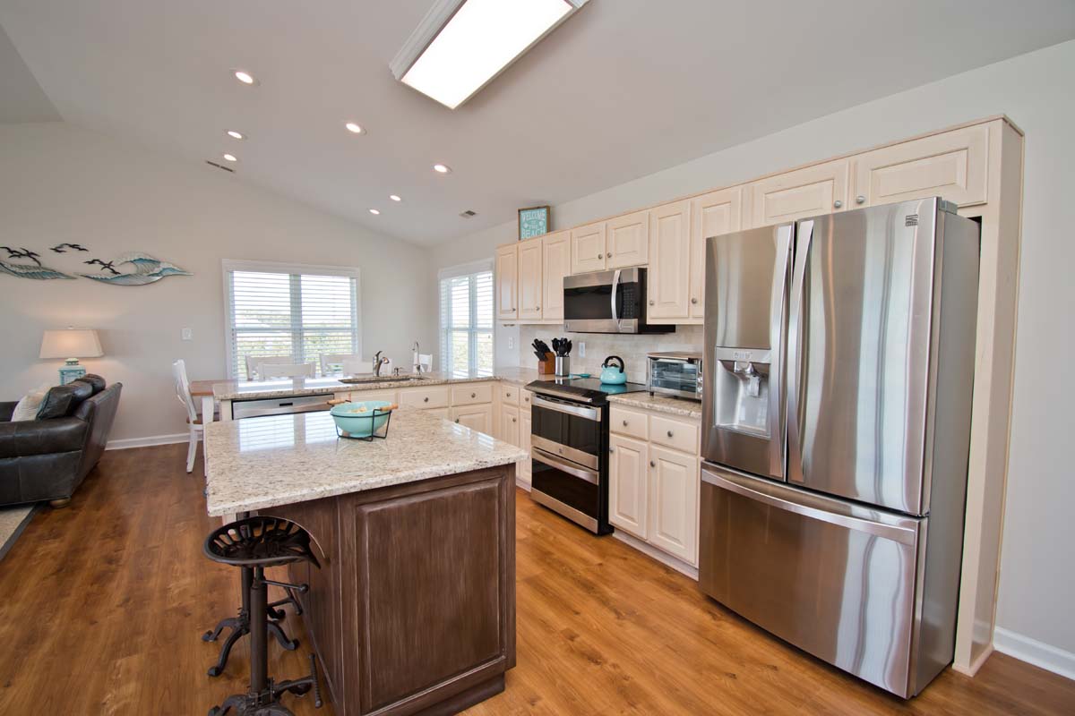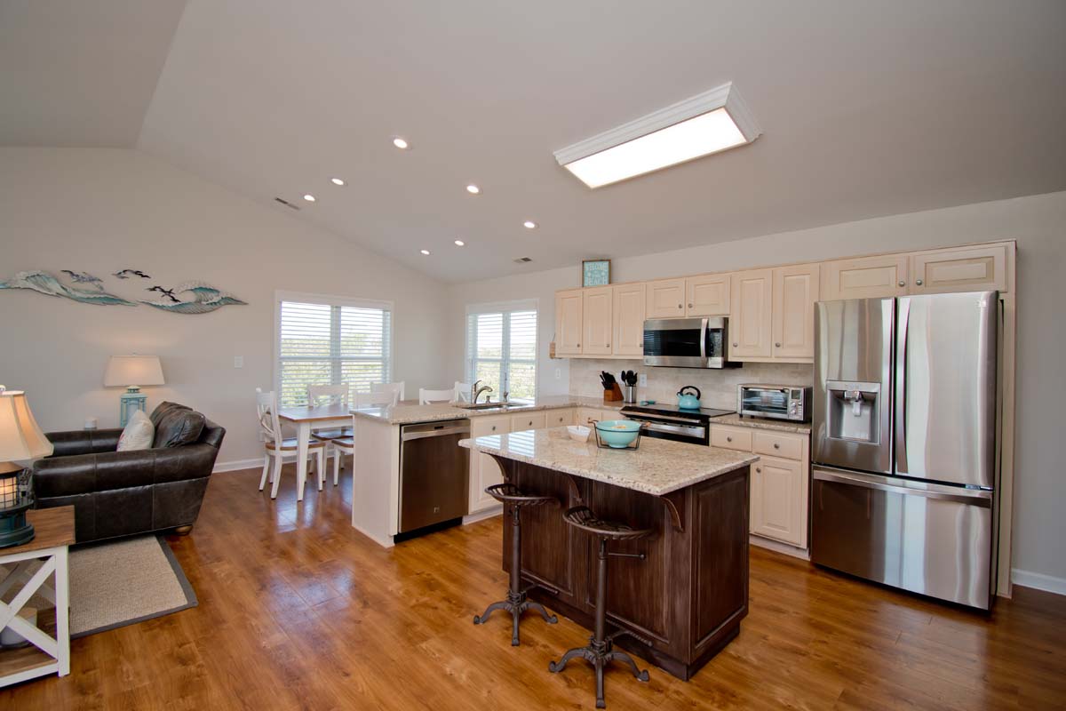 The third floor is home to the kitchen, dining room, living space, and deck access. The kitchen is fully equipped with stainless steel appliances, an air fryer, all needed cookware/utensils, a coffee bar, and a wine refrigerator. The dining table seats 6 and there are two additional seats at the kitchen island. The living space includes a TV and two couches with a separate seating area that has two chairs.