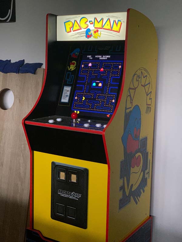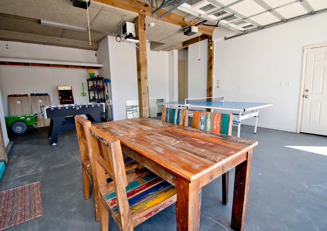 The ground/first floor includes a garage game room with ping pong and foosball tables, and a standup arcade game. The space includes a full bathroom and a bonus room with a kitchenette, air fryer, microwave, refrigerator, double sleeper sofa, and smart TV.