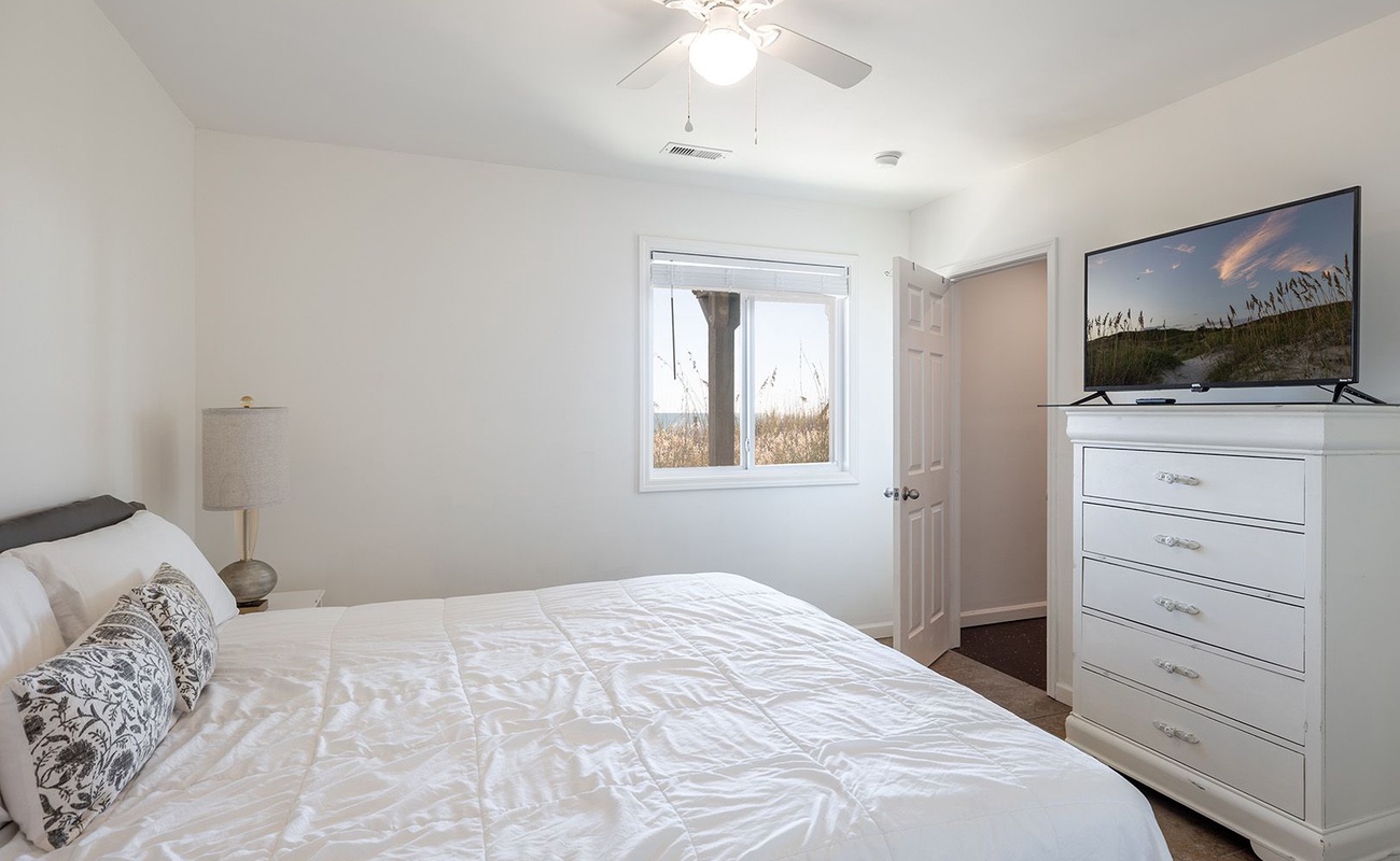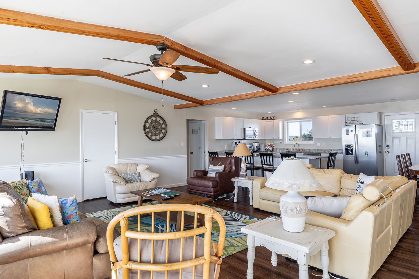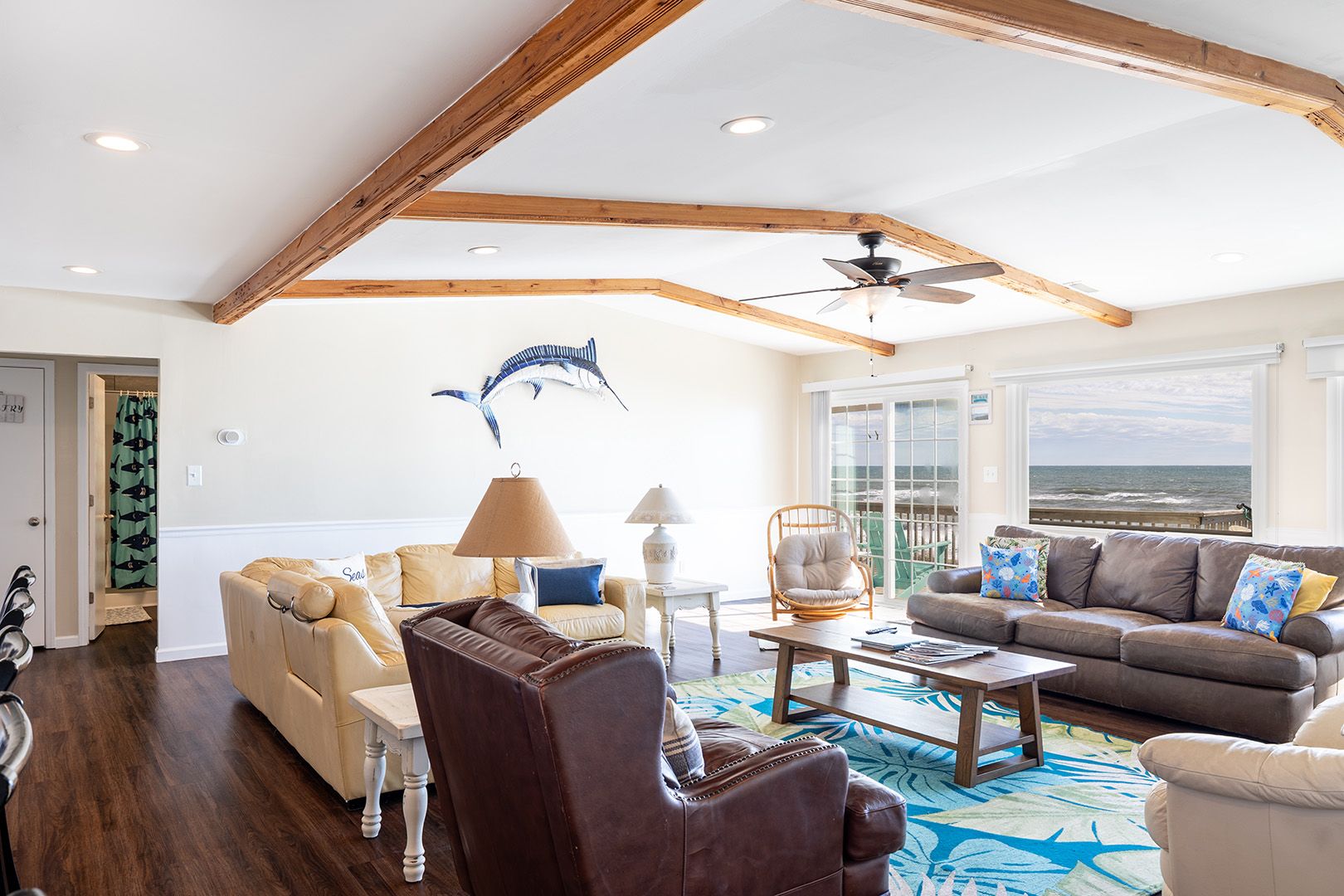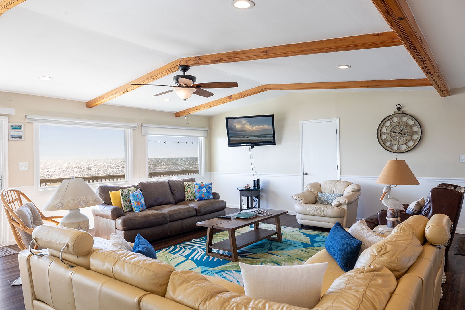 Floor 2:Â Bedrooms #1 and Bedrooms #2 are each Oceanfront with a King Bed, Smart TV with access to premium cable channels and Roku streaming apps including Hulu and Amazon Prime Video, and Deck Access. Bedroom #3 is streetside with Sound view, King Bed, and Smart TV with premium cable channels and Roku streaming apps access including Hulu and Amazon Prime Video. Bedroom #4 is streetside with Sound view, Queen Bed + 1 Set of Twin Bunks, and Smart TV with premium cable channels and Roku streaming apps access including Hulu and Amazon Prime Video. 2 Shared Full Baths. Great Room with Living Area, Dining Area, and Fully Equipped Kitchen.