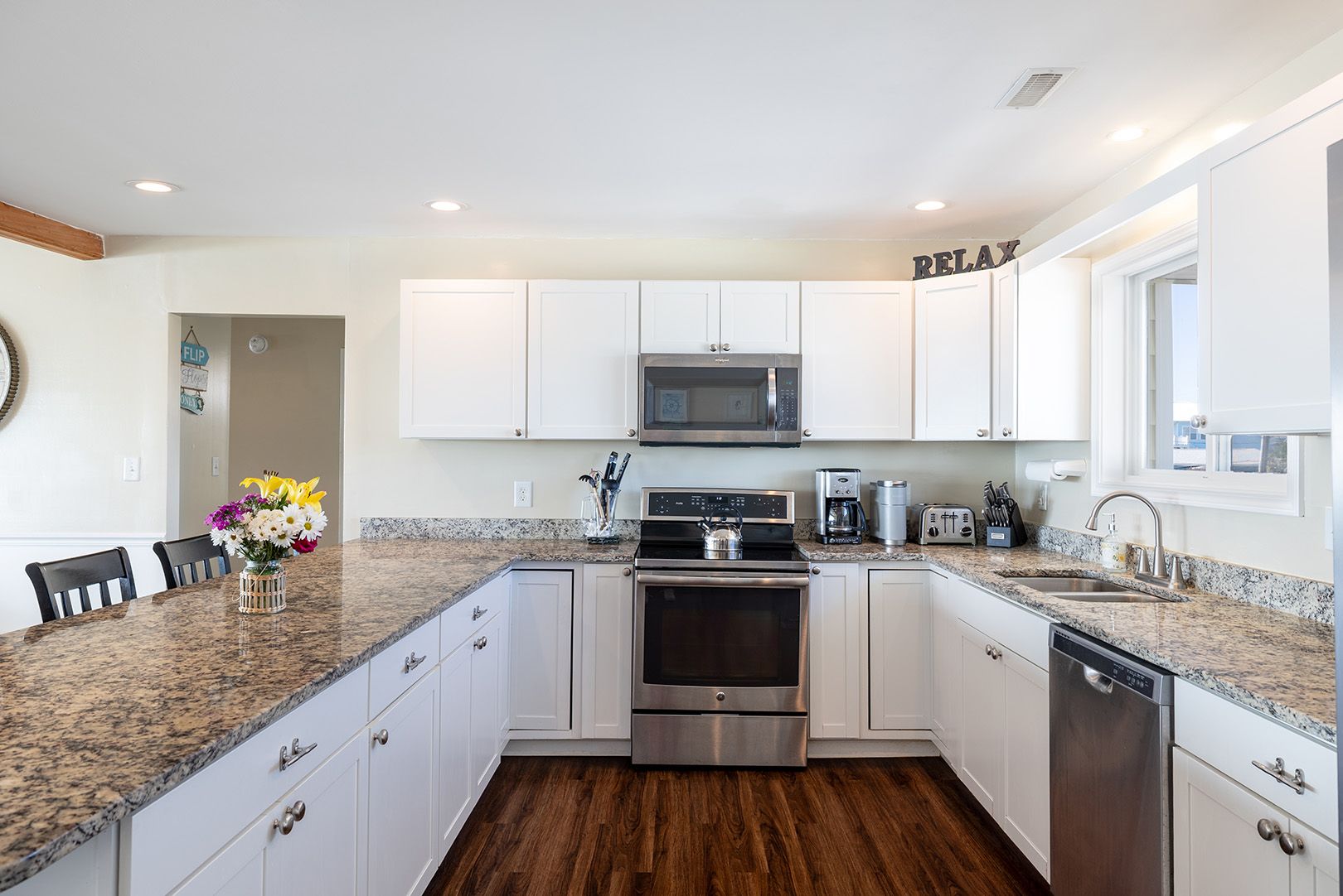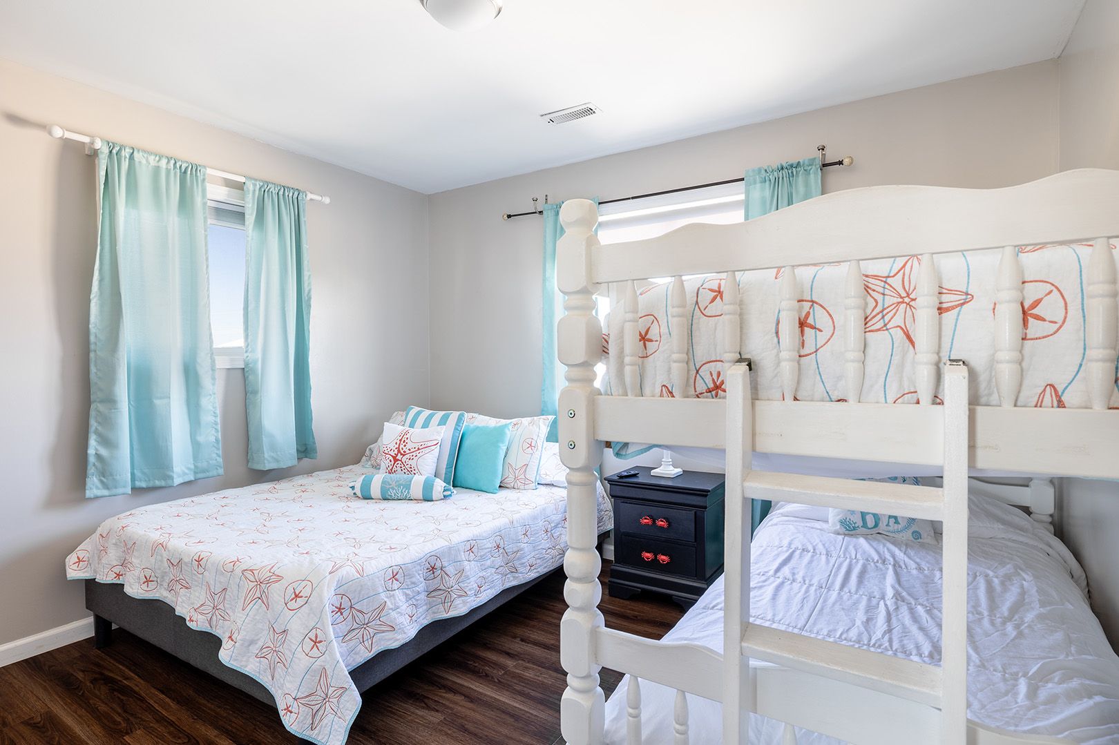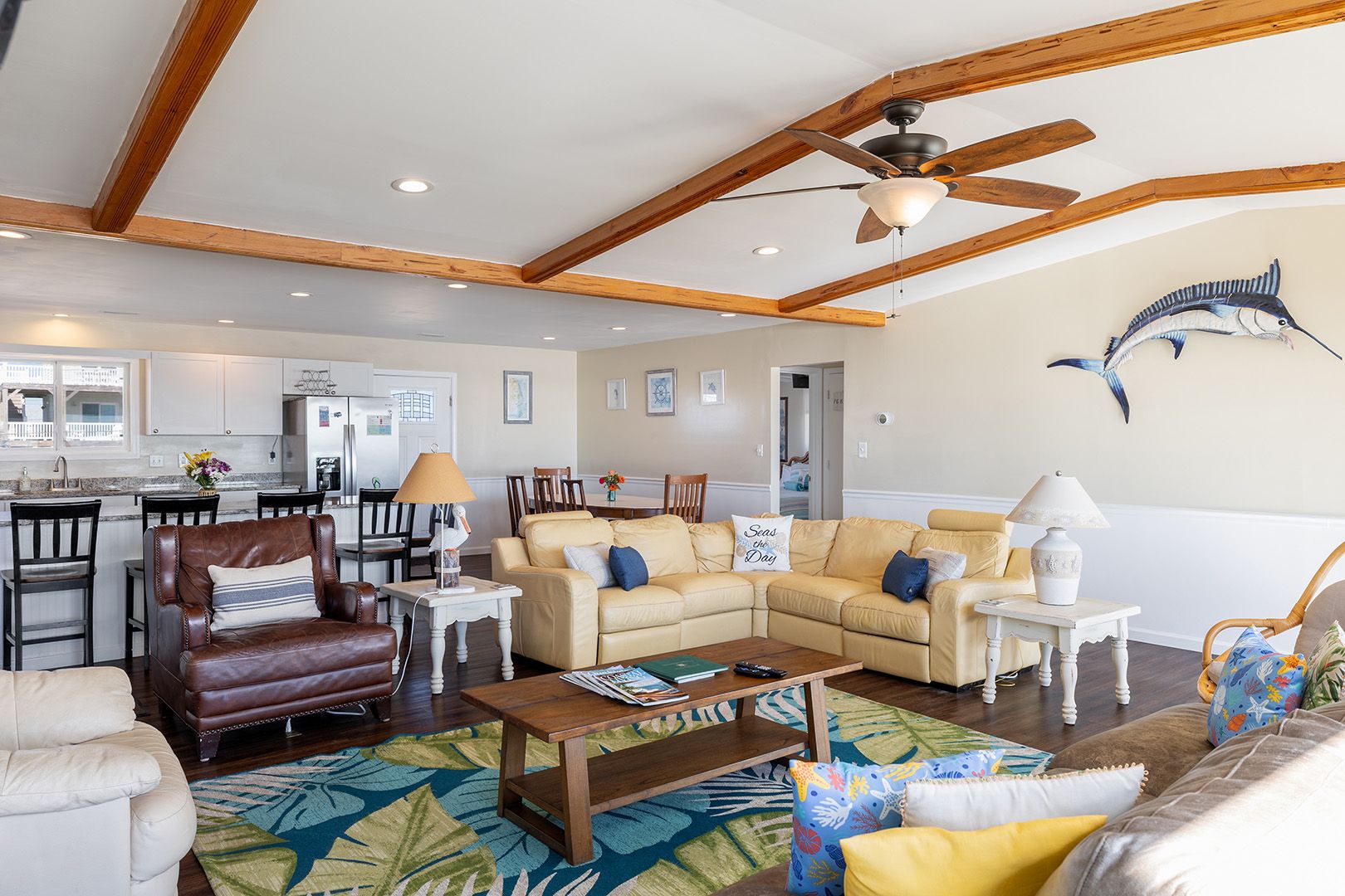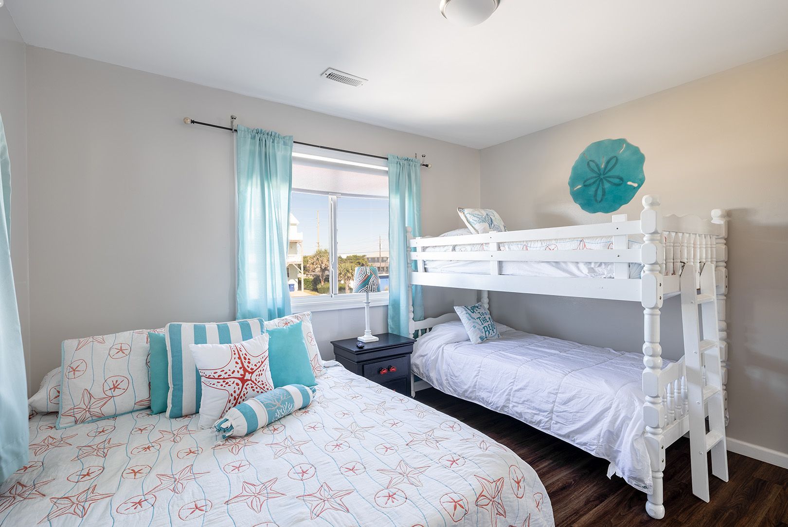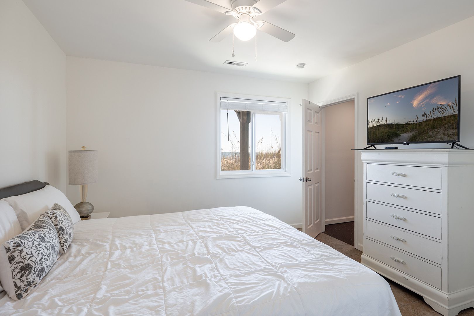 Floor 2:Â Bedrooms #1 and Bedrooms #2 are each Oceanfront with a King Bed, Smart TV with access to premium cable channels and Roku streaming apps including Hulu and Amazon Prime Video, and Deck Access. Bedroom #3 is streetside with Sound view, King Bed, and Smart TV with premium cable channels and Roku streaming apps access including Hulu and Amazon Prime Video. Bedroom #4 is streetside with Sound view, Queen Bed + 1 Set of Twin Bunks, and Smart TV with premium cable channels and Roku streaming apps access including Hulu and Amazon Prime Video. 2 Shared Full Baths. Great Room with Living Area, Dining Area, and Fully Equipped Kitchen.