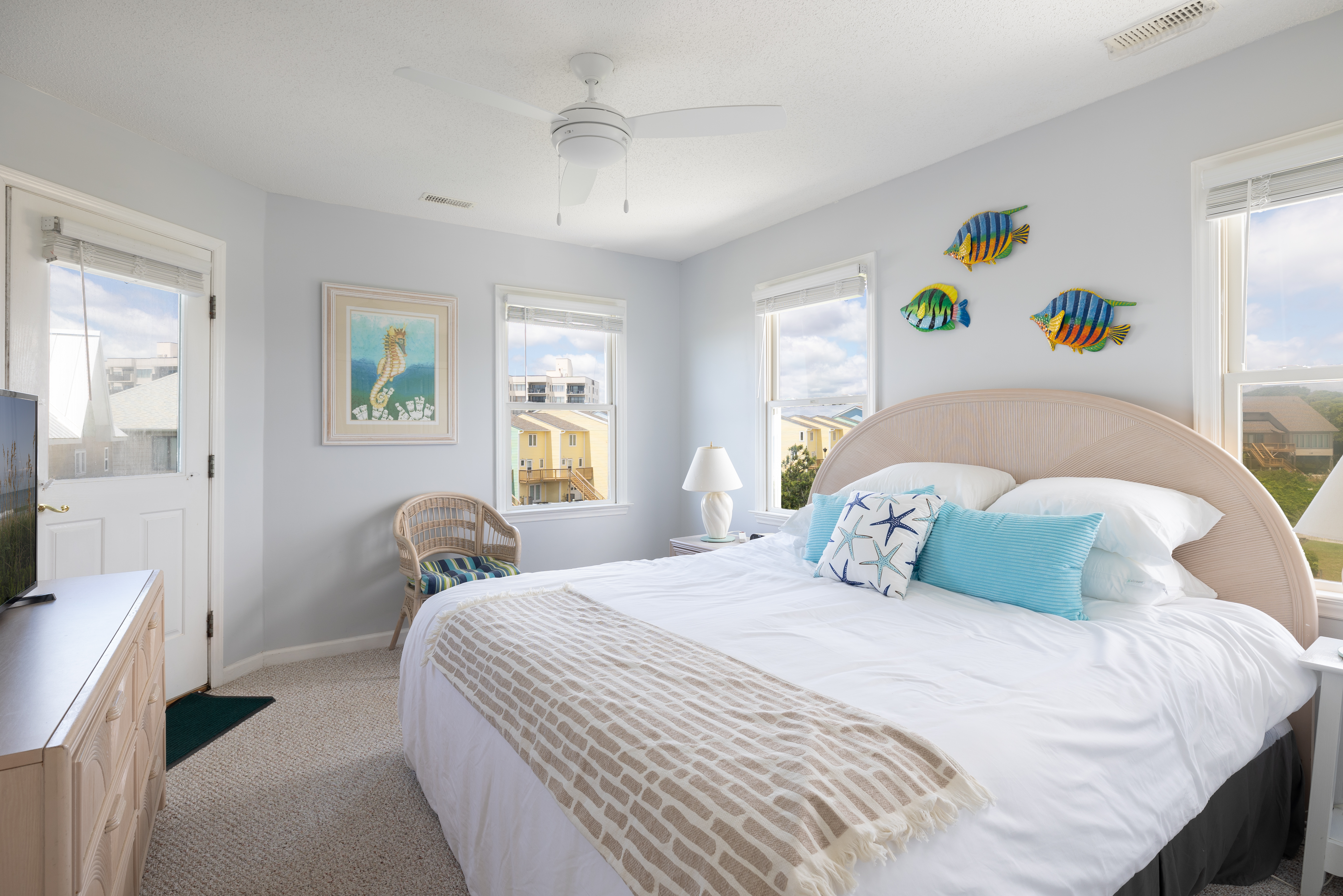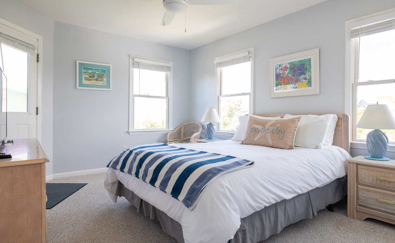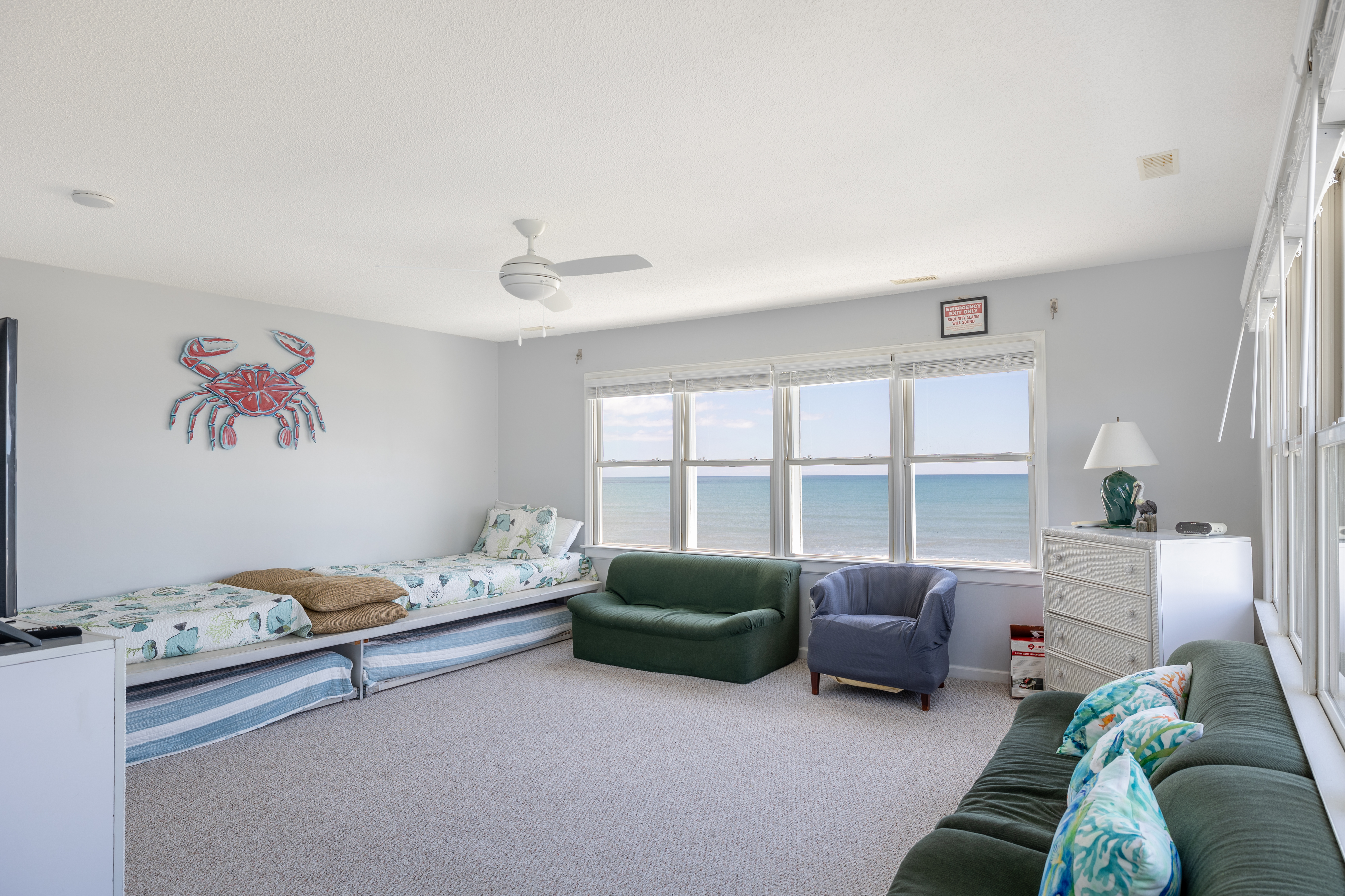 The home’s second level offers five bedrooms and six full bathrooms, including two king suites and three queen suites. There’s also a versatile flex room with an additional queen bed. Each bedroom features its own en-suite bathroom and direct access to an oceanfront deck, perfect for enjoying fresh coastal breezes and beautiful sunrise views.