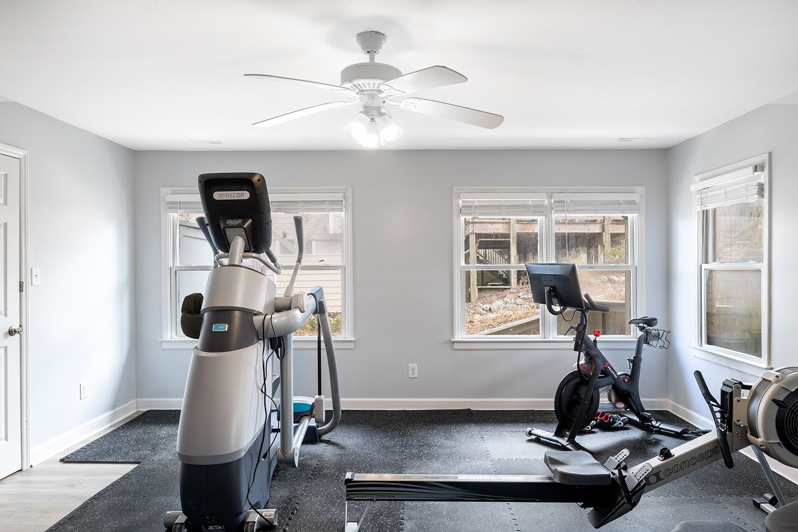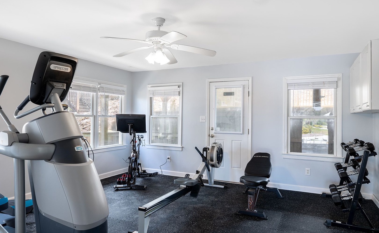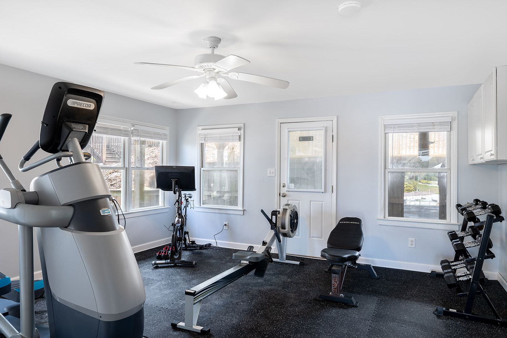 - A fully equipped gym with a Peloton, concept2 rower, elliptical, free weights, and a private bathroom
