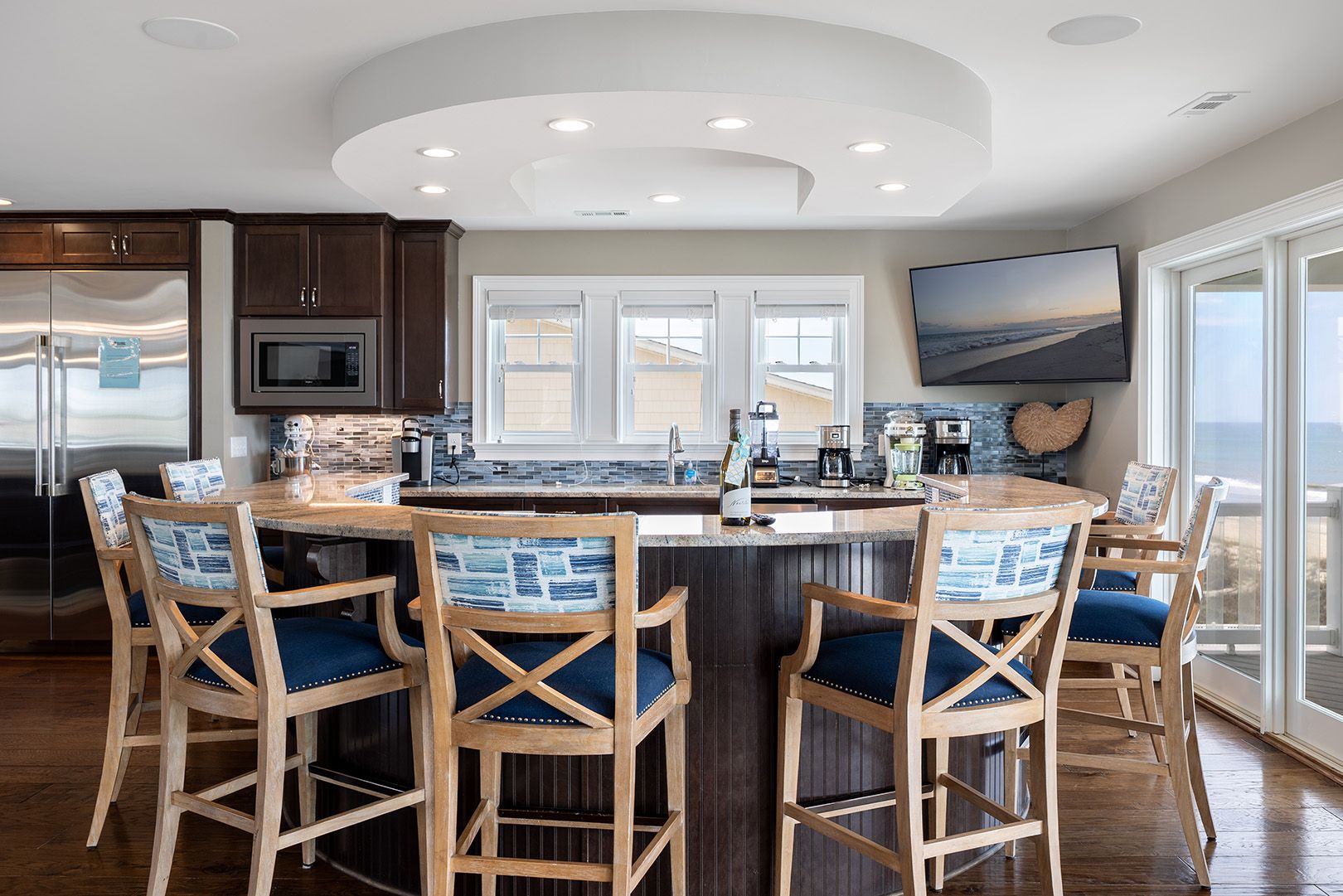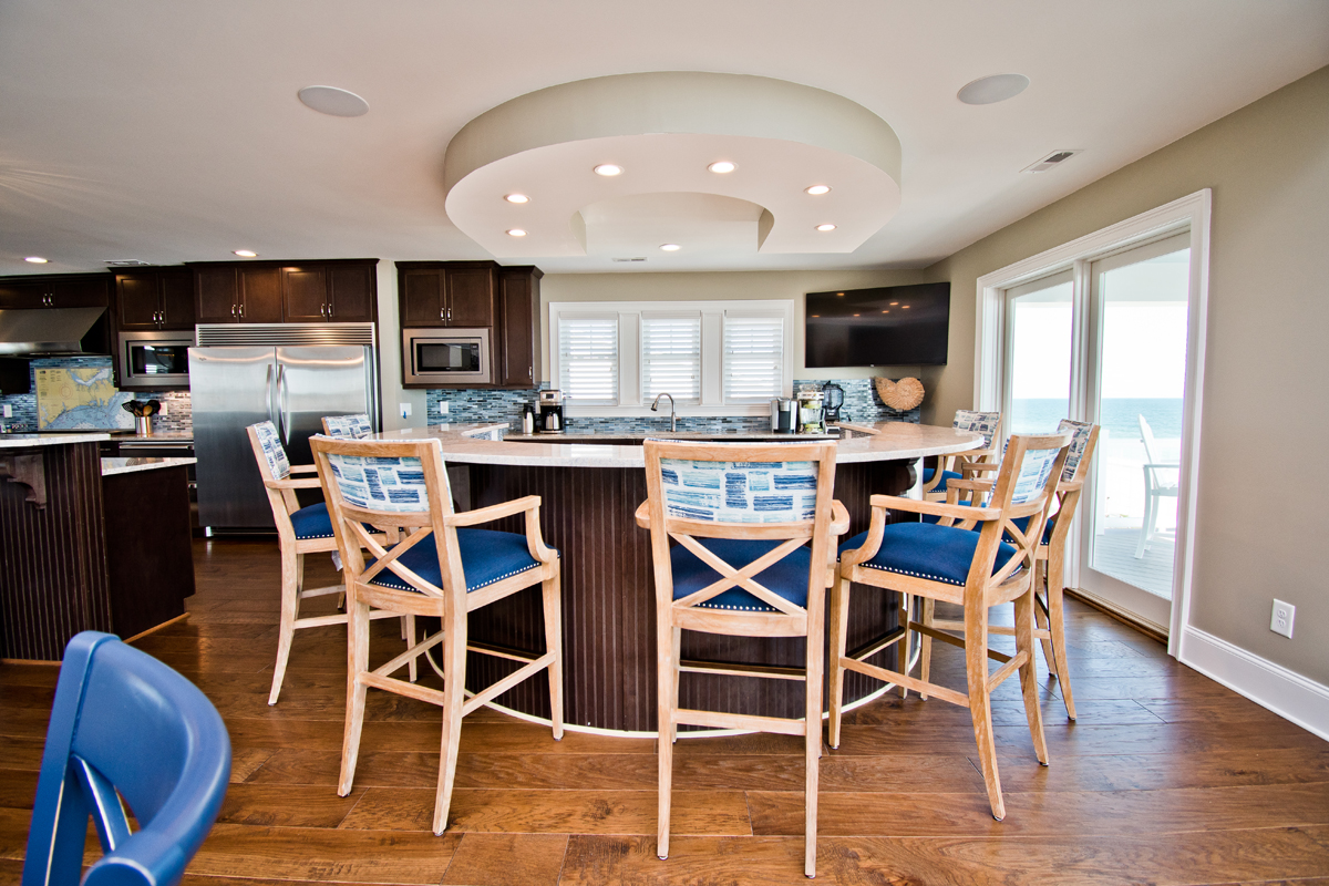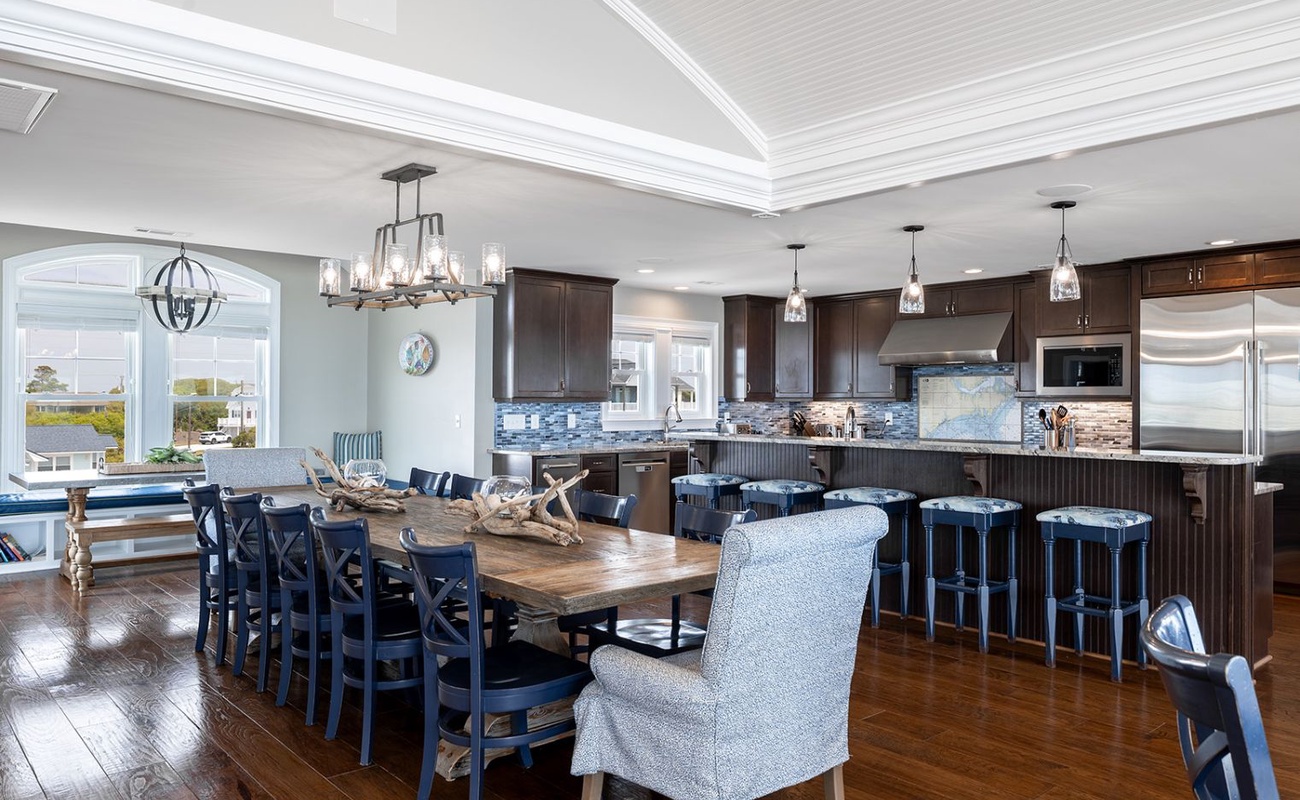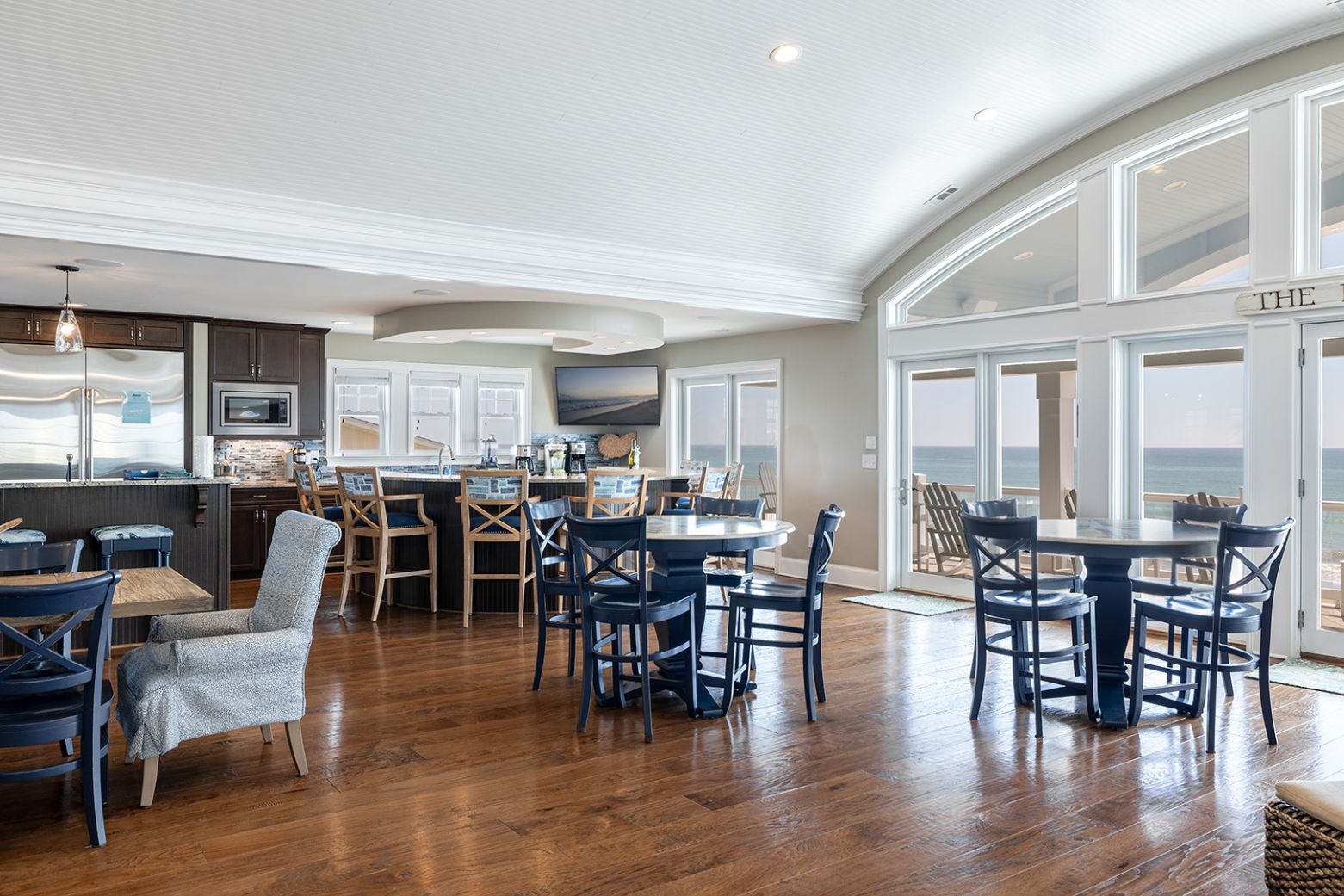 The top level is truly the crown jewel - perfect for hosting, dining, and soaking in panoramic ocean views. The chef’s kitchen is fully equipped with two refrigerators, two ovens, three microwaves, three dishwashers, and dual sinks, making large-group meals effortless. Gather around the dining table that seats 25, or enjoy drinks and conversation at the horseshoe bar with wet bar, ice maker, beverage cooler, and wine cooler.