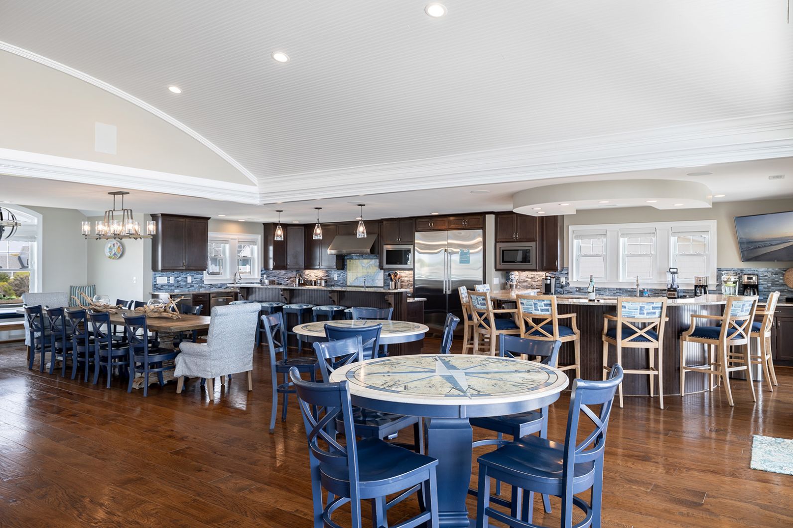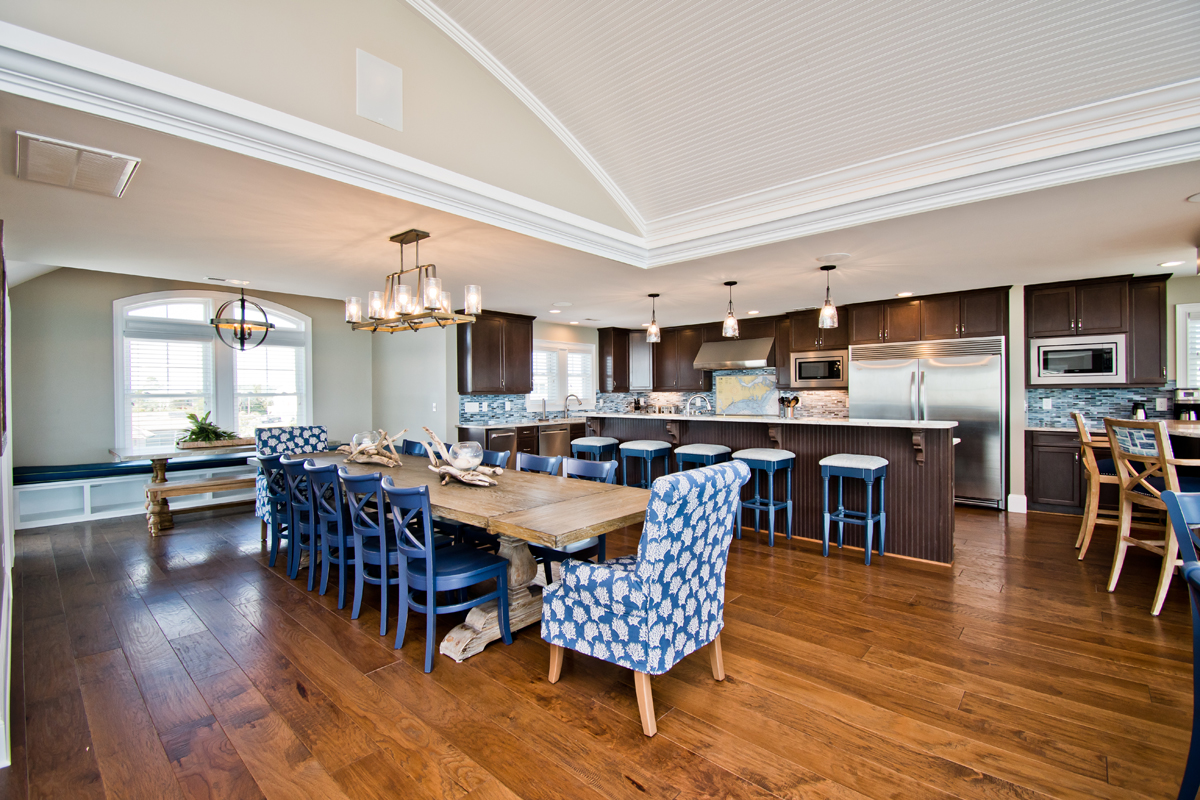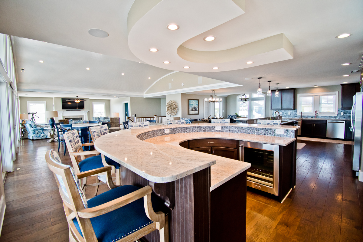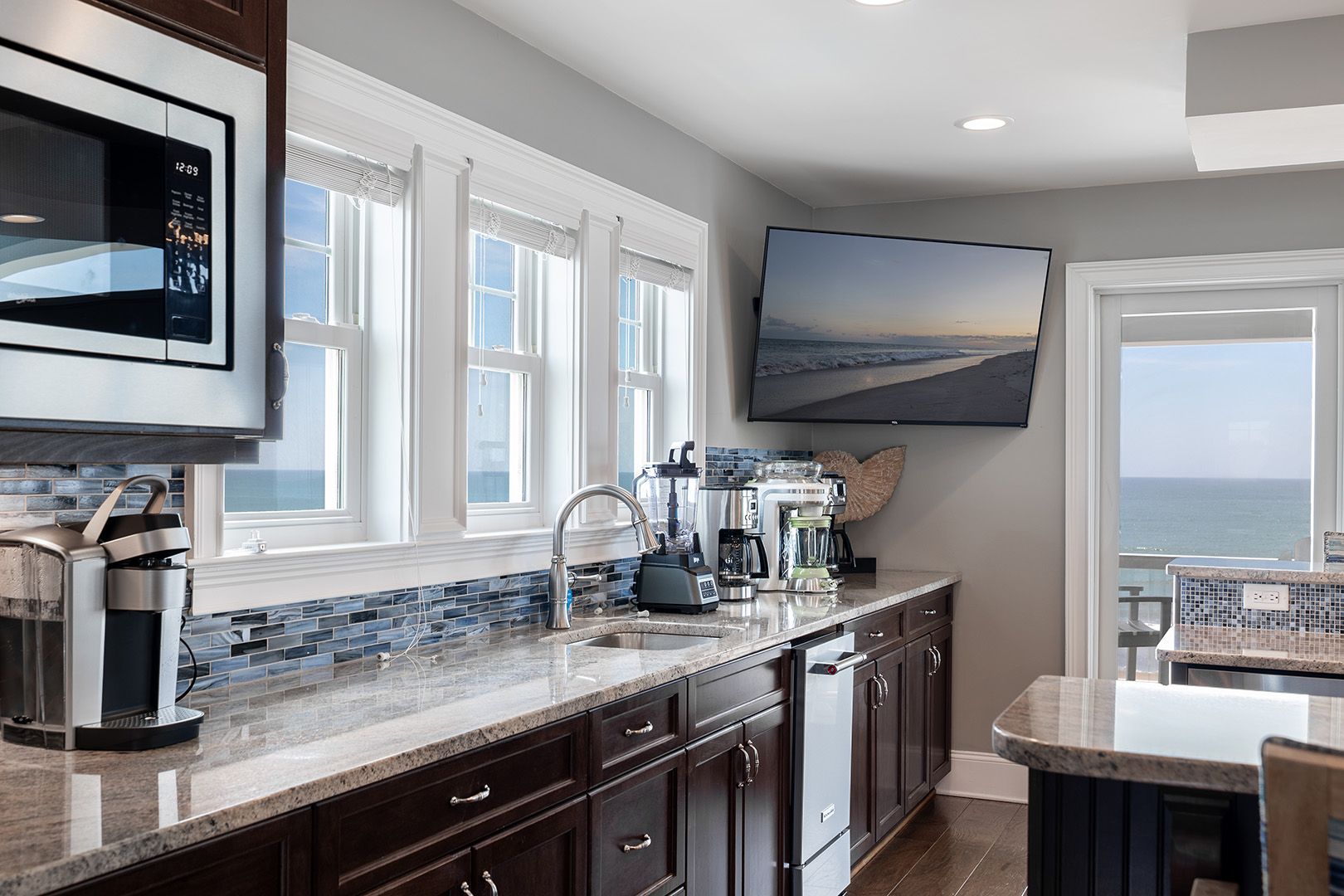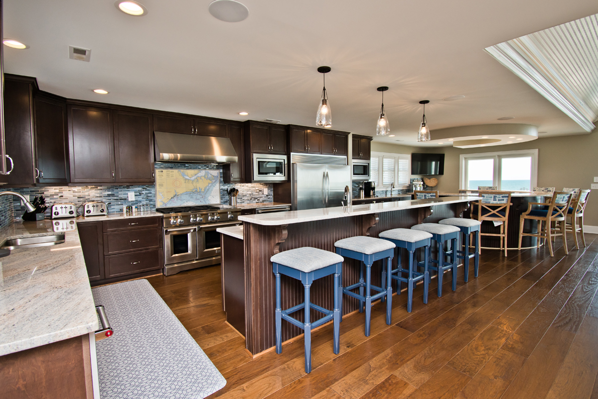 The top level is truly the crown jewel - perfect for hosting, dining, and soaking in panoramic ocean views. The chef’s kitchen is fully equipped with two refrigerators, two ovens, three microwaves, three dishwashers, and dual sinks, making large-group meals effortless. Gather around the dining table that seats 25, or enjoy drinks and conversation at the horseshoe bar with wet bar, ice maker, beverage cooler, and wine cooler.