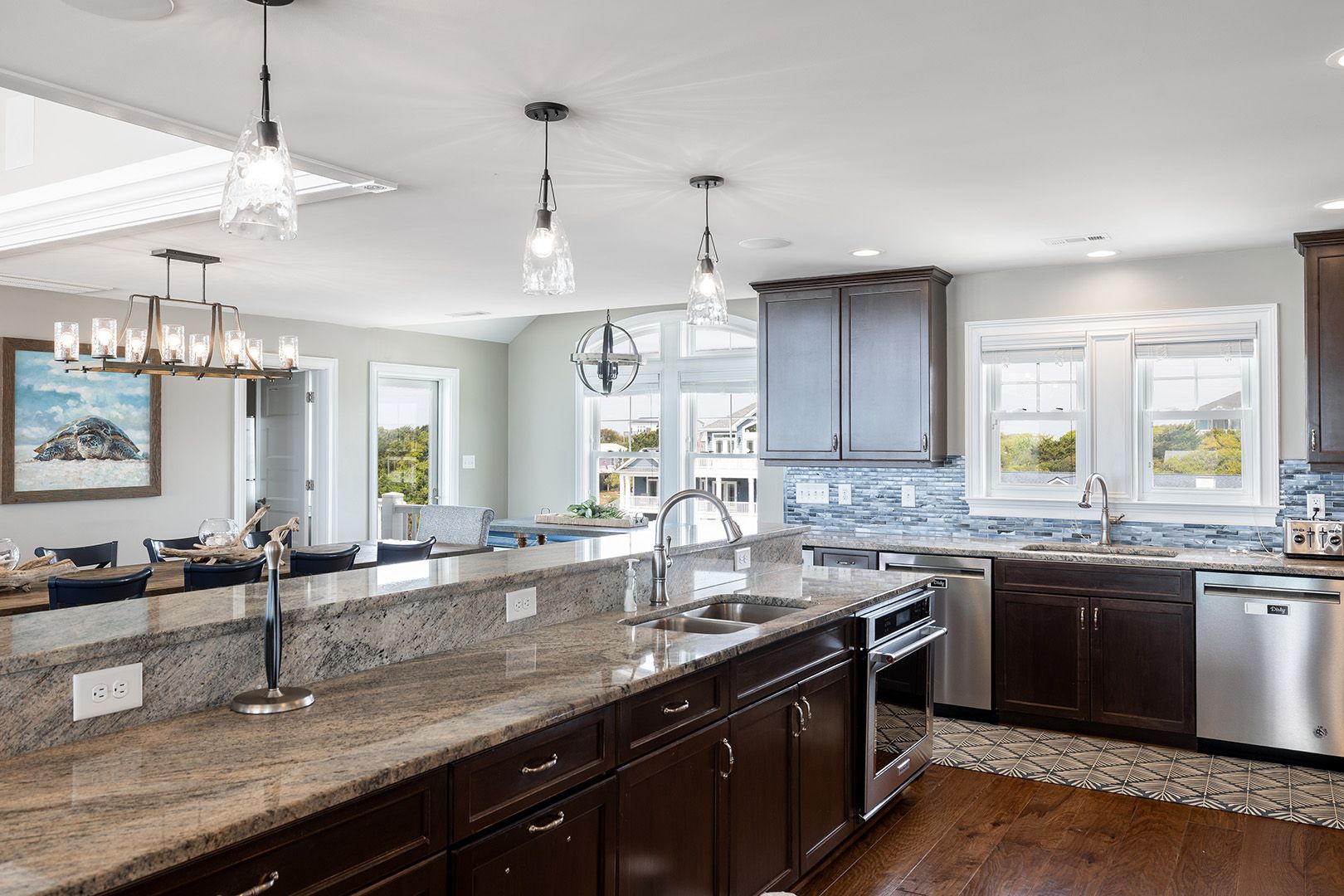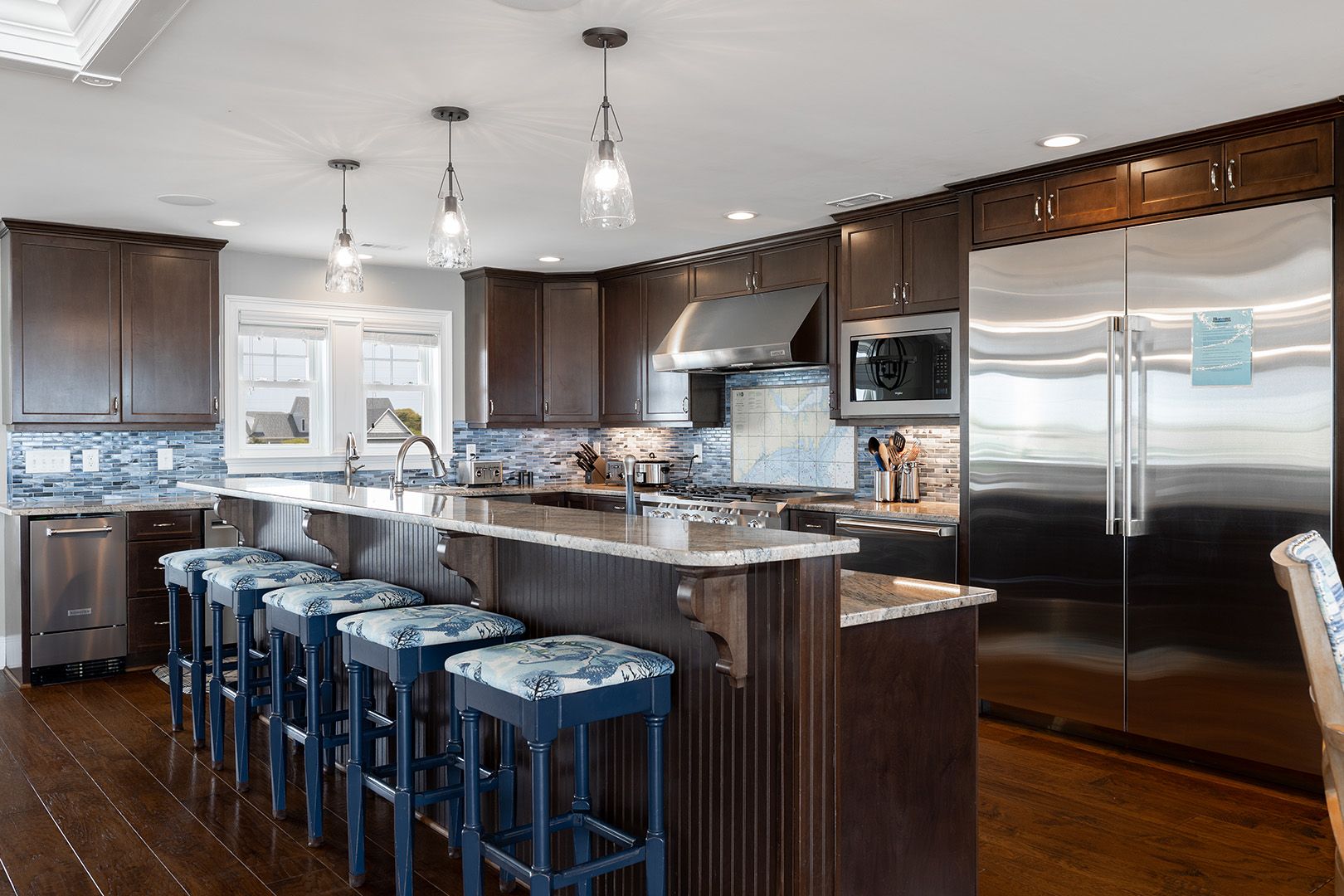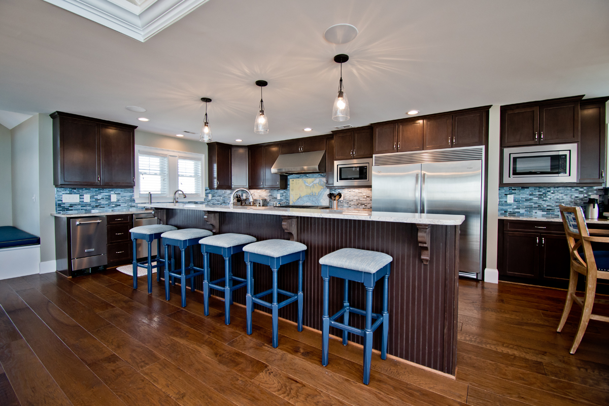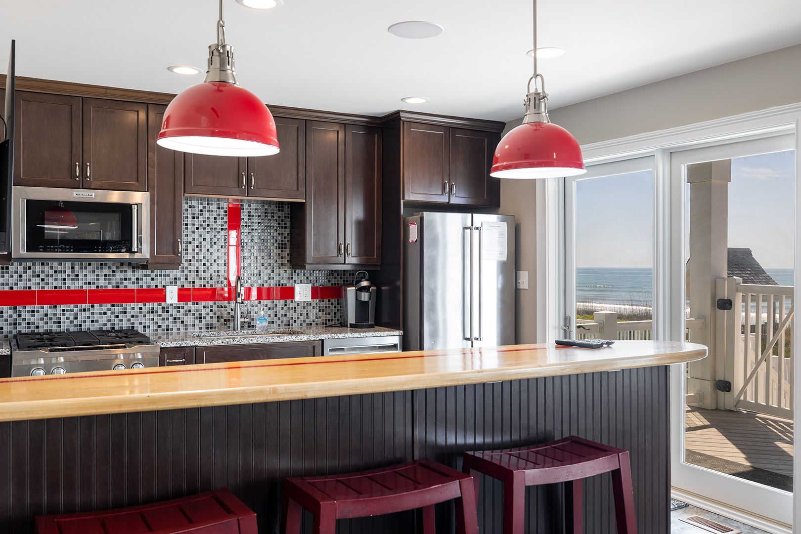 The top level is truly the crown jewel - perfect for hosting, dining, and soaking in panoramic ocean views. The chef’s kitchen is fully equipped with two refrigerators, two ovens, three microwaves, three dishwashers, and dual sinks, making large-group meals effortless. Gather around the dining table that seats 25, or enjoy drinks and conversation at the horseshoe bar with wet bar, ice maker, beverage cooler, and wine cooler.