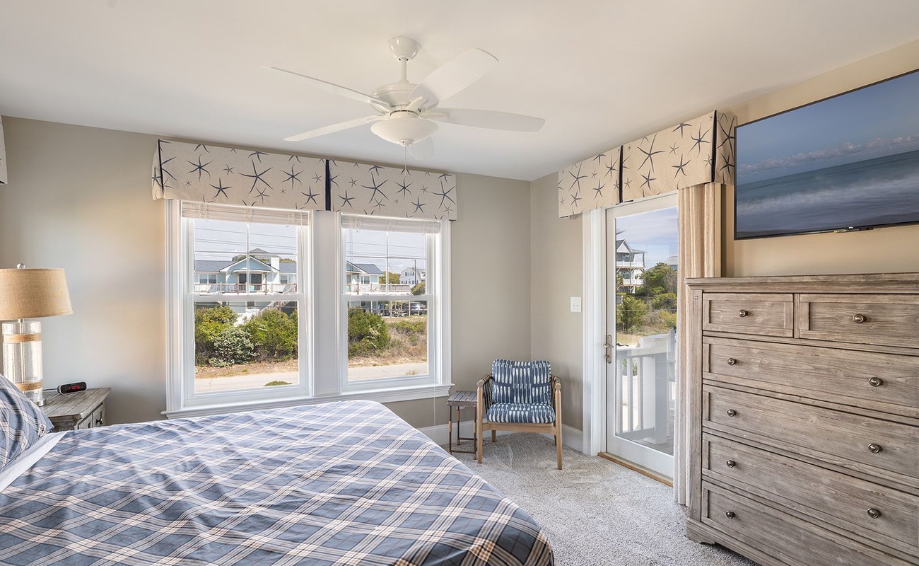 • Bedroom #2: A streetside King Master featuring balcony access, a private bath, and TV - perfect for quiet mornings or winding down in comfort.