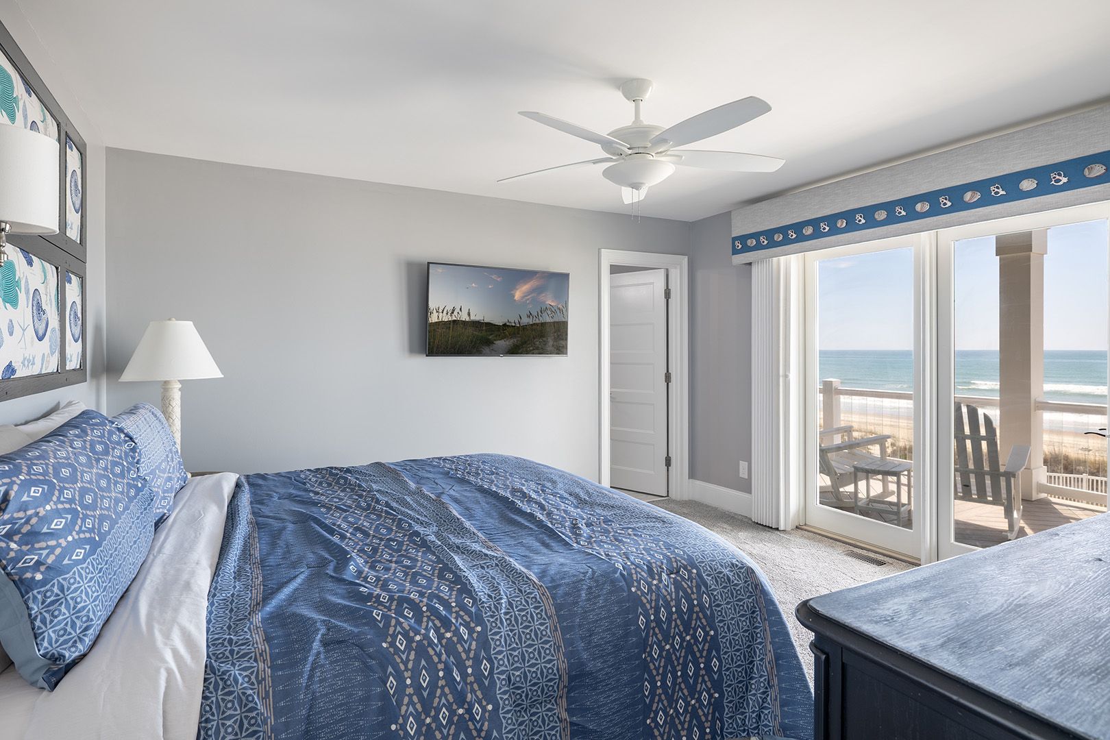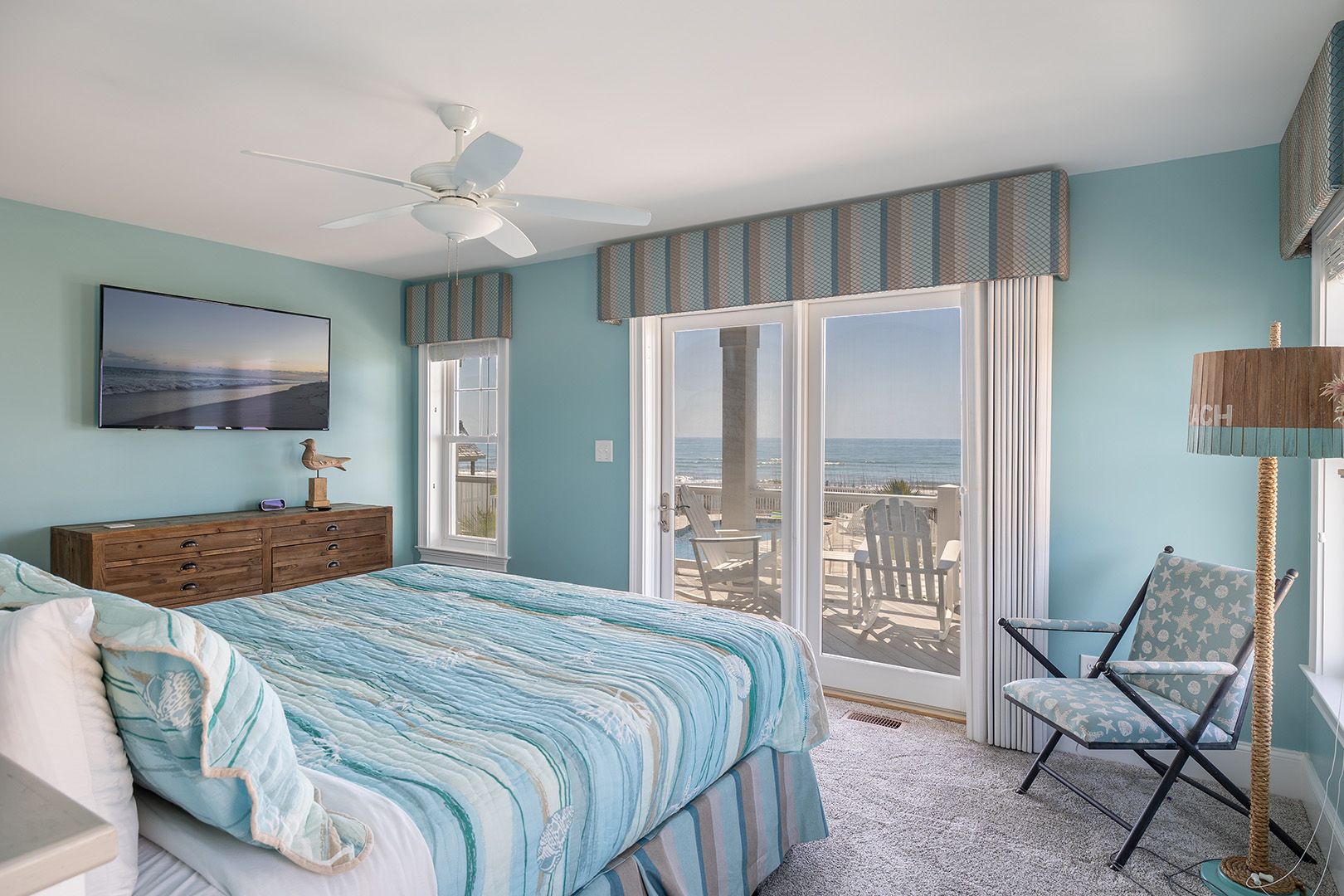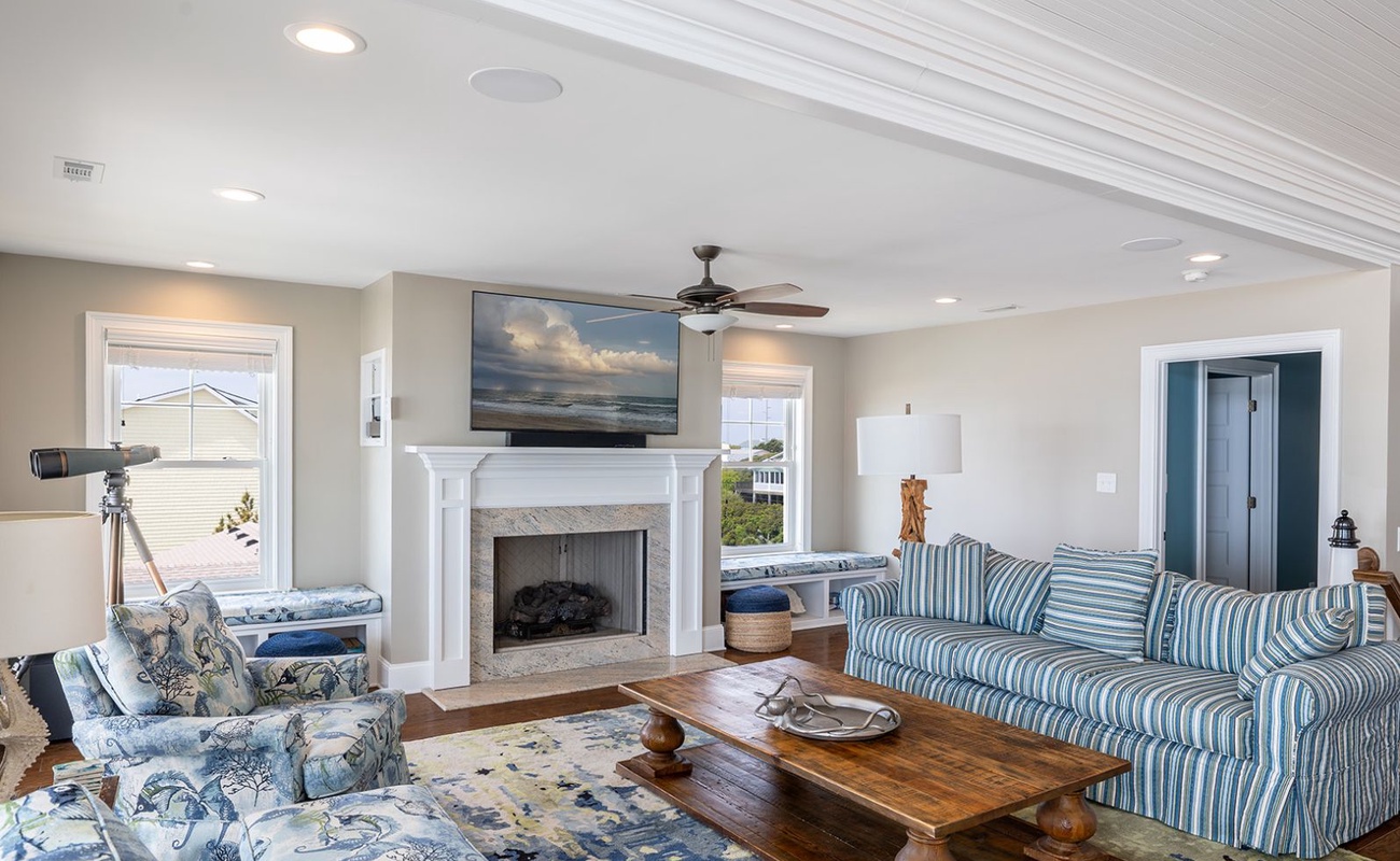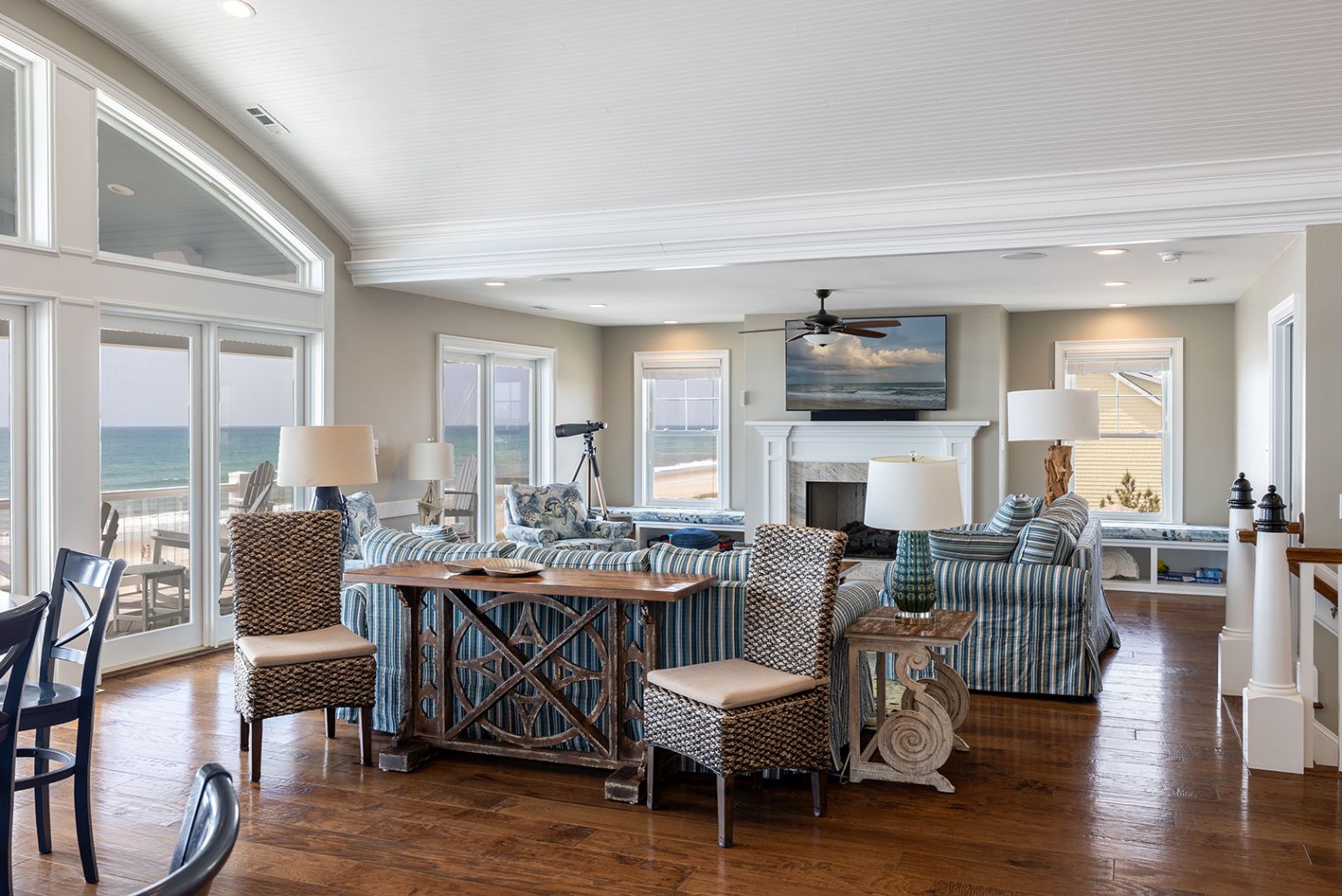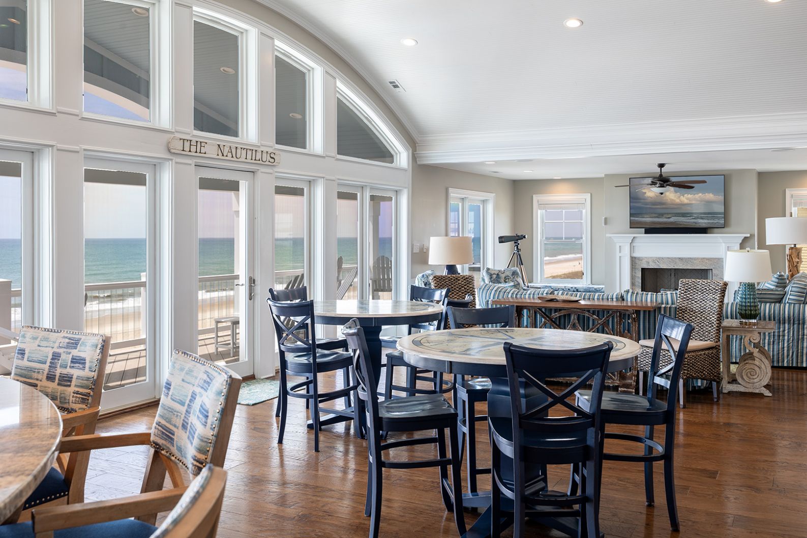 The open living room features soaring barn ceilings, comfortable seating for 10, and a large flat-screen TV - all framed by breathtaking Atlantic views. Beautifully decorated and well-maintained, The Nautilus features updated, stylish furnishings throughout. The home feels clean, modern, and welcoming - carefully designed to balance comfort with coastal charm.