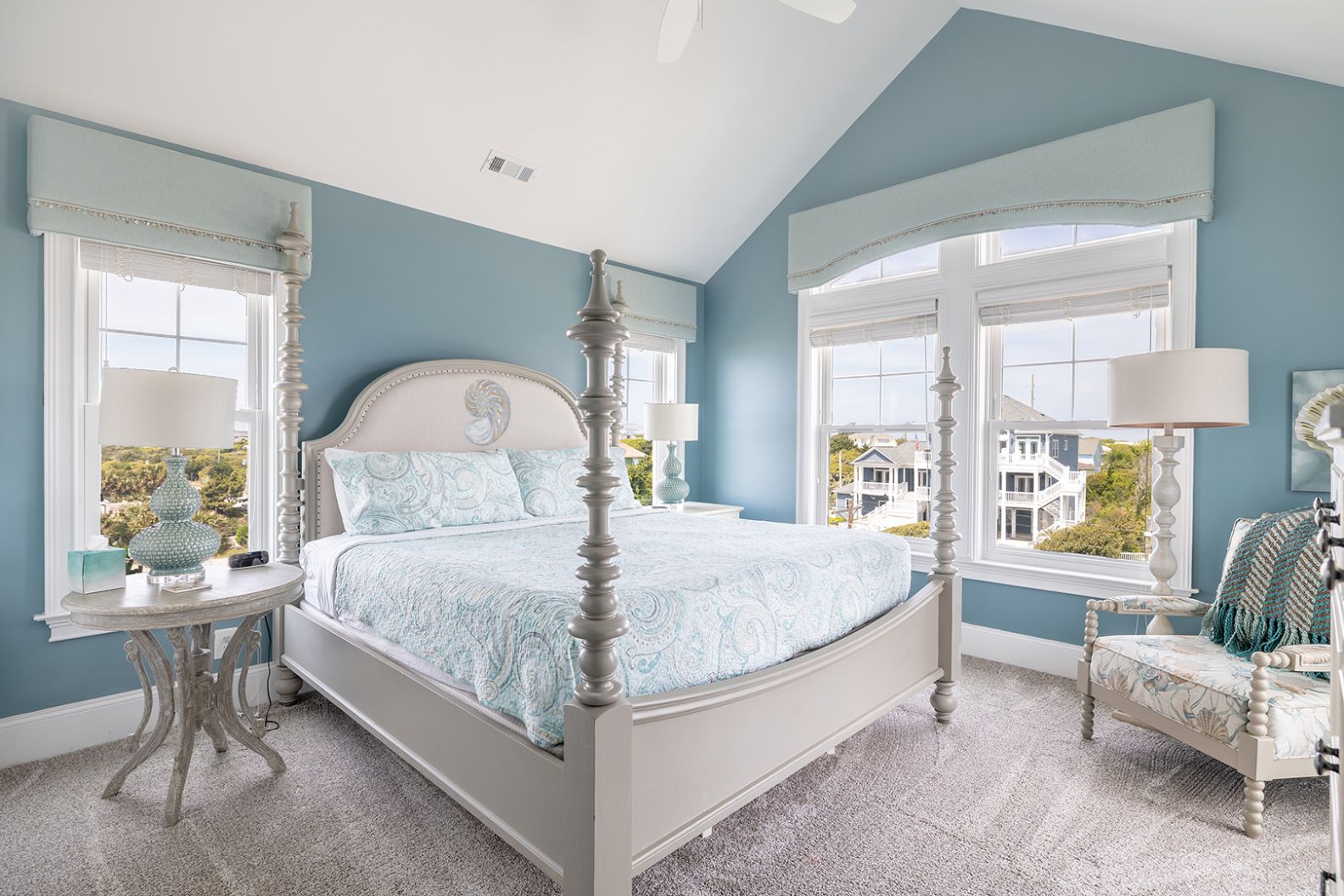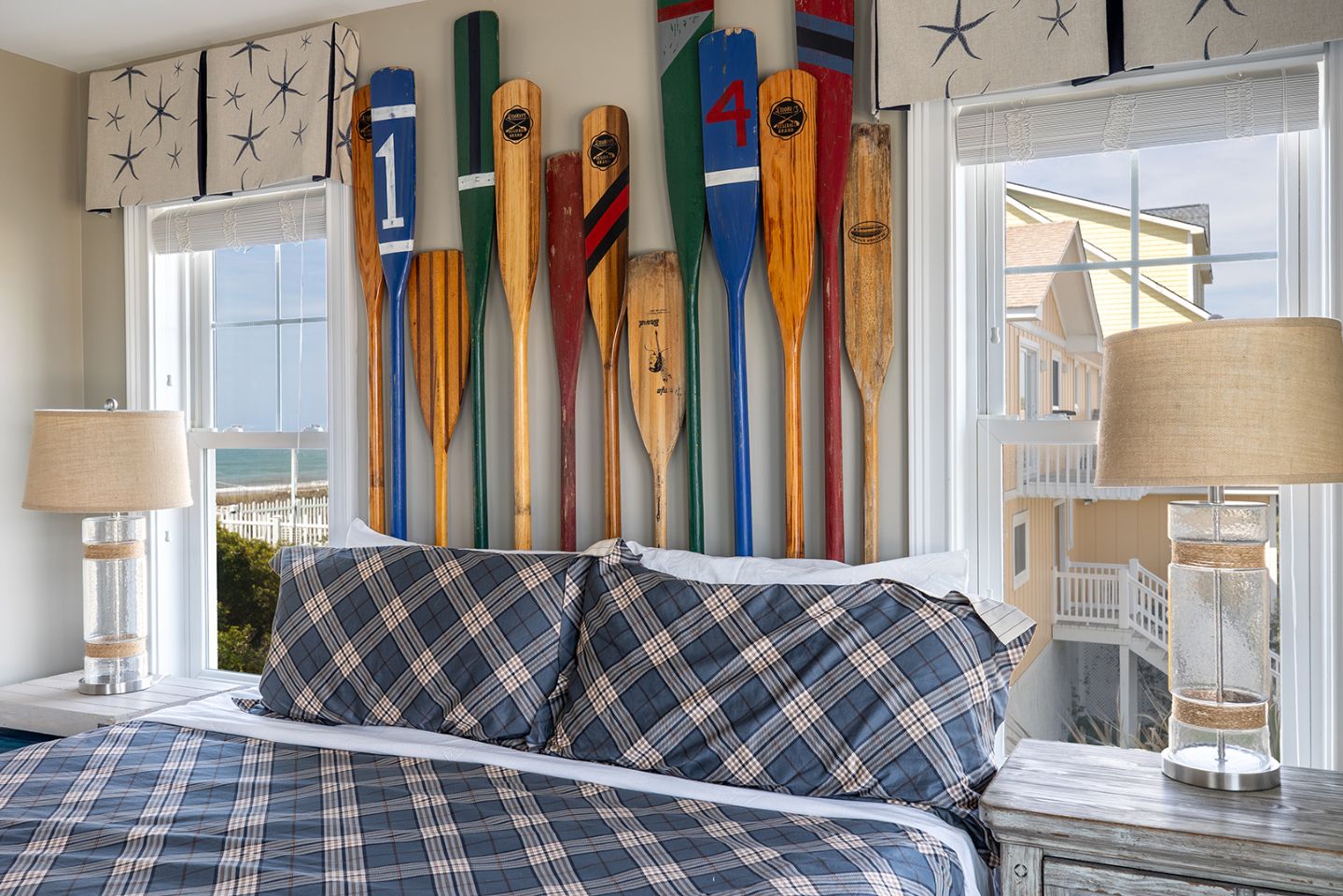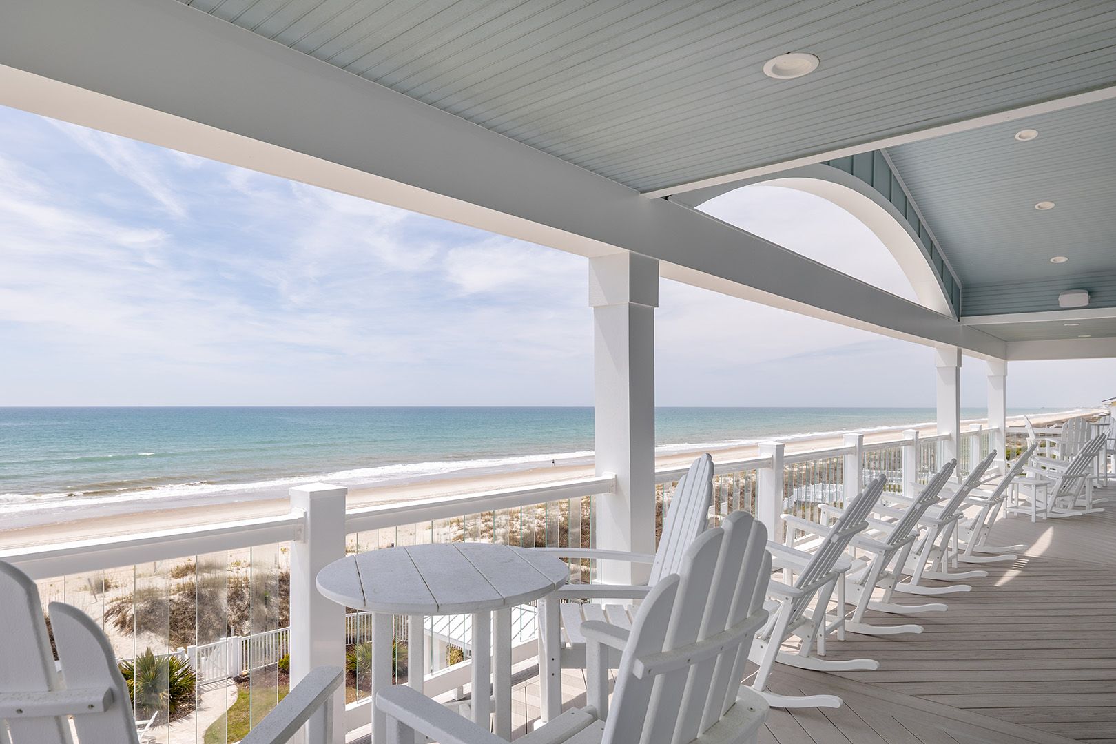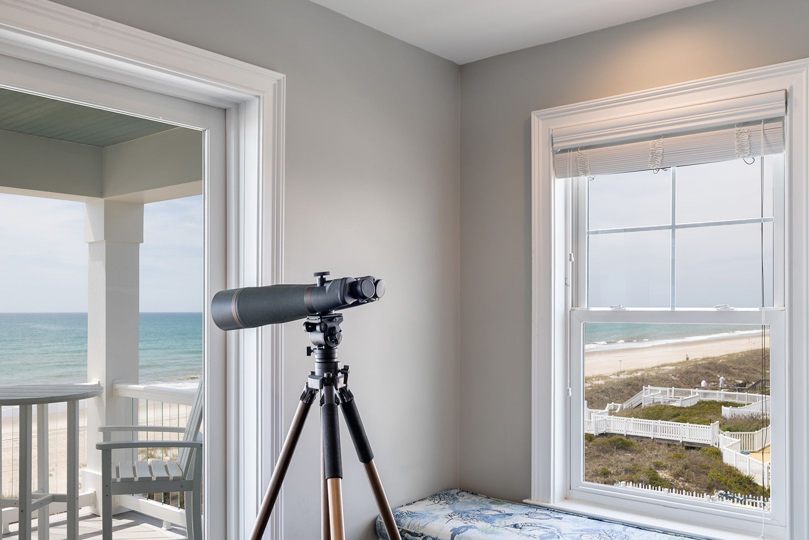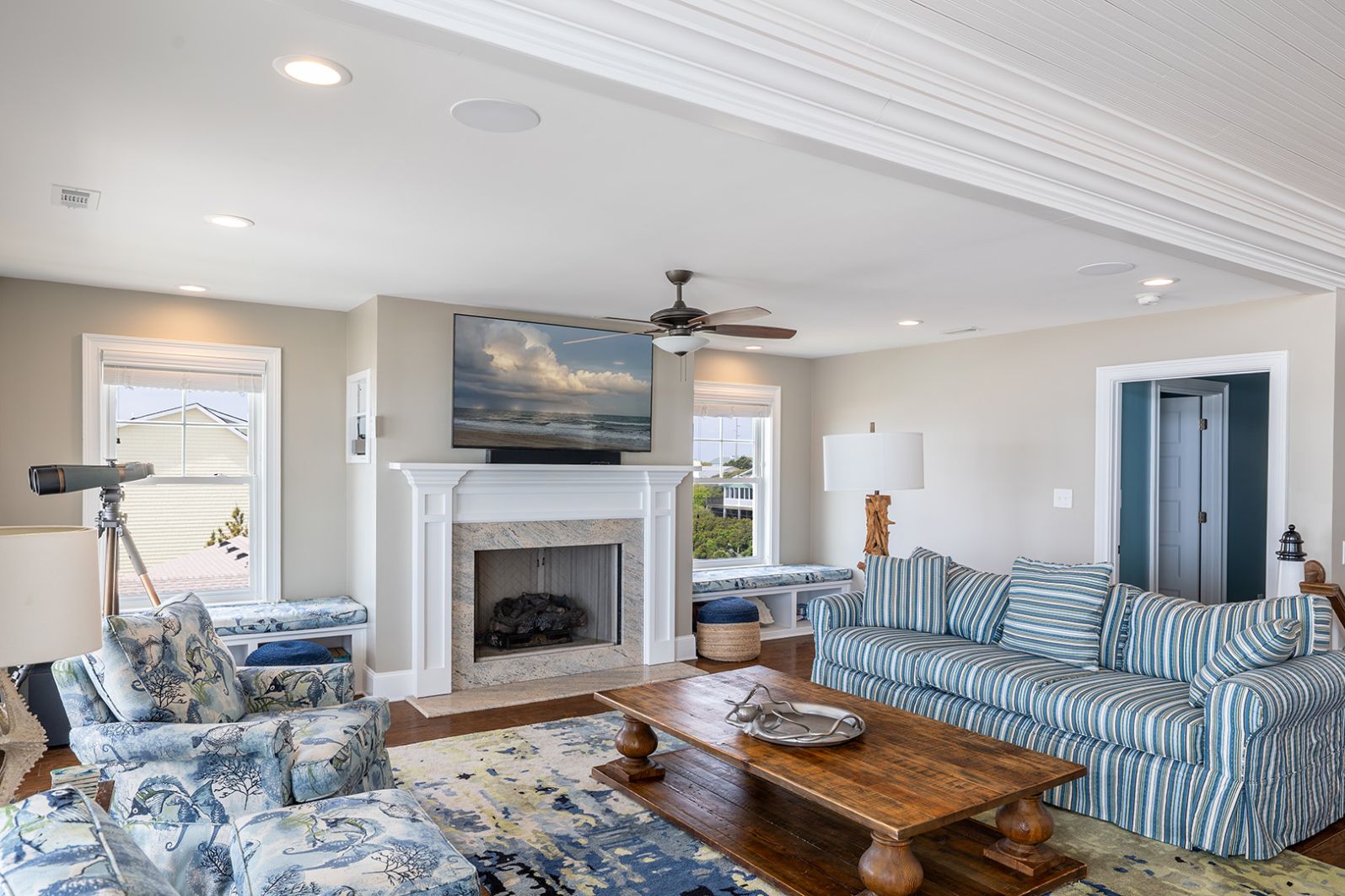 The open living room features soaring barn ceilings, comfortable seating for 10, and a large flat-screen TV - all framed by breathtaking Atlantic views. Beautifully decorated and well-maintained, The Nautilus features updated, stylish furnishings throughout. The home feels clean, modern, and welcoming - carefully designed to balance comfort with coastal charm.