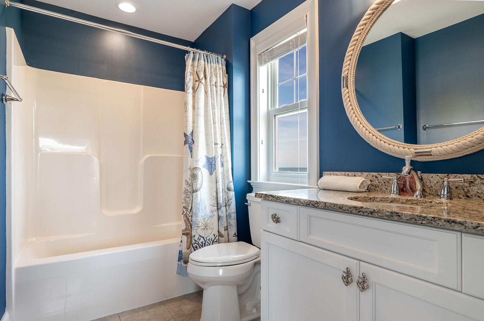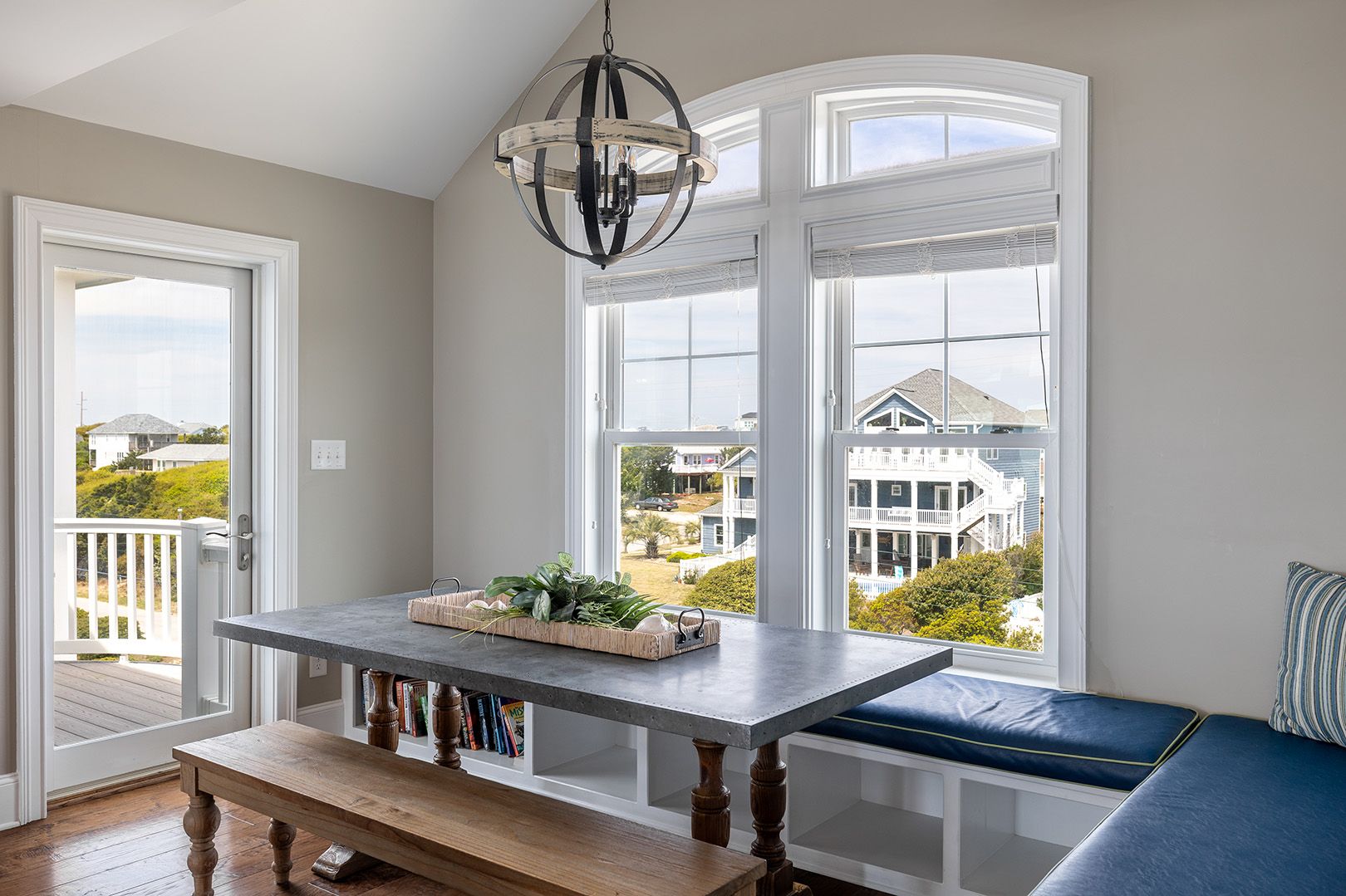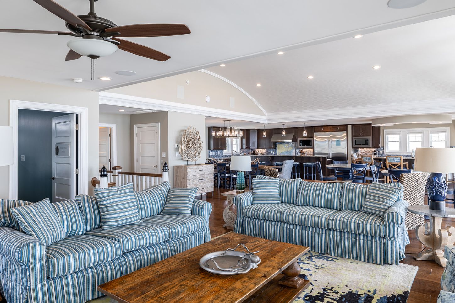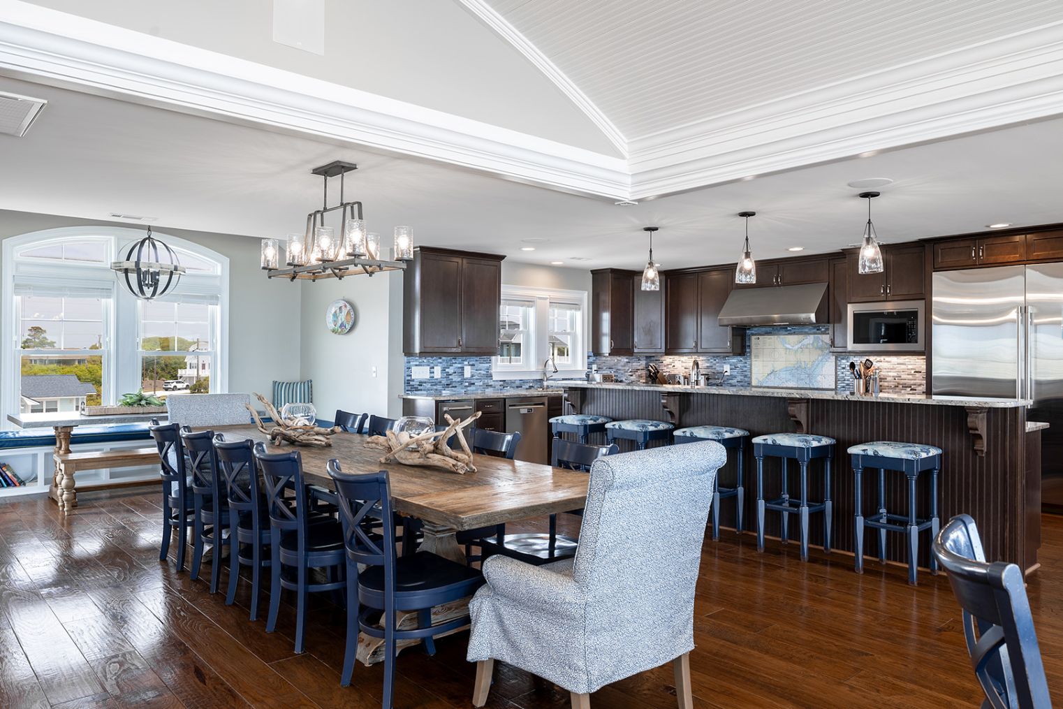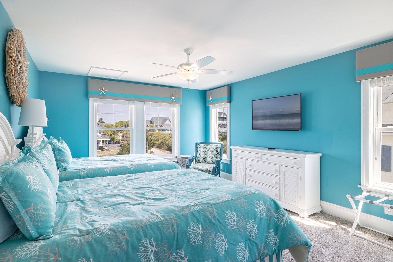 The open living room features soaring barn ceilings, comfortable seating for 10, and a large flat-screen TV - all framed by breathtaking Atlantic views. Beautifully decorated and well-maintained, The Nautilus features updated, stylish furnishings throughout. The home feels clean, modern, and welcoming - carefully designed to balance comfort with coastal charm.