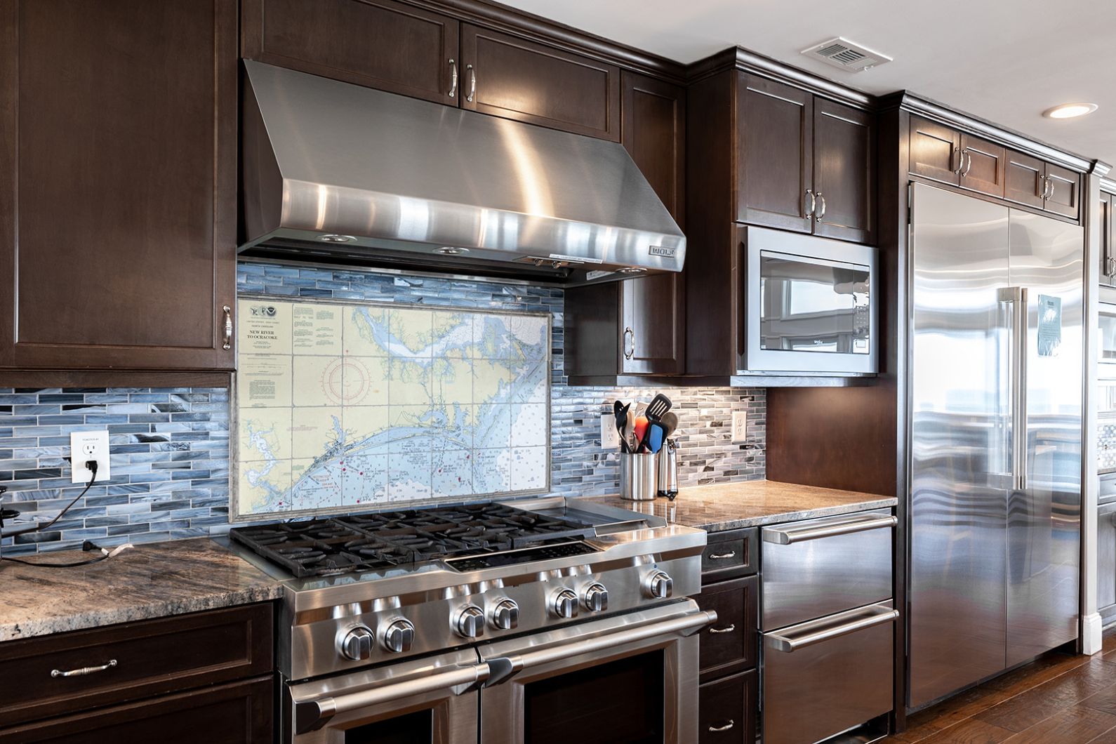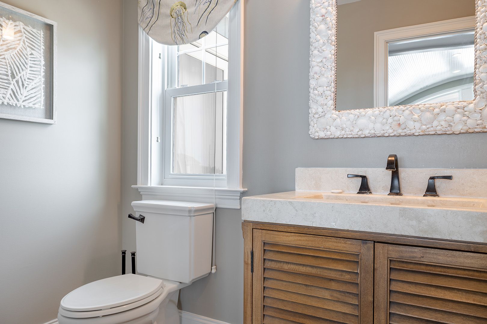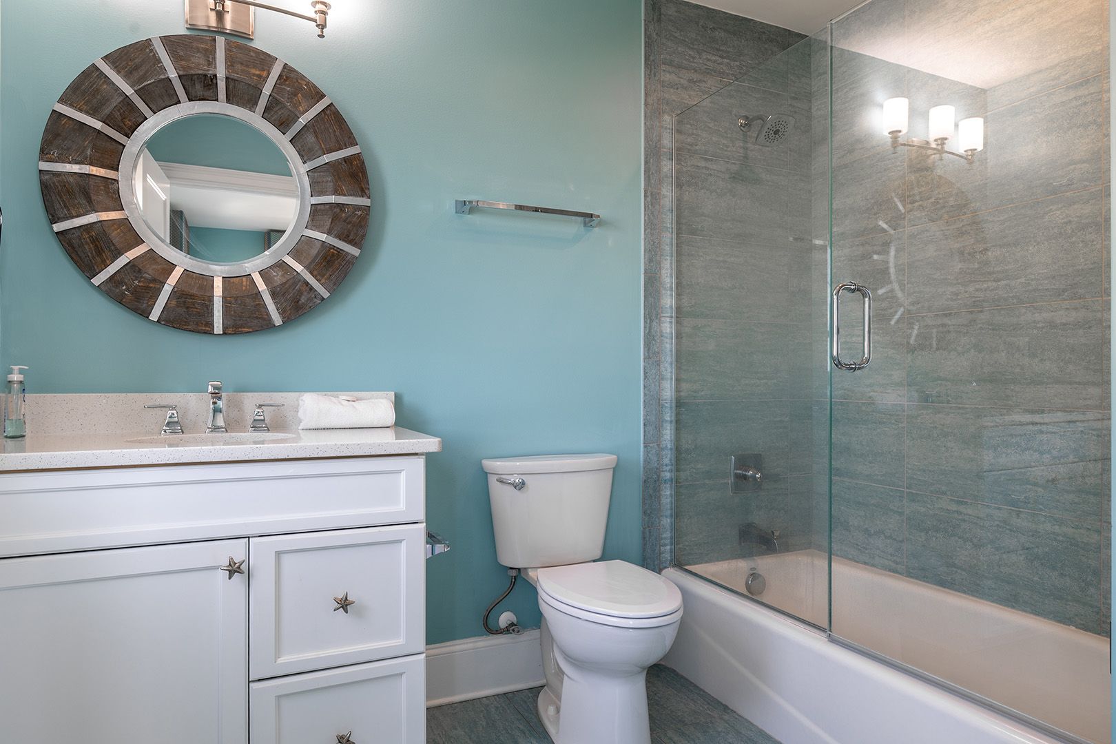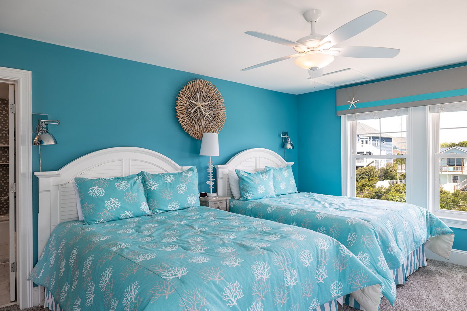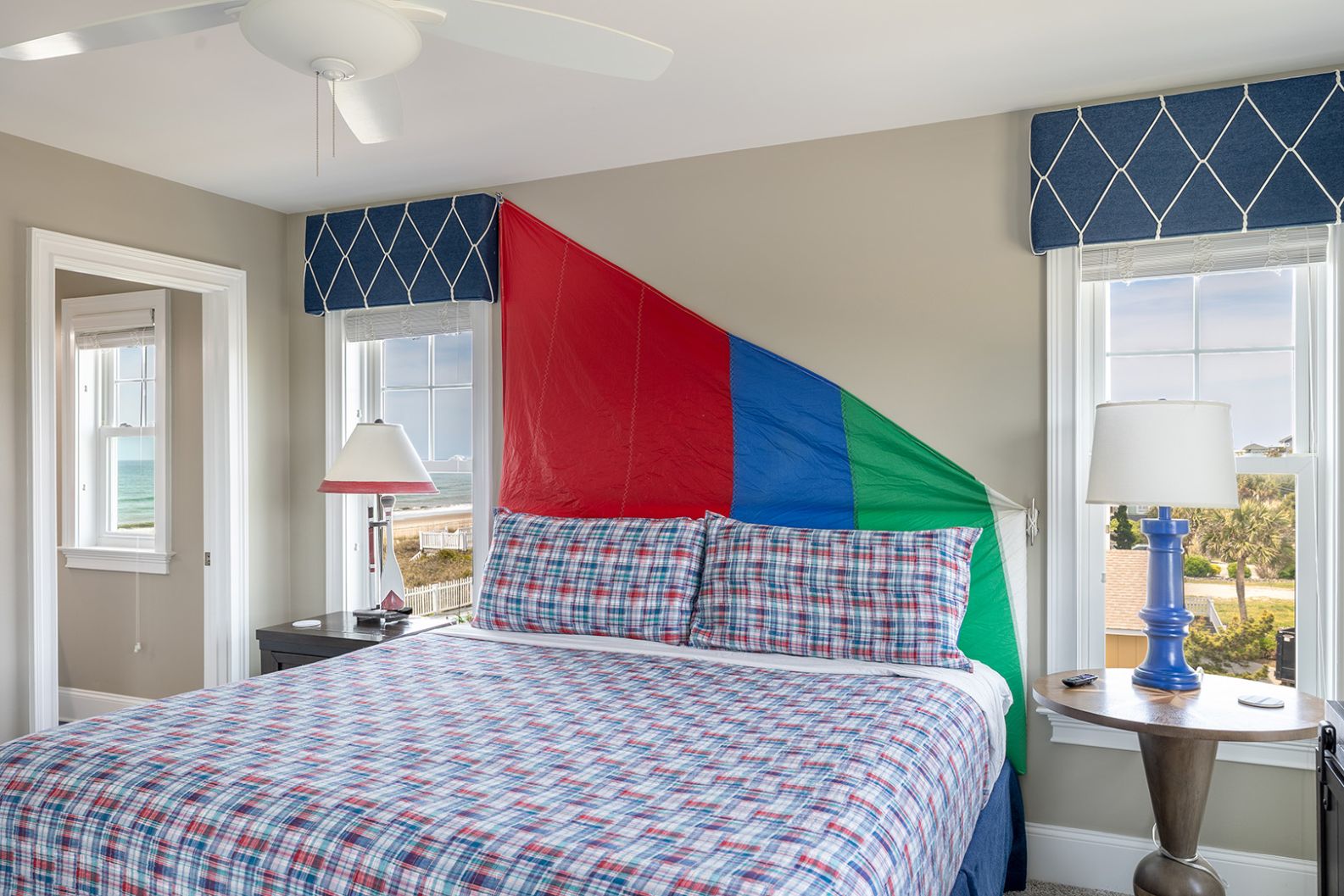 The open living room features soaring barn ceilings, comfortable seating for 10, and a large flat-screen TV - all framed by breathtaking Atlantic views. Beautifully decorated and well-maintained, The Nautilus features updated, stylish furnishings throughout. The home feels clean, modern, and welcoming - carefully designed to balance comfort with coastal charm.