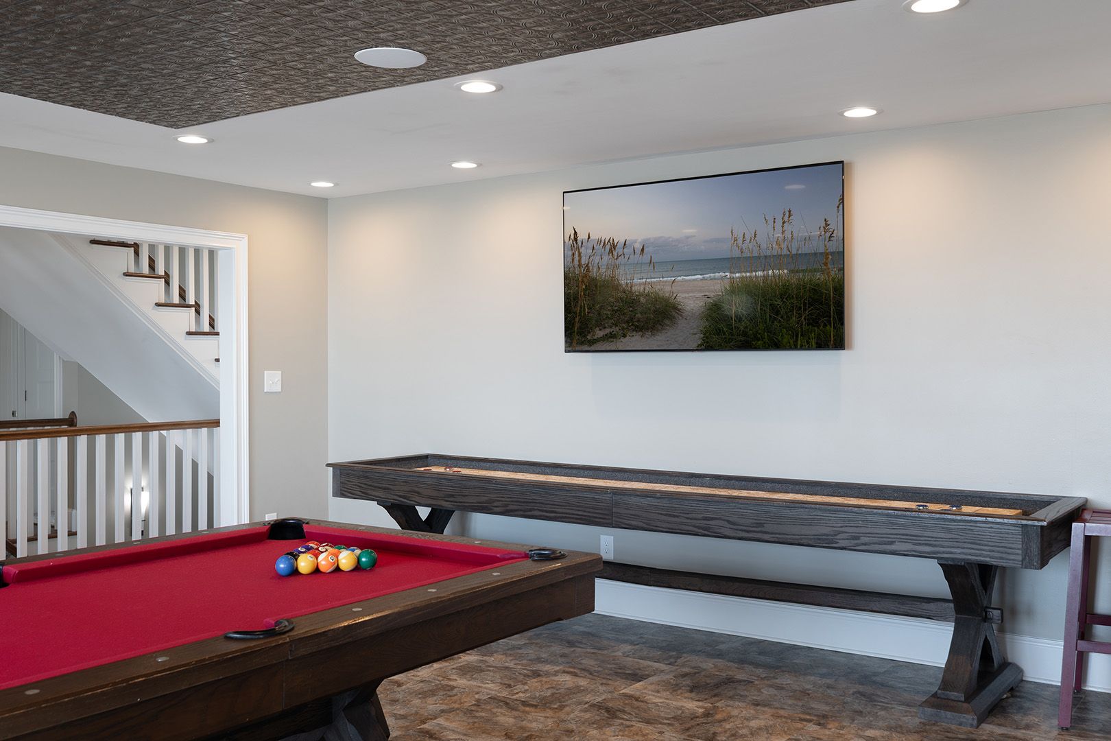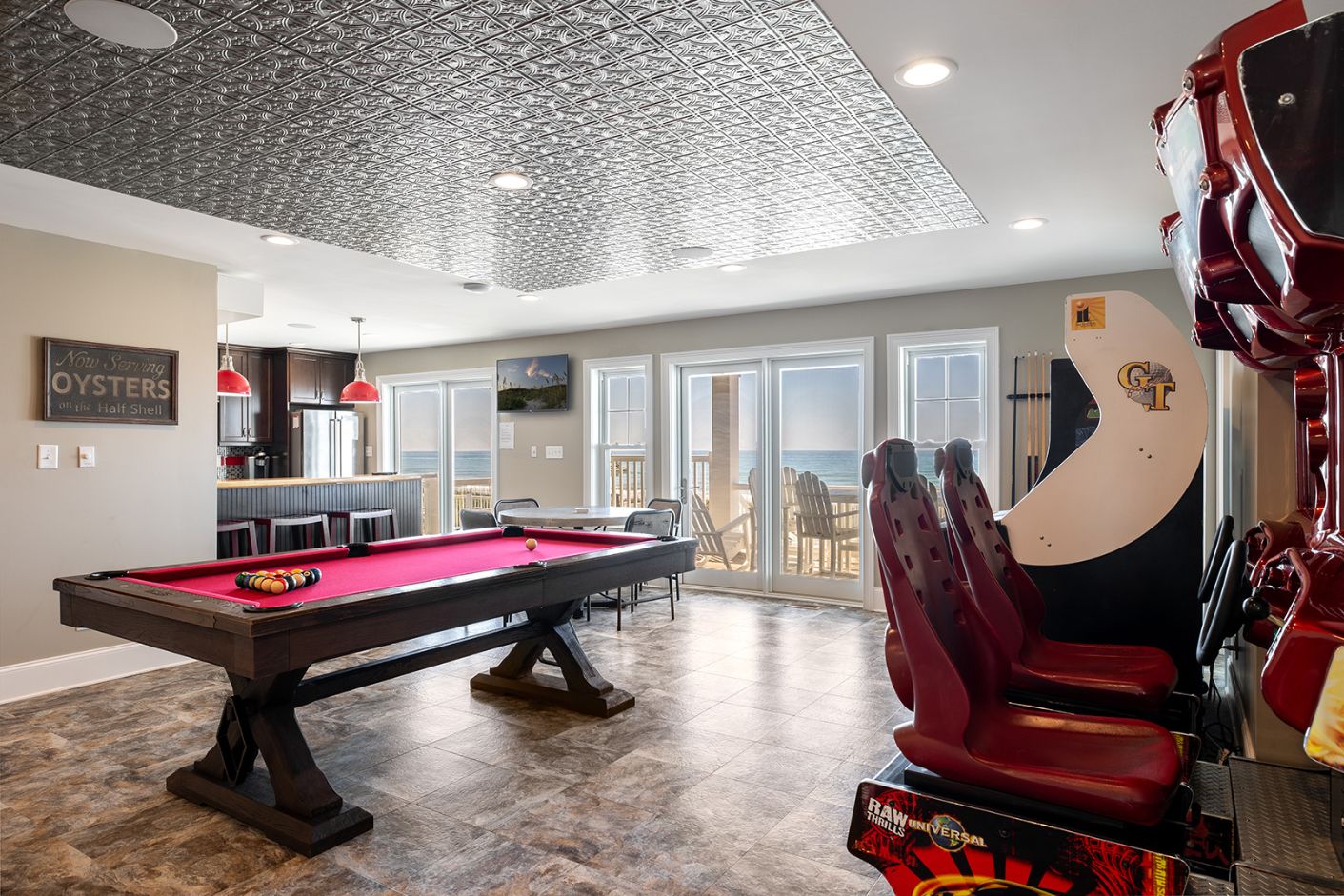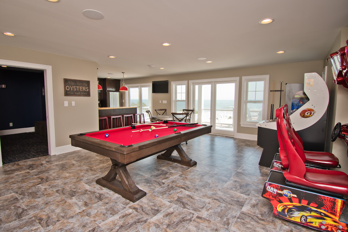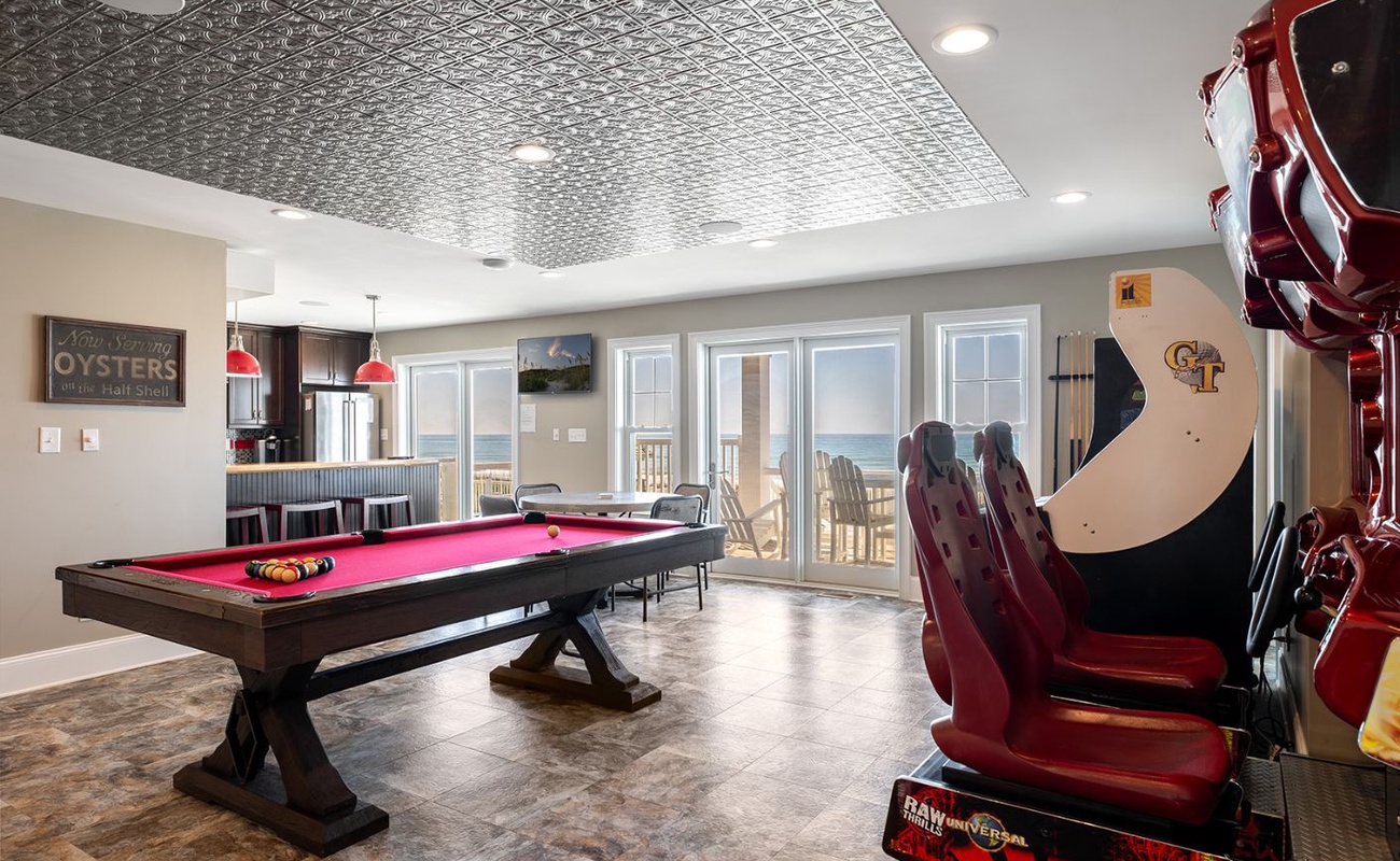 This level is a dream for fun-seekers, featuring a fully loaded game and recreation room complete with a pool table, poker table, shuffleboard, ping pong, Golden Tee arcade game, and side-by-side driving arcade games, along with three TVs. A cozy media room and a full kitchen with a surfboard bar make this space ideal for laid-back nights and lively gatherings.