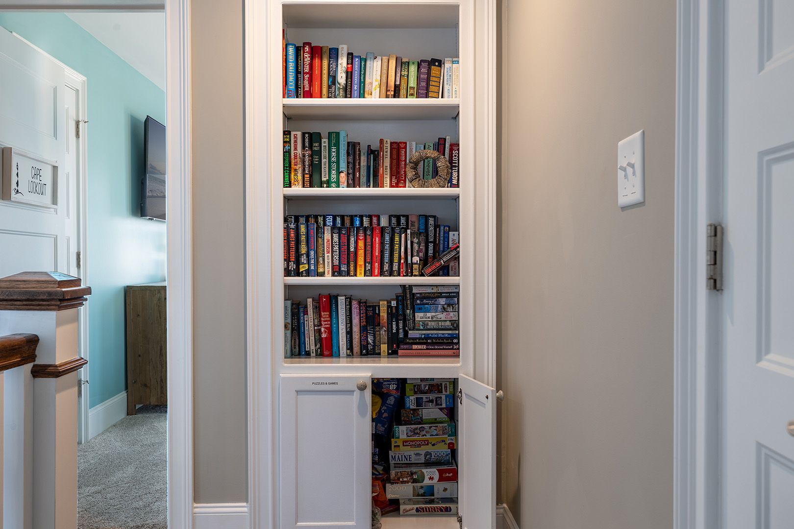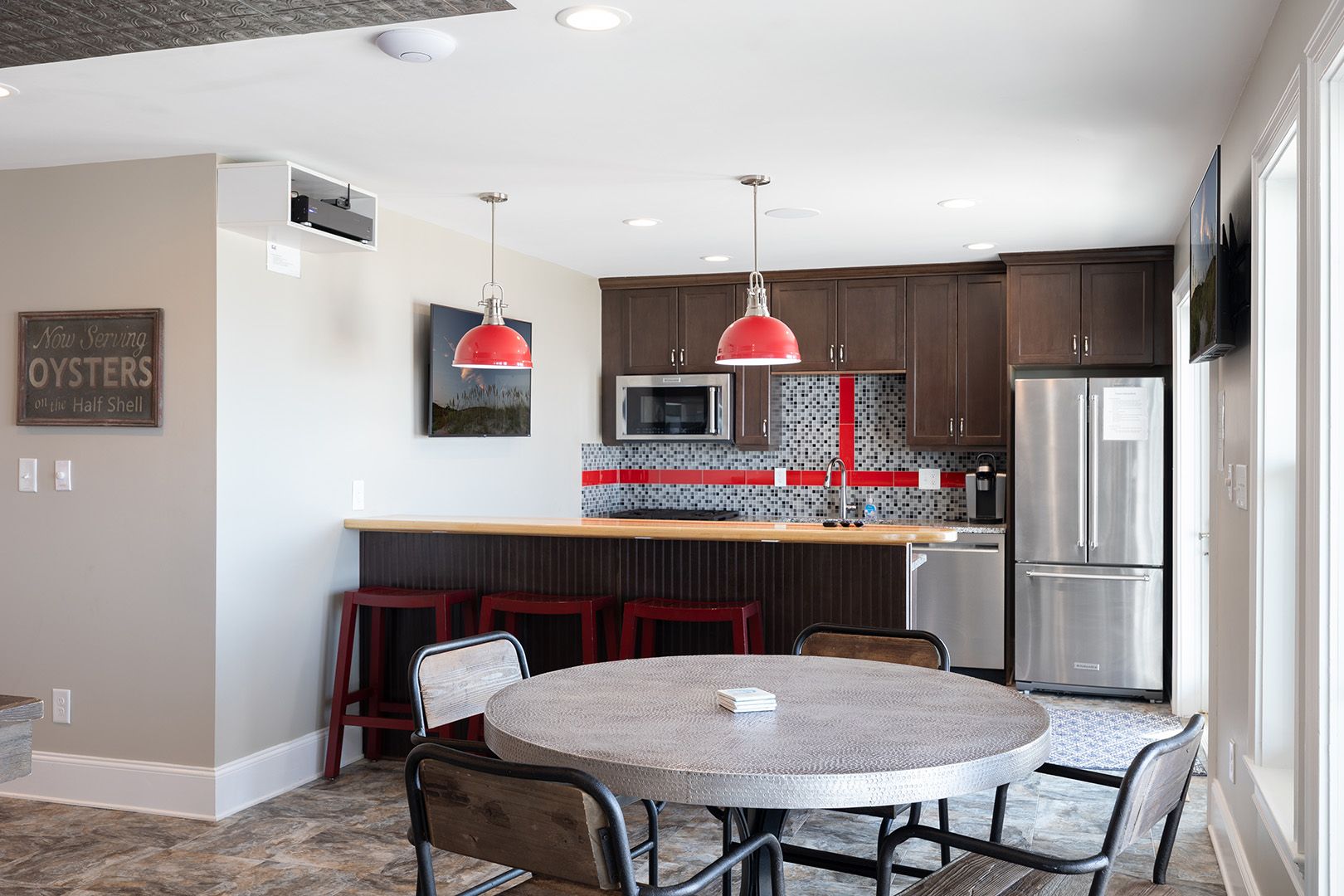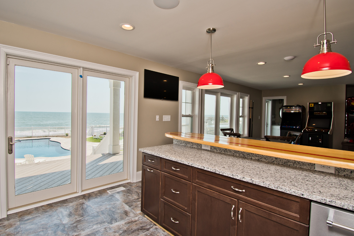 This level is a dream for fun-seekers, featuring a fully loaded game and recreation room complete with a pool table, poker table, shuffleboard, ping pong, Golden Tee arcade game, and side-by-side driving arcade games, along with three TVs. A cozy media room and a full kitchen with a surfboard bar make this space ideal for laid-back nights and lively gatherings.