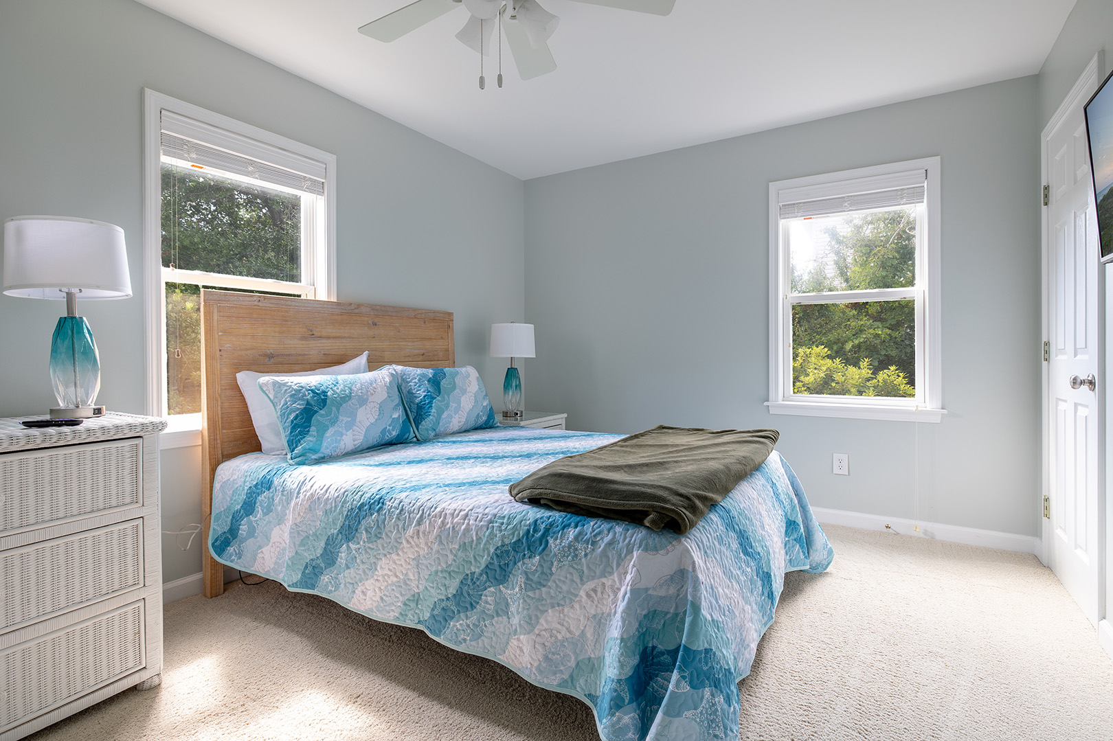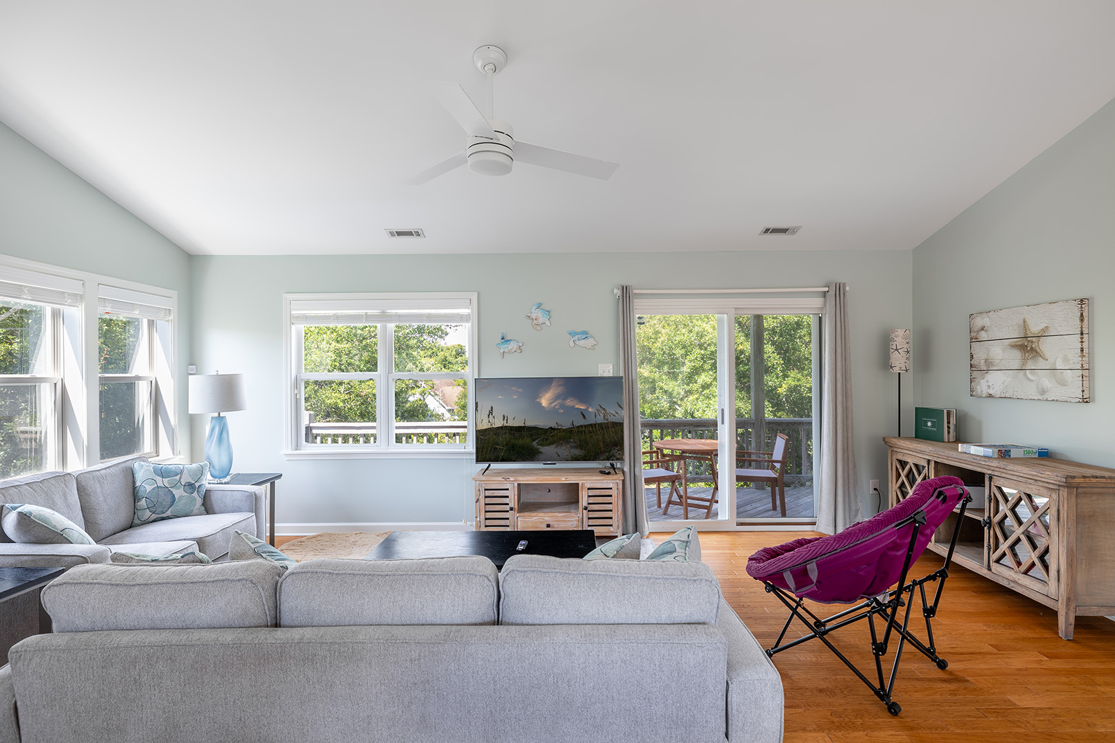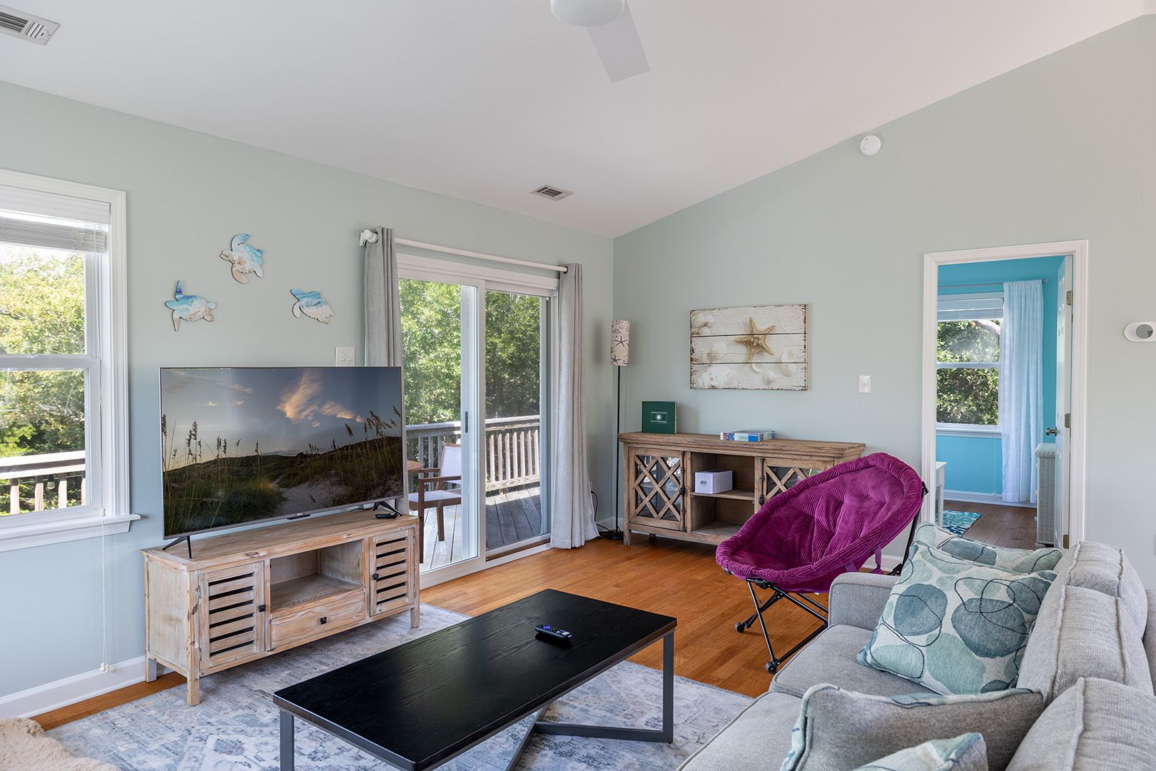Bedroom #1 with Queen Bed and Shared Bath. Bedroom #2 with Queen Bed, Shared Bath Access, and Deck Access. Bedroom #3 with Queen Bed, TV and Private Bath. Bedroom #4 with Twin/Twin Bunk Set, Shared Bath Access, and Deck Access.