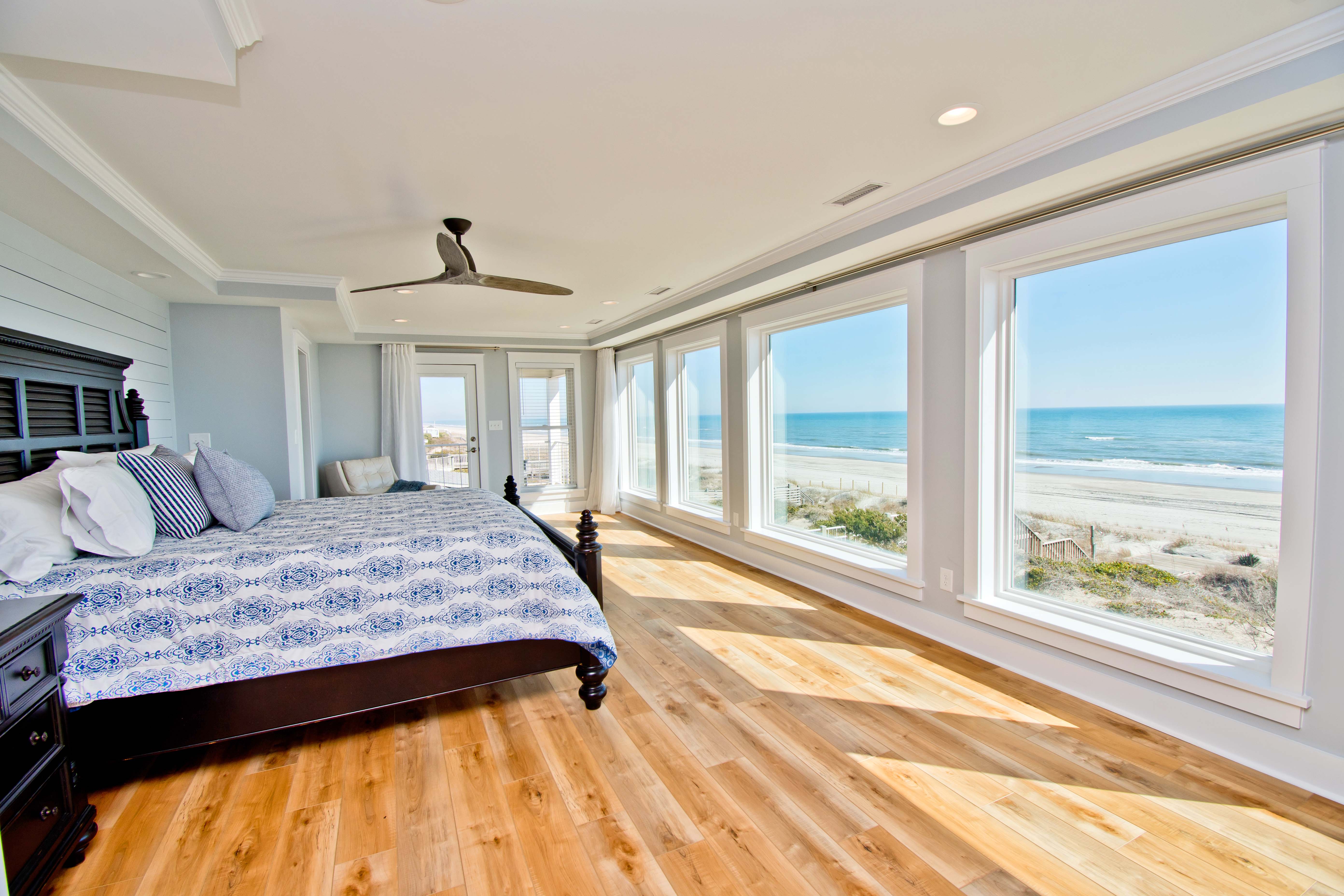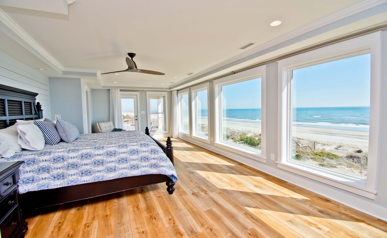 The primary bedroom is located on the second level and has a king bed, a floor-to-ceiling wall of windows overlooking the ocean, a private covered terrace, a walk-in closet, its own private bathroom with a custom oversized shower with 3 faucets, a freestanding tub, double sinks, and a seperate toilet room.