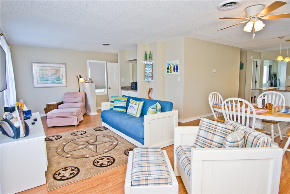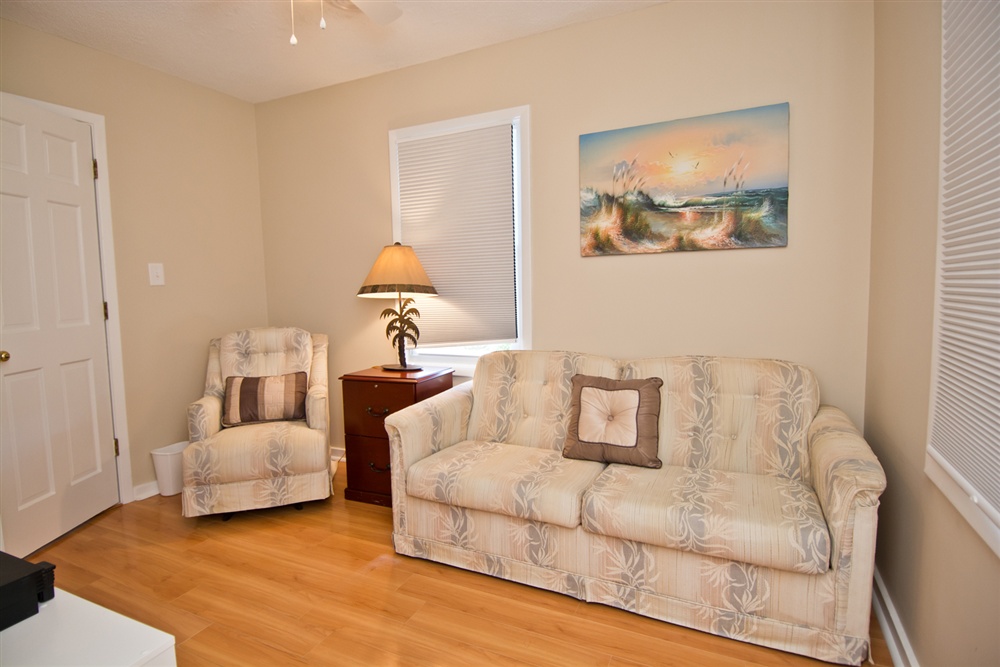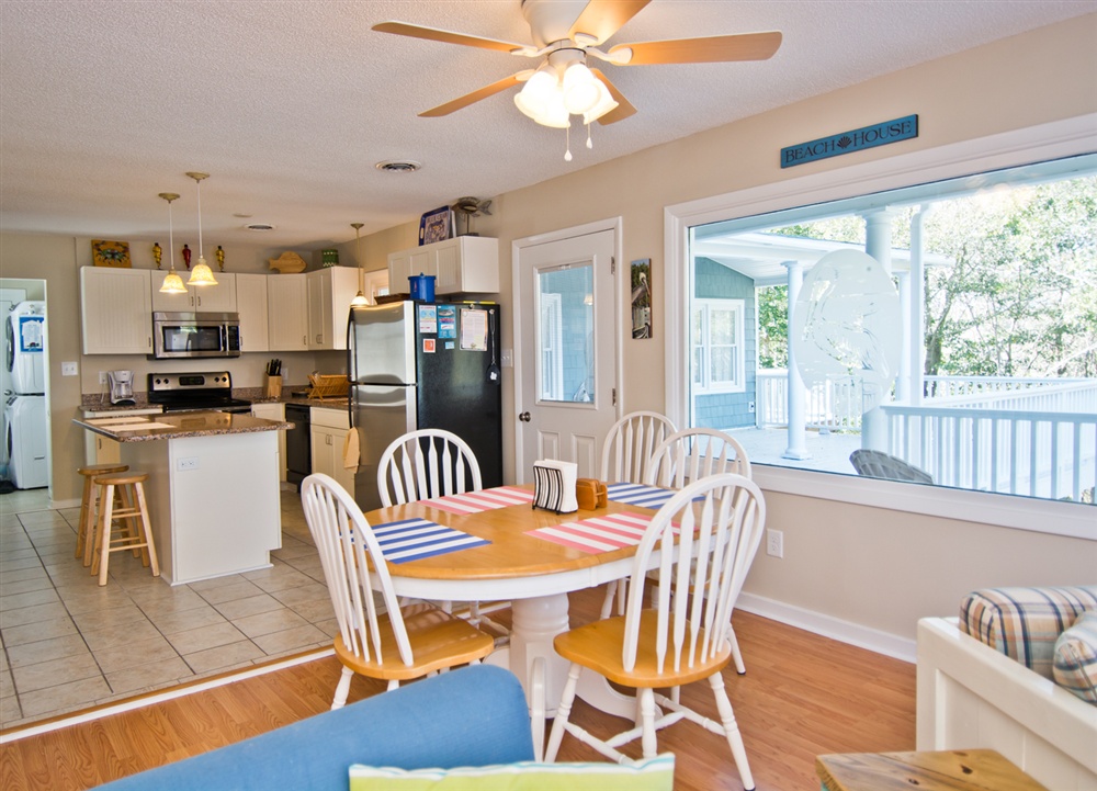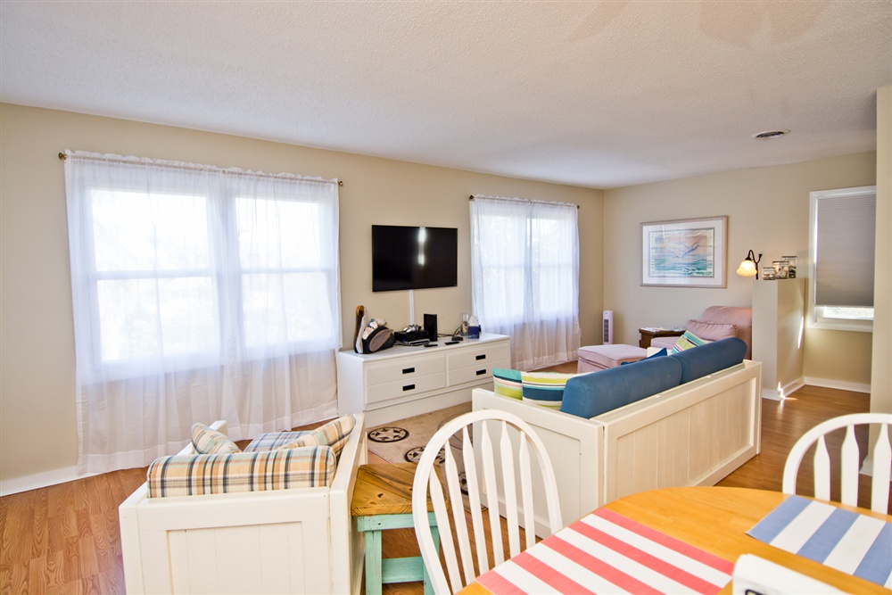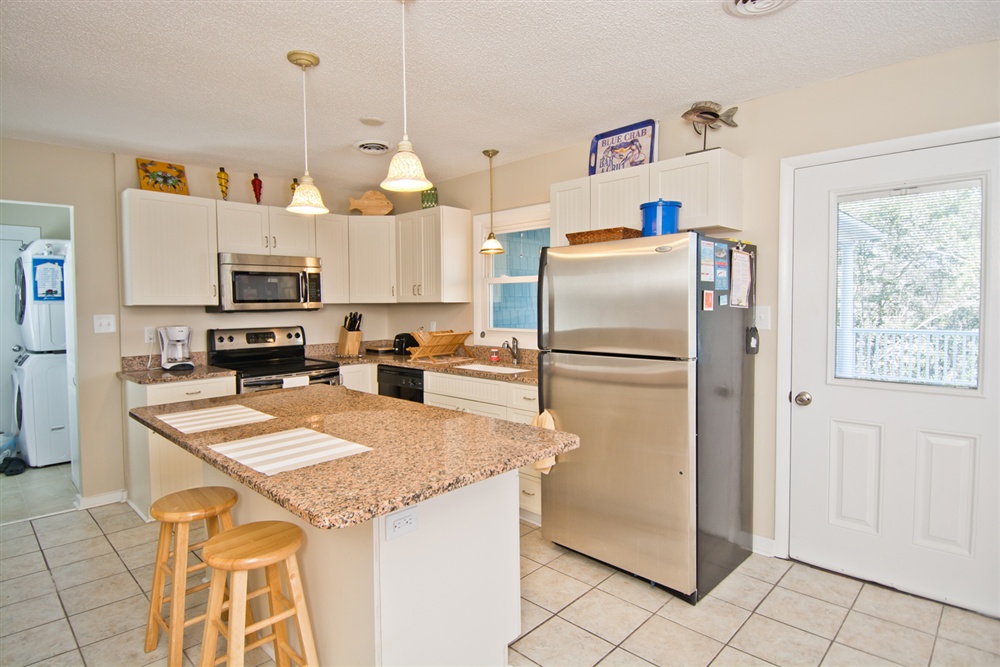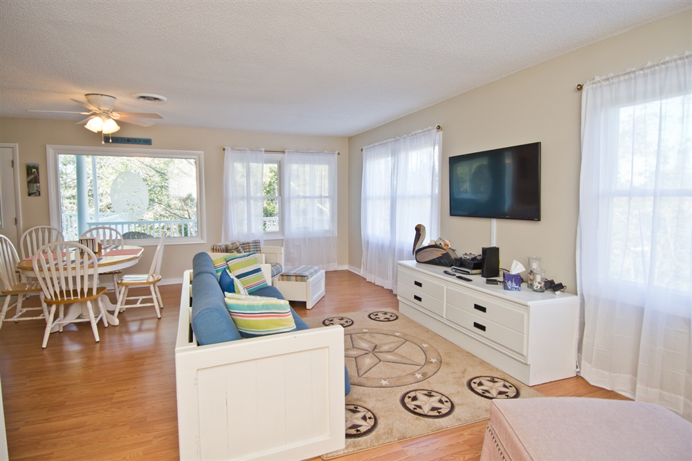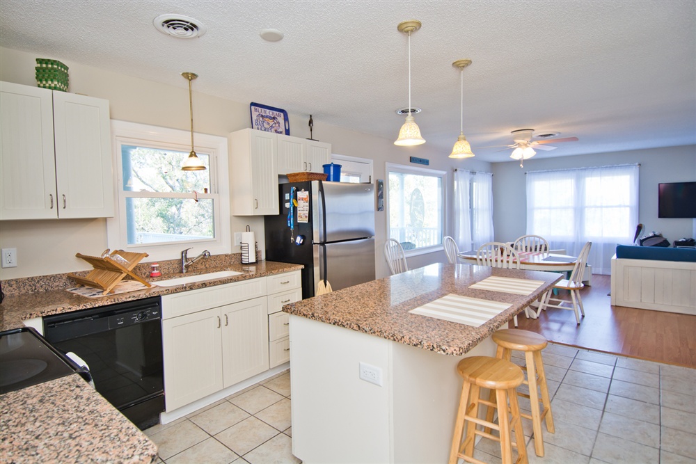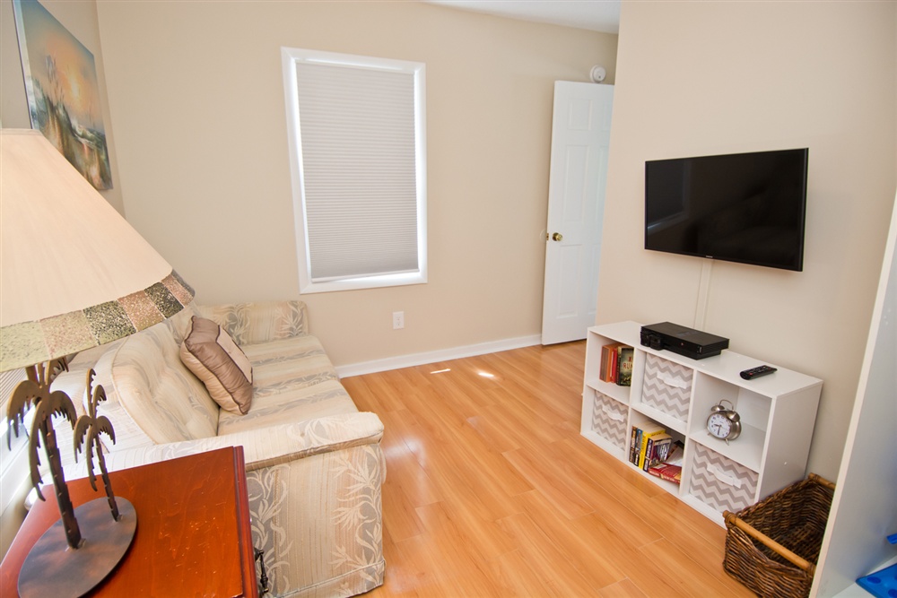 Living room has a open concept with plenty of seating and windows galore. TV, DVD Player, full bath and deck access on this level. Kitchen includes stainless steel appliances, granite counter-tops and plenty of space to prep. There is also a den on this level with a TV and DVD Player.